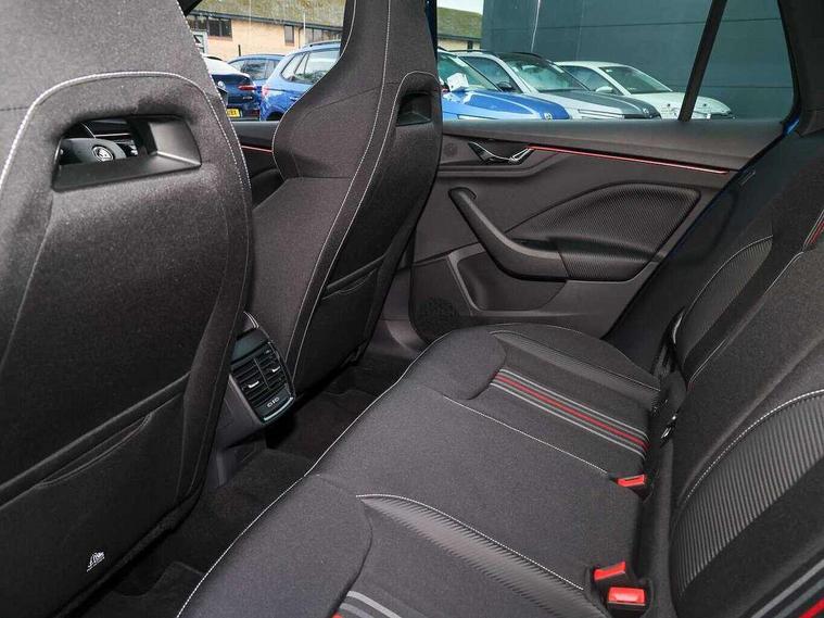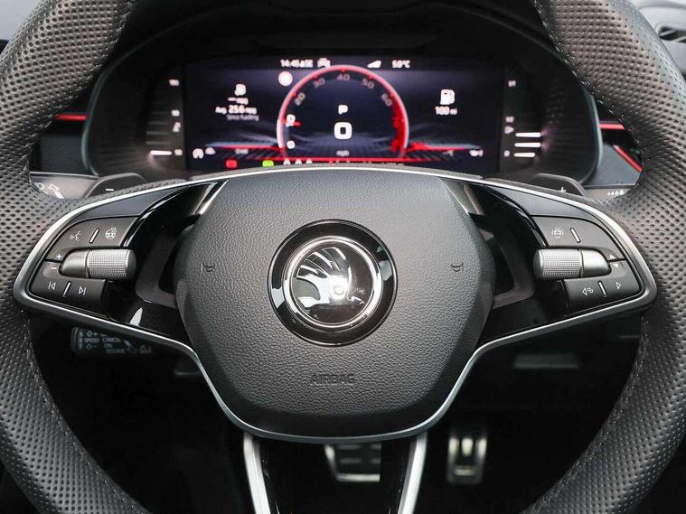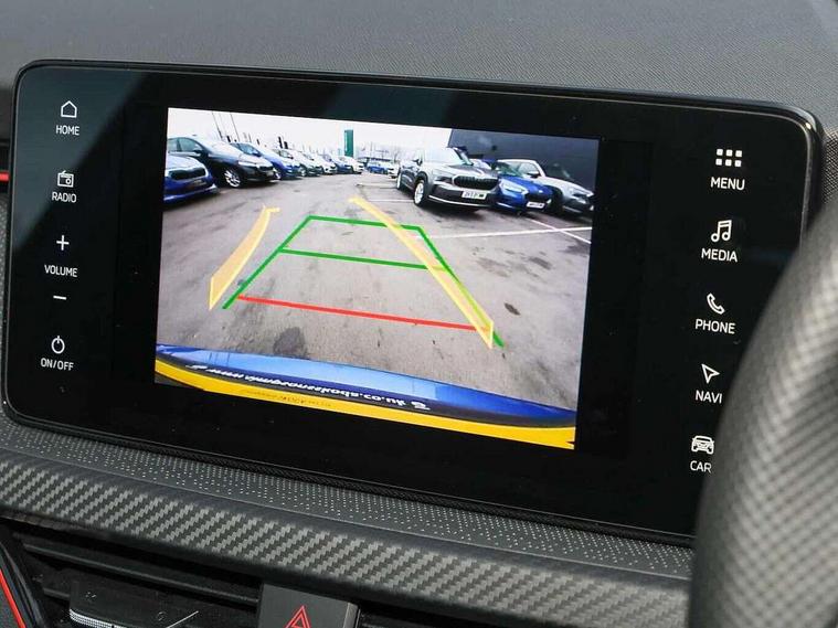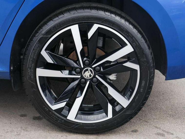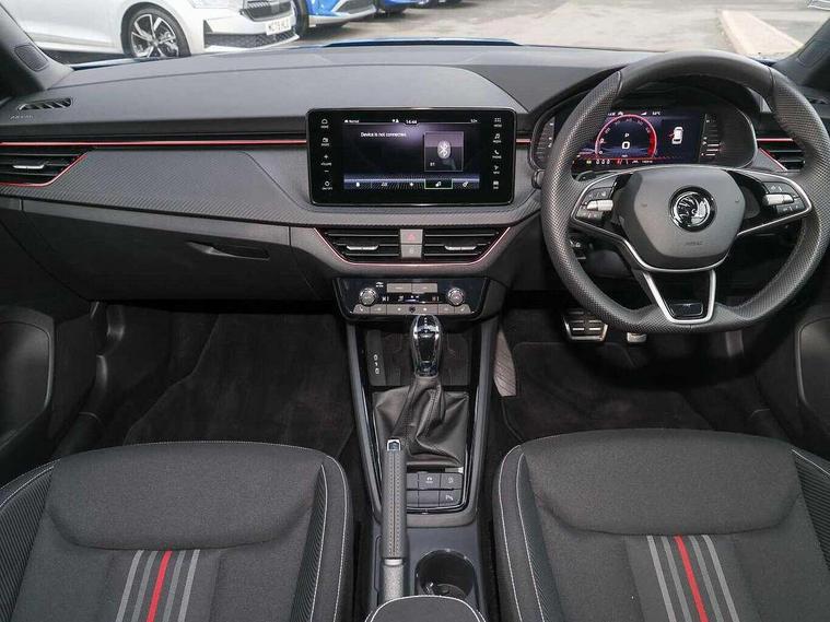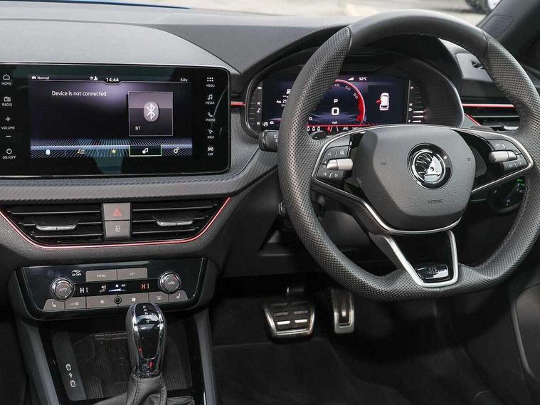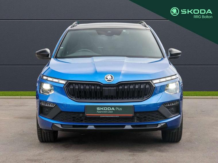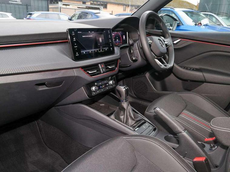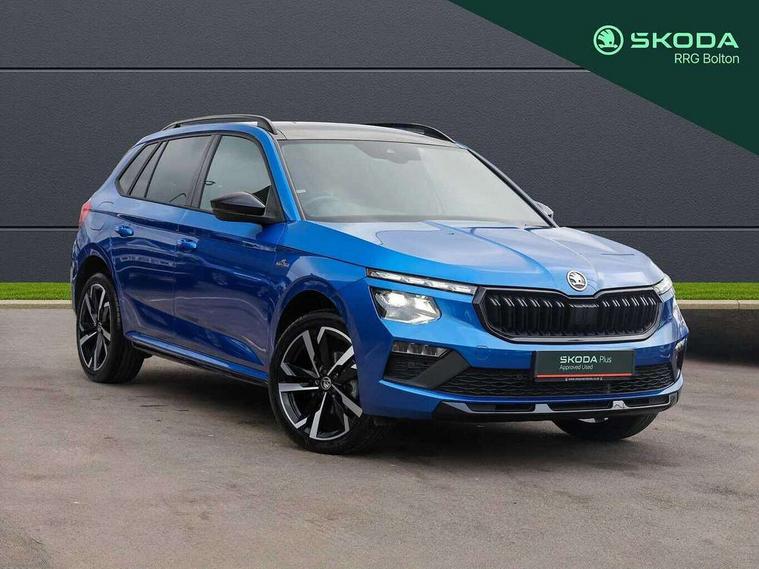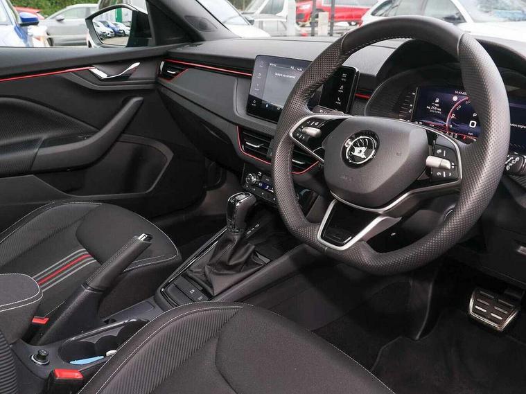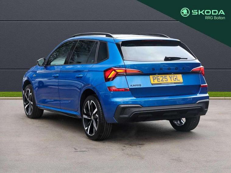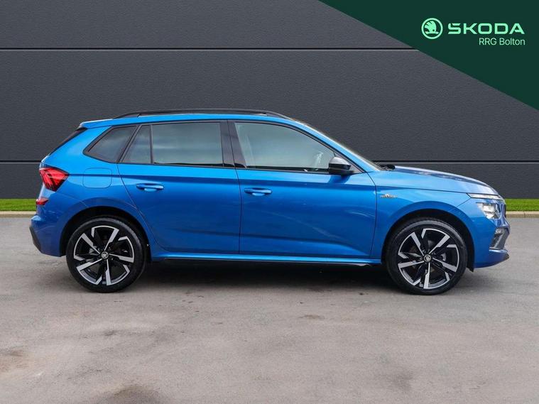 Advanced driver attention and drowsiness monitor, Bluetooth system, E-call, Front assist system, PAS, Rear parking sensors, Rear view camera, Service indicator, Speed limiter, Traffic sign recognition, Virtual cockpit with 10.25" display, Voice control system, Wireless smartlink, 4 USB C ports, 8 Speakers, 9.2" Skoda navigation display, DAB Digital radio, Auto dimming rear view mirror, Automatic headlight control with coming home and leaving home feature, Black door mirrors, Black radiator grille, Black rear diffuser, Black roof spoiler, Body colour bumpers, Body colour door handles, Boot lettering in black, Extended tailgate glass, Fixed panoramic sunroof with black roof rails, Front and rear electric windows, Heated rear window, LED daytime running lights, LED high beam, LED low beam, LED third brake light, Light sensors, Monte carlo plaque, Privacy glass, Rear side wing doors, Rear wiper, Ticket holder inside windscreen, 12V socket in luggage compartment, 3 seat bench in 2nd row, Aluminium pedals, Ambient lighting in white/red, Art leather carbon decor inserts, Art leather carbon door inserts, Black roof lining, Cargo elements, Chrome inner door handles, Driver and passenger sun visors with vanity mirror, Dual zone climate control, Front and rear roof lights, Front centre armrest, Front head restraints, Glove compartment with illumination, Height adjustable driver seat, Height adjustable front passenger seat, Ice scraper, Inner circulation control with pollen filter, ISOFIX on front passenger seat, Isofix preparation for back seats, Leather gearknob and handbrake lever, Manual lumbar support for front seats, Monte Carlo cloth upholstery, Net package and top tether hooks in boot space, Net under rear shelf, Pocket on the back of both front seats include mobile phone pockets, Rake/reach adjustable steering wheel, Reading lights, Rear centre armrests, Red hotstamping, Single front passenger seat, Sports seats, Textile floor mats, Third rear headrest, Top tether for front passenger seat, Umbrella in driver's door, Light and view plus package - Kamiq, 3x3 point rear seatbelts, Airbags - driver and front passenger, Disc brakes, ESP, Extended and predictive pedestrian/cyclist protection, Front passenger airbag deactivation switch, Front side airbags with curtain airbags, Hill hold control, Manual leather parking brake, Manual rear child locks, One tone horn, Seatbelt reminder for driver an co-driver, Traction control, Tyre pressure monitor, Anti-theft alarm system with interior monitoring, backup horn, towing protection and remote central locking with SAFE system, Anti-theft wheel bolts, Electronic engine immobilizer, 18" Ursa black diamond cut alloy wheels,