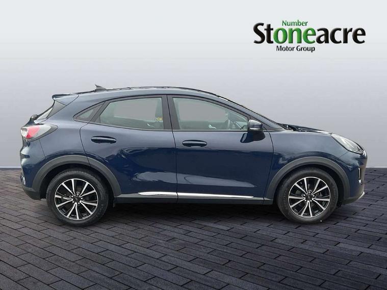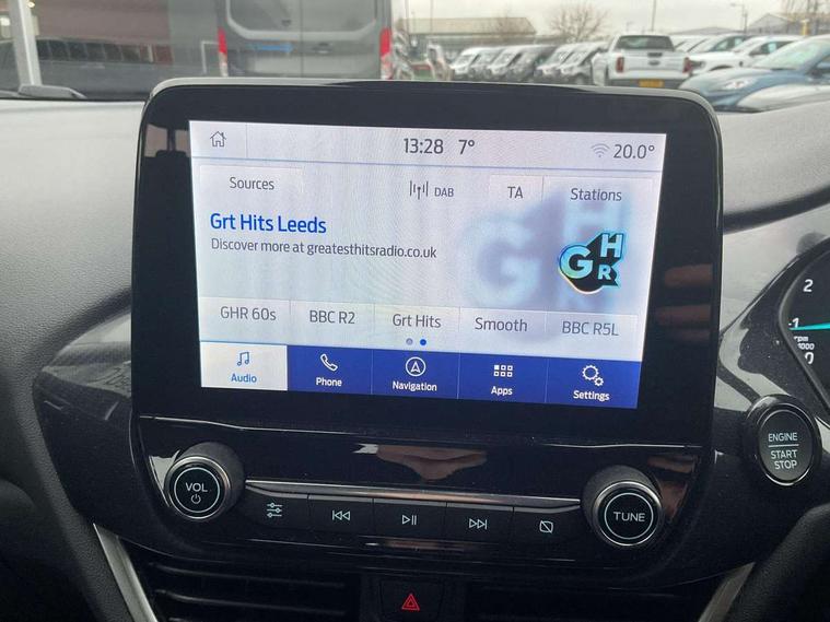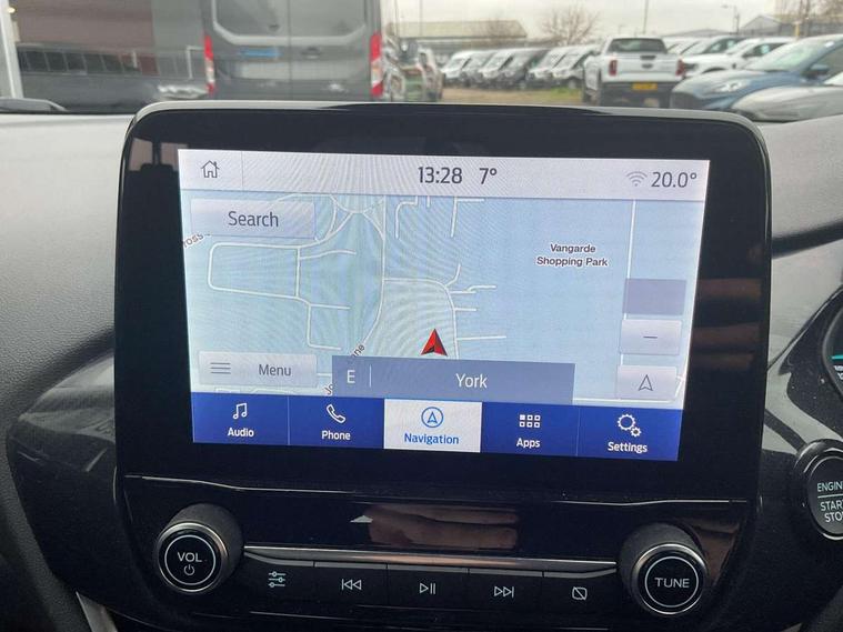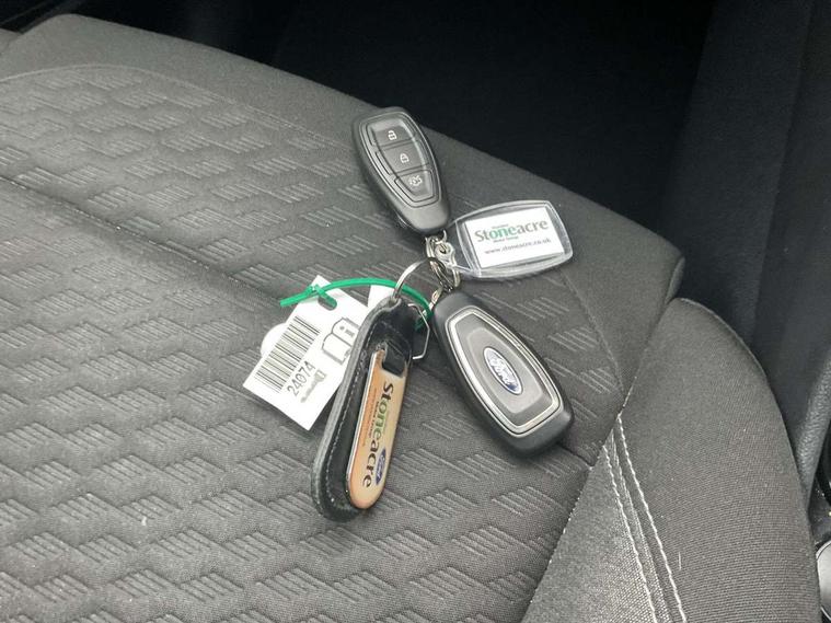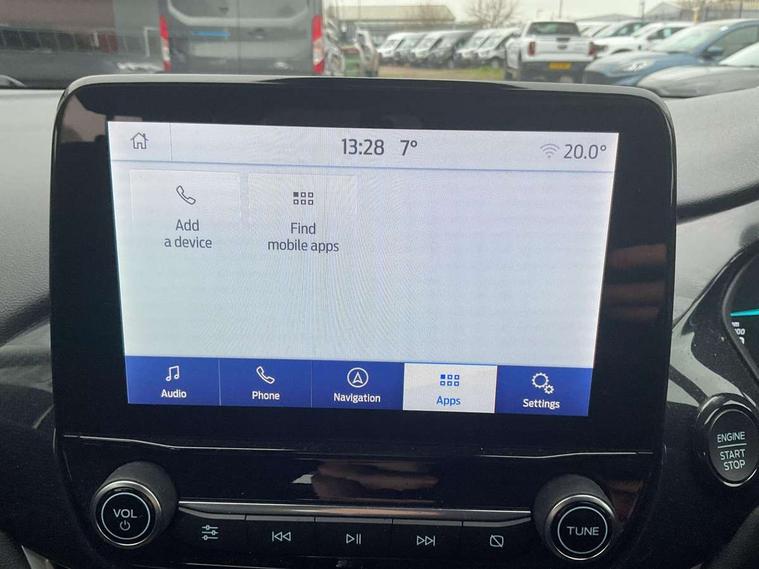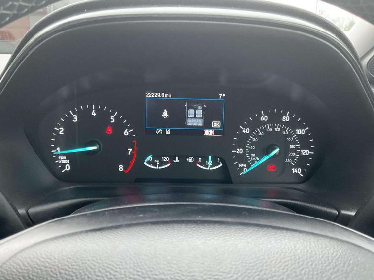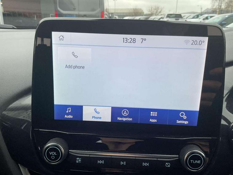Driver impairment monitor, Emergency call service, Ford easy fuel, Lane keeping aid with lane departure warning, Power assist steering, Power start button, Rear parking sensor, Selectable drive modes(Normal, Eco, Sport, Slippery and Trail), Speed sign recognition, Standard suspension, Automatic headlights with auto high beam, Automatic rain sensing wipers, Body colour rear spoiler, LED rear lamps, Power foldable heated door mirrors with puddle lamps, Projector headlamps with LED day time running lights and front fog lamps, Quickclear heated windscreen, Rear side wing doors, Rear wiper, Third brake light, 3 seat bench in 2nd row, Centre console with armrest and stowage, Electronic automatic temperature control (EATC), Ford megabox extended bootspace, Front and rear head restraints, Front floor mats, Manual 2 way passenger seat adjustment, Manual 4 way driver seat adjust with lumbar adjustment, Sensico leather steering wheel/gear knob/handbrake, Single front passenger seat, Titanium cloth upholstery, Ford SYNC 3 navigation pack - Puma, 3 rear seatbelts, Child safety lock, Electronic stability control (ESC) and hill start assist, Pedestrian/cyclist detection & post-collision braking, Pre collision assist system, Tyre pressure monitoring system (TPMS), Thatcham alarm, 17" 10 spoke absolute black machined finish alloy wheel,