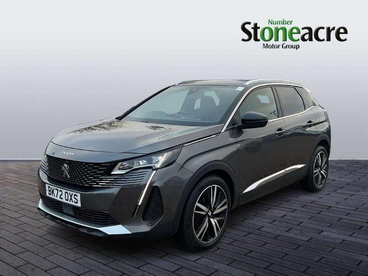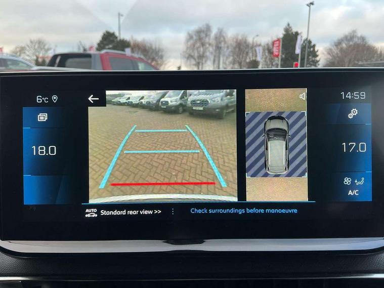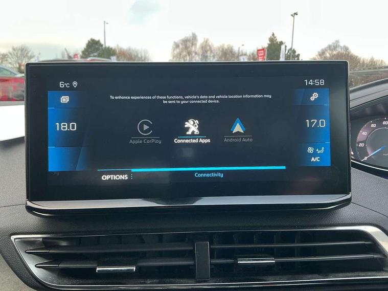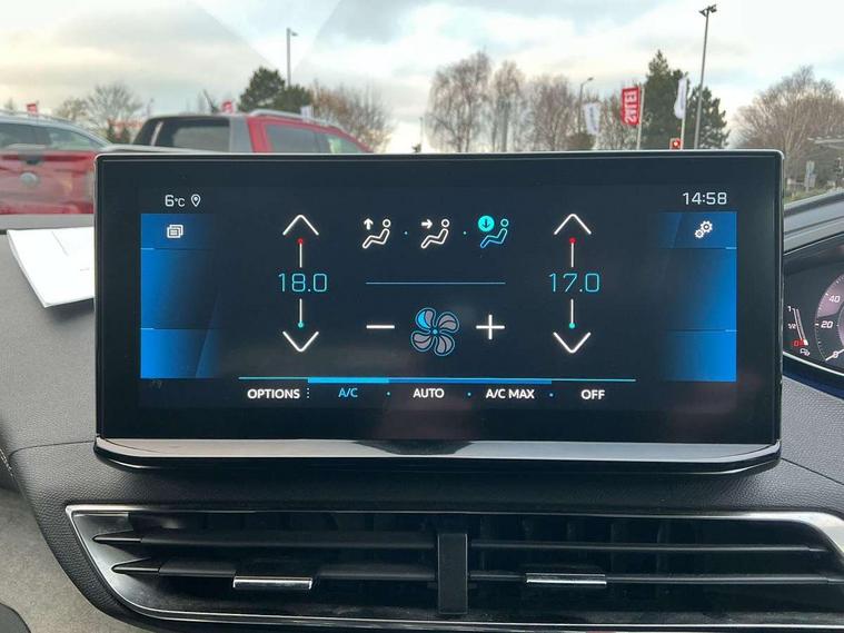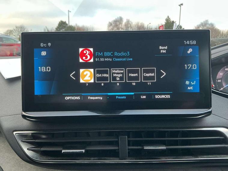 3D connected navigation with 10" HD touchscreen, Bluetooth telephone facility, Drive modes select (Eco, normal and sport), Driving Time Warning (DAA1), Emergency services call system, Extended traffic sign recognition, Exterior temperature indicator with ice warning, Front and rear parking sensors, Mirror screen with mirror link, apple carplay and android auto, Multi function trip computer, Passive blind spot monitoring without Steering correction, PEUGEOT i-Cockpit with 10" high definition capacitive touchscreen, Peugeot i-cockpit with compact multi-function sports steering wheel, PEUGEOT i-Cockpit with configurable 12.3" Head-up digital instrument panel, PEUGEOT SOS and assistance, Rear passenger USB charging sockets (x2) (type A), Speed limit recognition and recommendation, Visio park assist 360 with colour camera system + automatic parking assist, Voice recognition, Dynamic stability control and electronic anti-skid system, Stop/start function, DAB Digital radio, Focal premium HiFi sound system, USB socket, Auto self levelling headlights, Automatic hazard light activation upon heavy brake application, Automatic triggered rear windscreen wiper in reverse gear, Black with chrome detailed front wing trim, Body colour door handles, Body colour rear roof spoiler with stainless steel edging trim, Body protectors (bottom of front and rear bumpers + wheel arches + protection at bottom of doors) in black, Dark tinted rear side windows + tailgate window, Diamond Black door mirror shells, Door mirror mounted LED courtesy floor lighting, Electric folding door mirrors with exterior courtesy LED lighting, Electric operated/heated door mirrors, Fog Mode, Front windscreen wiper with magic wash cleaning system, Full LED headlights with LED fog lights with static cornering function, Gloss black B and C pillar and aerodynamic deflector trim, Gloss black front bumper air scoops, Gloss black rear cluster connecting strip, Gloss black windscreen trim, GT emblem in satin copper (front wings and tailgate), Headlights left on audible warning, Heated rear windscreen with integrated antenna, LED daytime running lights, LED front indicator, LED rear number plate lighting, LED side indicator lights integrated into door mirrors, LED third brake light, One touch electric front/rear windows with pinch protection, Rear LED Peugeot signature 'Claw Effect' lights, Rear side wing doors, Stainless steel roof arches, Twin exhaust tailpipe, 1/3 to 2/3 split folding rear seats, 12V Sockets in dashboard, rear cabin and load area, 2 cupholders in front centre console, 2 cupholders in rear armrest, 2 x Rear reading spotlights, 2x Rear coat hooks, 3x Isofix child seat fittings in the front passenger and outer rear seats, 4 Grab handles retractable and damped, Aikinite stitching in armrest, gear lever and dashboard facia, Aluminium pedals, Blue ambient lighting for connecting zone, Blue ambient lighting to front door panels, central storage and cupholders, Blue ambient lighting to headup instrument panel, Centre front armrest with butterfly wing opening and illuminated storage compartment, Dual zone automatic climate control, Electric power steering with reach and rake adjustable steering column, Flocked front door pocket interior with blue ambient lighting, Flocked glovebox interior, Focal tweeter speaker grilles in Belem bronze metal effect finish, Foldable front passenger seat with picnic table, Footwell illumination, Front interior light with 2 reading spotlights and rear interior light with timer, Front passenger seat manual adjustment (longitudinal and back rest angle), Front seat back map pockets, Gear shift indicator, Illuminated glovebox, Individual left and right controls in boot for seat folding, LED interior lighting in storage spaces and load area, LED roof interior lighting, Mistral floor mats with Aikinite contrast stitching, Mistral full grain perforated leather steering wheel with aikinite stitch detail and satin chrome 'GT' emblem, Rear bench seat with central armrest and ski hatch, Rear centre console ventilation system, Roof lining - Mistral black, Satin chrome dashboard trim, Satin chrome digital instrument panel and touchscreen trim, Satin chrome front door panel recess trim, Satin chrome interior door handles, Satin chrome scorpion's tail and toggle switch trim, Seatbelt not fastened audible and visual alert for front seats, Seatbelt unfastened on the move audible and visual alert for front and rear seats, Sunvisors with illuminated vanity mirrors, Two position boot floor, Drive assist plus pack - 3008, Driver sport pack - 3008 Auto, Safety plus pack with high beam assist - 3008, Visibility pack - 3008, 3x Rear three-point retractable seatbelts with force limiters in the outer rear seats, ABS (Anti-lock Braking System) with EBD (Electronic Brakeforce Distribution) and EBA (Emergency Braking Assistance), Adaptive driver and front passenger airbags with passenger airbag deactivation function, Driver and front passenger side airbags, Electric child locking functionality on rear windows and doors, Electric parking brake, Front and rear curtain airbags, Front optimised safety headrests and 3 x rear retractable headrests with height adjustable, Front three point retractable seatbelts with pre tensioners and force limiters, Front ventilated disc brakes and rear disc brakes, Hill start assist, Two tone horn, Automatic door locking when moving off, Electronic immobiliser, key operated exterior door lock from the left hand door, Perimetric and volumetric alarm with lift and tilt sensor, Peugeot Open and Go System, Remote control central locking with two plip keys, Puncture repair kit including compressor, sealant cartridge and towing eye,