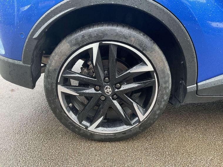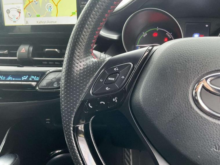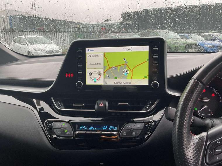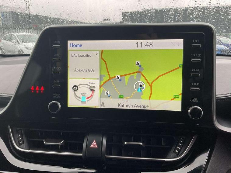 4.2" coloured TFT screen for multi-information display, Adaptive cruise control, Bluetooth connectivity, Electric power steering, Hybrid system indicator, Lane departure alert with steering control, Remote boot door release in cabin, Remote boot door release in key, Reversing camera, Road sign assist - RSA, Simple Intelligent parking assist, Touch 2 Go navigation system, Trip computer, Voice recognition, Vehicle Stability Control (VSC), 6 speakers, AM/FM radio, DAB Radio (Digital Audio Broadcasting), Toyota touch 2 multimedia system with 8" display, USB connector, Wi-fi connectivity, Adaptive front light system, Adaptive LED Headlights, Anti-jam protection on power windows, Auto high beam, Auto up and down function on all power windows, Automatic headlight levelling, Automatic headlights, Automatic headlights cut-off, Black and body coloured rear bumper, Black upper front grille, Body colour door handles, Body colour door mirrors, Body coloured front bumper, Boot door release with push button, Chrome front lower bumper, Electric heated door mirrors, Follow me home headlights, Front and rear power windows, Front spoiler lip in black, Honeycomb lower front grille, LED daytime running lights, LED fog lights, LED front light guide, LED High mounted stop light, LED rear brake lights, LED rear combination lights, Noise reduction layer on front windows and windscreen, Power adjustable door mirrors, Privacy glass, Rear sequential indicators, Rear spoiler, Rear tailgate, Rear window defogger, Rear window wiper, Shark fin antenna, UV-filter on driver and passenger windows, UV-filter on rear windows, 12v power outlet - front, 3 rear headrests, 3 spoke perforated leather steering wheel, 60/40 split folding rear seat, Adjustable rear headrests, Adjustable speed limiter switch on steering wheel, Assist grips front and centre pillar, Audio and telephone switches on steering wheel, Black front door assist grips, Blue ambient lighting on front cup holders, Blue ambient lighting on front doors, Boot light, Chrome interior door handles, Driver and front passenger personal light, Driver and front passenger Whiplash Injury Lessening seats, Driver and passenger seatback pockets, Dual zone automatic air conditioning, Fabric upholstery, Floor mats, Front cupholders, Front head restraints, Front sports seats, Glovebox with internal light, Hard tonneau cover, Heated driver and front passenger seats, Hooks for luggage holding net, Humidifying Nanoe air purifier, Illuminated entry system, Isofix attachments on outer rear seats, Leather gearshift, Light on driver sun visor, Light on passenger sun visor, Manual telescopic steering wheel, Manual tilt steering wheel, Manually height adjustable driver seat, Manually height adjustable front passenger seat, Manually reclining driver seat, Manually reclining front passenger seat, Manually sliding driver seat, Manually sliding front passenger seat, Microphone on front personal light, Mirror on driver sun visor, Mirror on passenger sun visor, Multimedia switches on steering wheel, Pollen filter, Power adjustable lumbar support on driver seat, Shopping bag hooks, Slow opening on lower glovebox, Voice recognition switch on steering wheel, Tech with parking sensor pack - C-HR, 16 Disk front wheel brake, 3x3 point rear seatbelts, ABS+EBD+Brake assist, Electronic parking brake, Front and rear seatbelt reminder, Front passenger airbag on/off switch, Hill start assist control (HAC), Pre collision system with pedestrian detection, Pre-tensioners and force limiters, Rear door child safety locks, SRS Airbags - Driver + Front passenger, front side, front and rear curtain and driver's knee airbags, Toyota safety sense, Tyre pressure monitoring system, Acoustic vehicle alert system (AVAS), Glass-breaking alarm sensors, Immobiliser, Intrusion alarm, Intrusion sensor, Motion sensor alarm, Power door locks, Power passenger window lock, Remote central locking, Black lower dashboard, Black upper dashboard, Piano black console, Silver deco line on upper dashboard, 19" Black machined alloy wheels, Tyre repair kit,