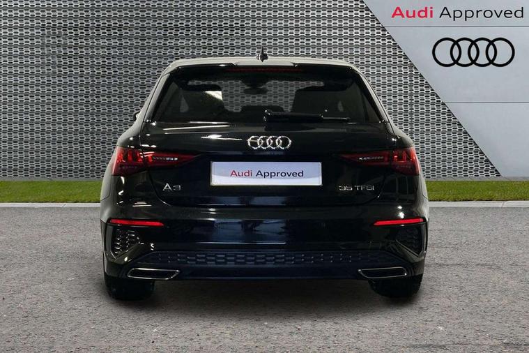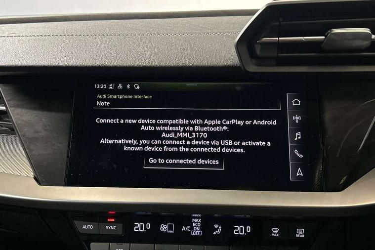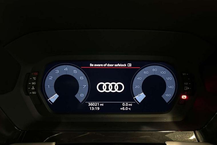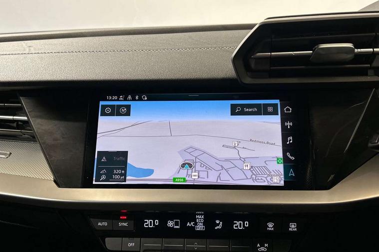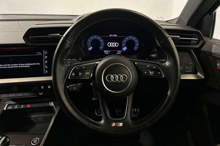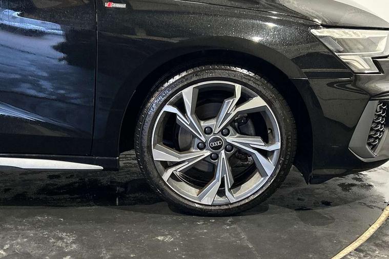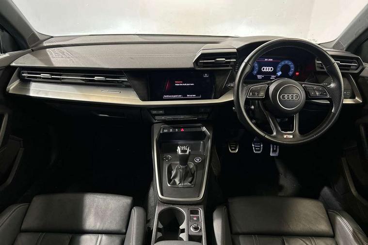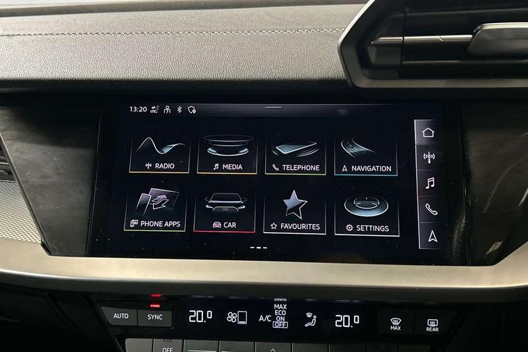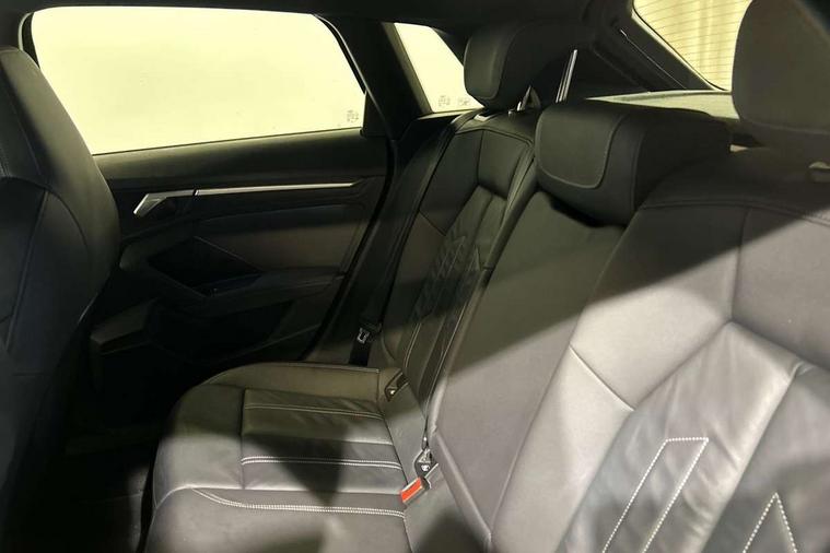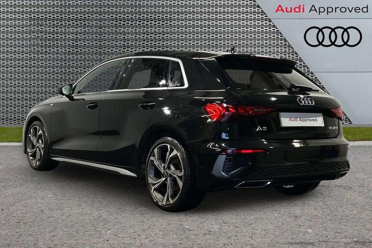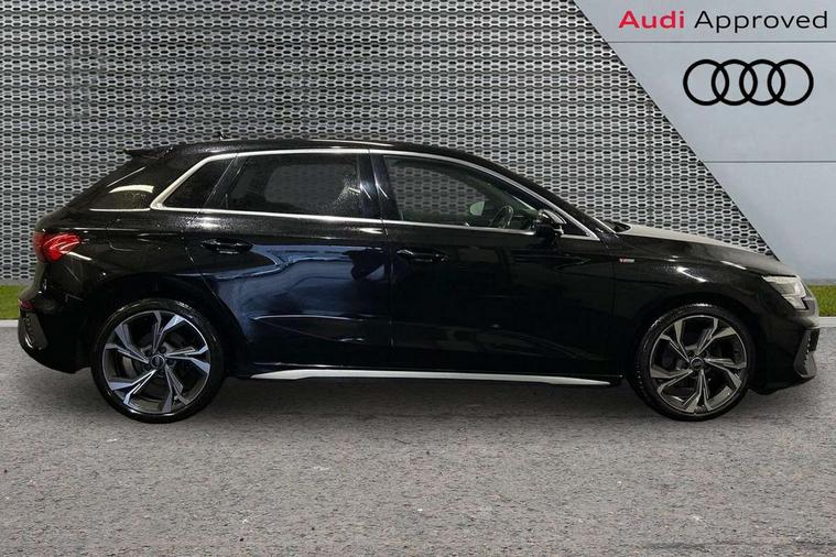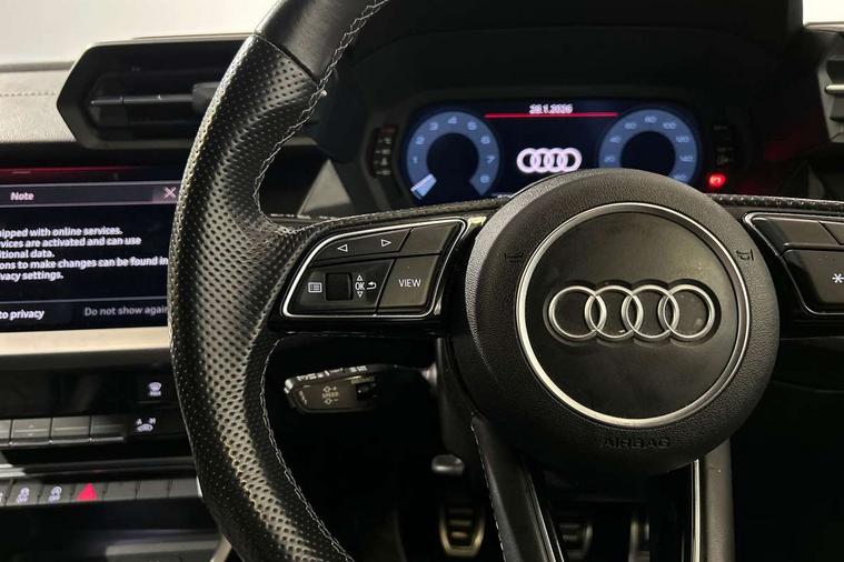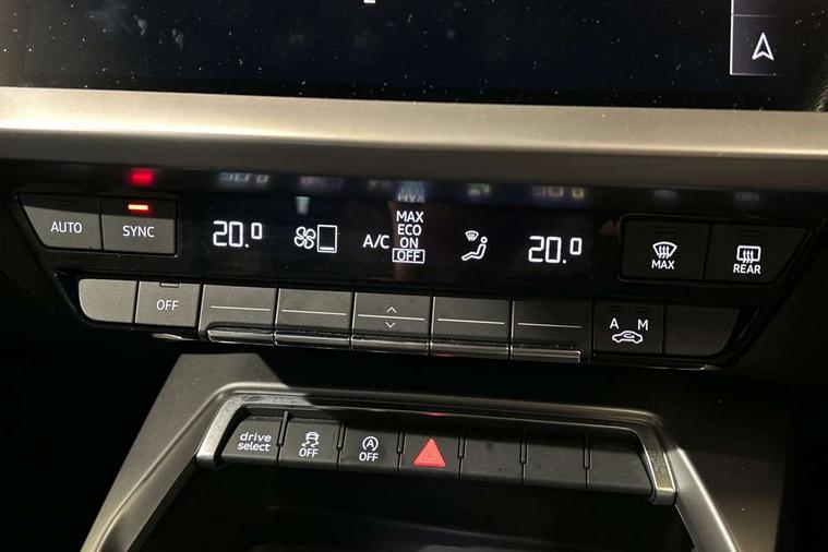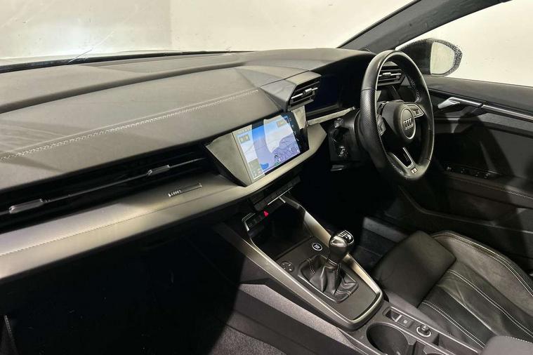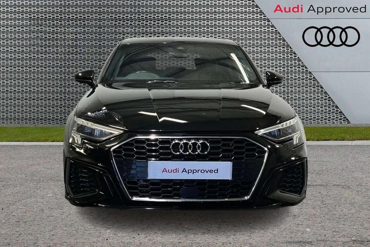 Audi connect emergency call and service, Audi drive select (Auto, Comfort, Dynamic, Efficiency and Individual), Audi smartphone interface, Audi Virtual Cockpit - 10.25" digital and colour instrument cluster, Automatic start/stop system with recuperation, Bluetooth interface, Collision avoidance assistant, Electromechanical power speed sensitive steering, Lane departure warning system, MMI Navigation Plus with high resolution 10.1" colour touch screen display, Service indicator, Trip computer, Voice control system with natural language interaction, 2xUSB-C connection with data and charging functions, 6 passive loudspeakers, DAB Digital radio, 3rd brake light, Acoustic glass windscreen, Aluminium window trim, Auto dimming frameless rear view mirror, Electrically adjustable/heated/folding/auto dimming door mirrors with integrated LED indications + kerb view function for passenger side, Front electric windows, Illuminated aluminium inserts front door sills with S logo, LED daytime running lights, LED headlights with LED rear lights and dynamic rear indicators, Light and rain sensors, Privacy glass - dark tinted rear window, rear door and side windows, Rear electric windows, Rear side air outlets in grained matt black, Rear side wing doors, Rear wiper, S line bumpers, S roof spoiler, 12V socket and storage compartment in front centre console, 3 seat bench in 2nd row, 40/20/40 split folding rear seat bench with cupholder, Black cloth headlining, Dual zone electronic climate control, Front and rear centre armrest in leather, Front and rear headrests, Front/rear floor mats, Height and reach adjustable steering wheel, Illuminated vanity mirror, Interior lighting - glove compartment light and right hand side, Luggage compartment floor covering, Manual boot compartment lid, Manually adjustable front seats, Seat side bolsters, Single front passenger seat, Stainless steel pedals and front footrest in black, Twin leather upholstery with front sports seats S embossed logo, Aluminium interior elements pack - A3 Sportback, S line styling pack - A3 Sportback, 3x3 point rear seat belts, Driver and front passenger airbag with passenger airbag deactivation, Electronic Stabilisation Control (ESC) including ABS, ASR and EDL, First aid kit with warning triangle and 2 safety vests, Front side airbags with head airbags and interaction airbag, Pre-sense front with pedestrian and cyclist detection, Seatbelt monitoring, Tyre pressure loss indicator, Anti theft alarm, Anti-theft wheel bolts, Immobiliser, Manual child locks, Remote control central locking, Accent surfaces in the dashboard and centre console in platinum grey silk effect paint finish, Dark spectrum aluminium inlays,