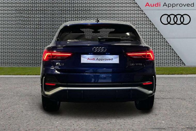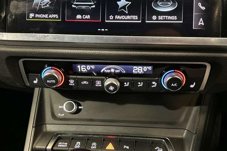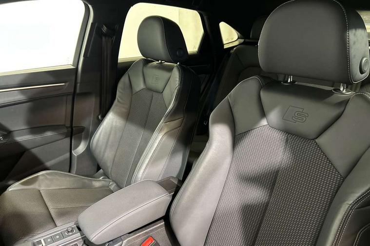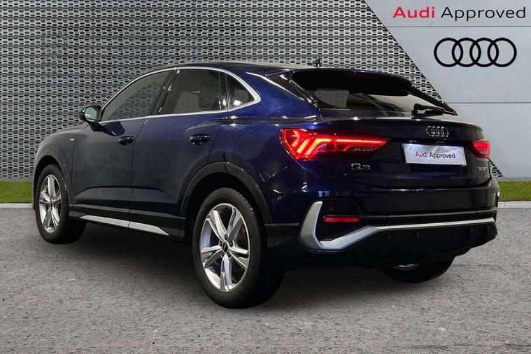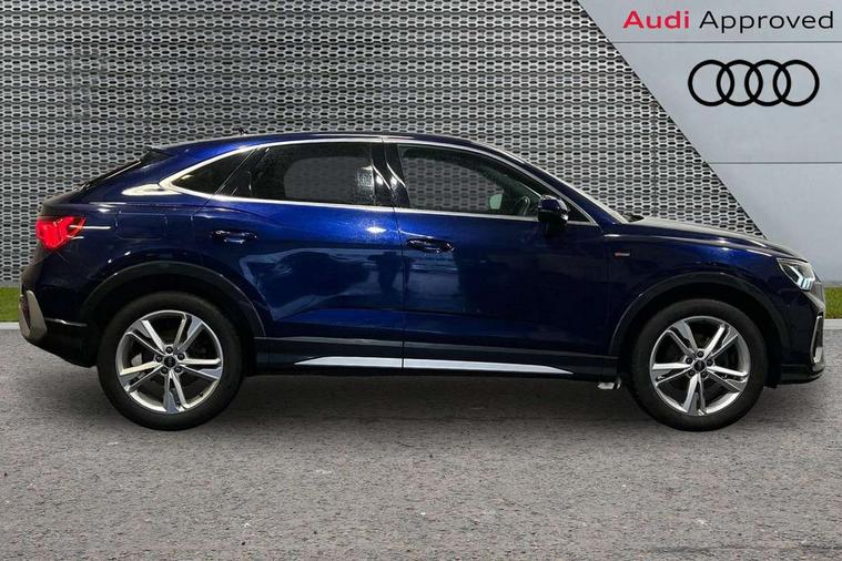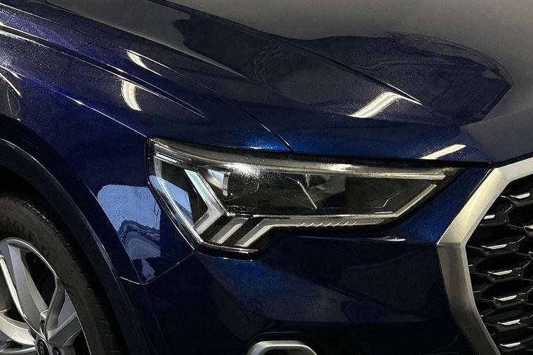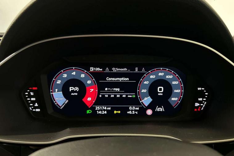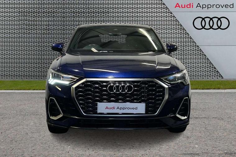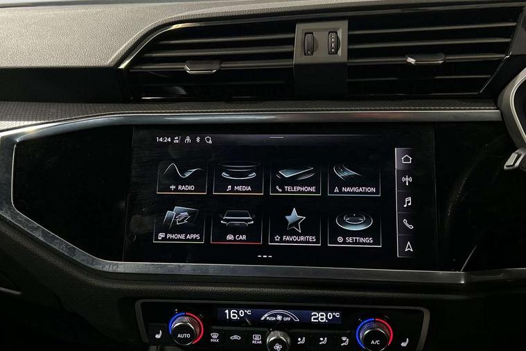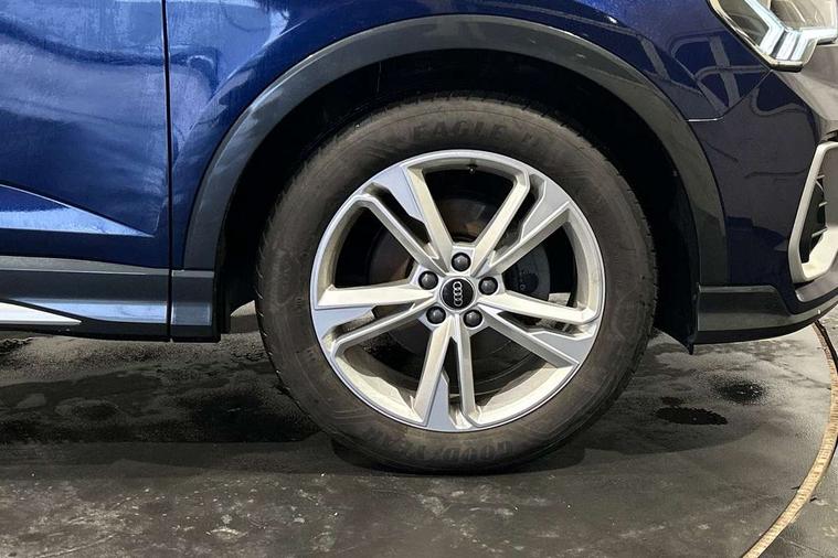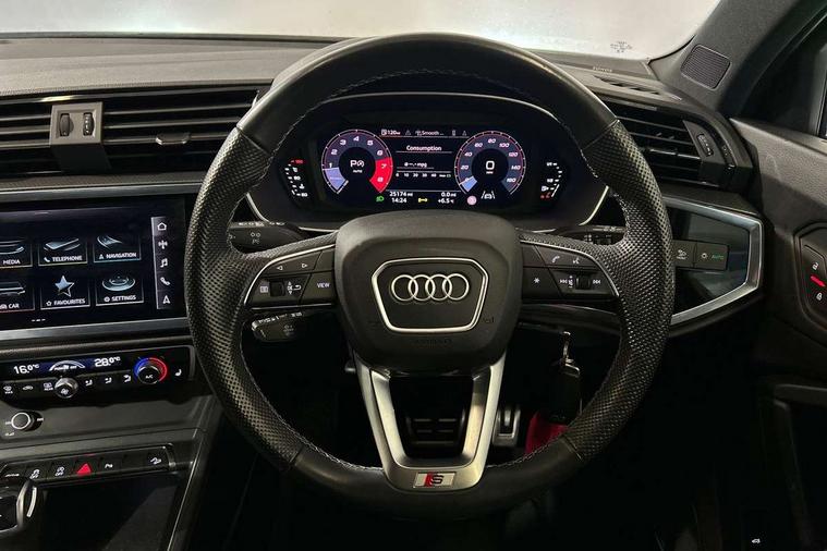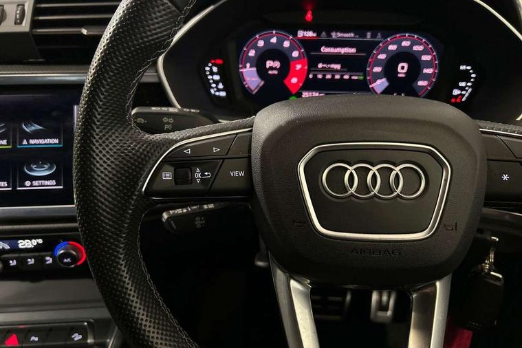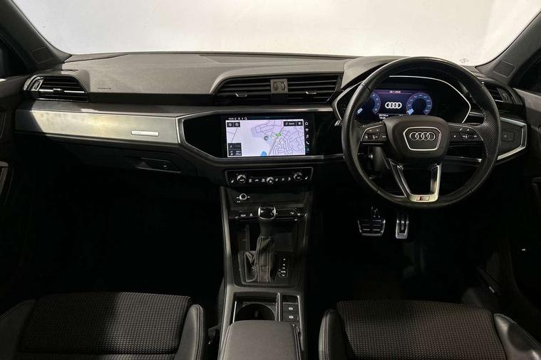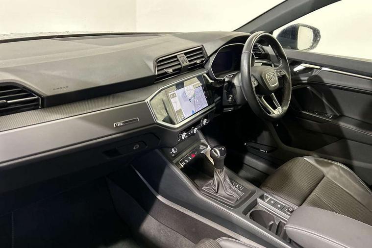 Audi drive select, Audi lane departure warning, Audi Virtual Cockpit - 10.25" display, Bluetooth interface, Camera based traffic sign recognition, Legal emergency call, MMI Navigation Plus with high resolution 10.1 inch touchscreen colour display, Power operated tailgate, Progressive steering, Service interval indicator, Smartphone interface includes wireless Apple carplay/Android Auto, Start stop system with recuperation, Voice control system with natural language interaction, Sports suspension, 2 USB-C ports with charge and data functions, 6 passive loudspeakers, DAB digital radio module, Acoustic windscreen, Aluminium window trim, Auto dimming frameless rear view mirror, Diffuser grille in grained matt black, Diffuser trim in selenite silver, Electrically folding, adjustable and heated door mirrors with integrated LED side indicators and kerb view function for passenger side, Front and rear electric windows, Front fog lights, Front side air inlets in selenite silver, Front underbody protection in manhattan grey paint finish, Grille surround in aluminium silver matt, High gloss black finish B and C pillars, LED Dynamic rear indicators, LED headlights with LED daytime running lights, LED rear lights, LED third brake light, Privacy glass dark tinted rear and rear-side windows (from B-pillar backwards), Radiator grille in anthracite black with inlay in matt aluminium silver, Rain and light sensors, Rear side wing doors, Rear underbody protection in matt black, Rear wiper, S line badges on front wings, S line front and rear bumpers and side skirts in contrasting Manhattan grey paint finish, Side skirt insert in matt Platinium grey, Variable front intermittent wipers, 12V socket in rear centre console, 3 seat bench in 2nd row, 3 spoke leather multifunction steering wheel features S badging and grips in perforated leather with contrast stitching, 40:20:40 folding with manual adjustment for 60:40 forwards/backwards position and backrest angle, Adjustable rear seat bench/backrest with centre armrest and cupholder, Black cloth headlining, Dual zone electronic climate control, Front and rear black floor mats with contrast stitching, Front and rear headrests, Front and rear roof module including reading lights, Front centre armrest, Glove compartment lighting, Height and reach adjustable steering wheel, Illuminated door sill trims with S logo, ISOFIX child seat mounting for front passenger with airbag deactivation and outer rear seat including top tether attachment point for outer rear seats, Luggage compartment light right in white, Luggage compartment sill protection in stainless steel, Manual front seats with height adjustment, Perforated leather gearknob, Single front passenger seat, Stainless steel pedals, Ambient lighting pack - Q3, Non smoking pack - Q3, 3x3 point rear seatbelts, 6 airbags - Driver, front passenger, curtain and side windows, Audi pre-sense front with pedestrain and cyclist recognition, Electrically operated child locks on rear doors, Electromechanical parking brake, Electronic stabilisation control including ABS, ASR and EDL, Front seatbelt reminder, Hill descent control, Hill hold assist, Pre sense basic, Seatbelt monitoring, Tyre pressure warning, Warning triangle and first aid kit, Anti theft alarm, Anti theft wheel bolts, Immobiliser, Remote central locking, Aluminium look interior elements, Black dashboard, Dark matt brushed aluminium inlay, Detail dashboard around MMI touch colour display in glass look, black with surround in aluminium look, Leatherette door armrest,