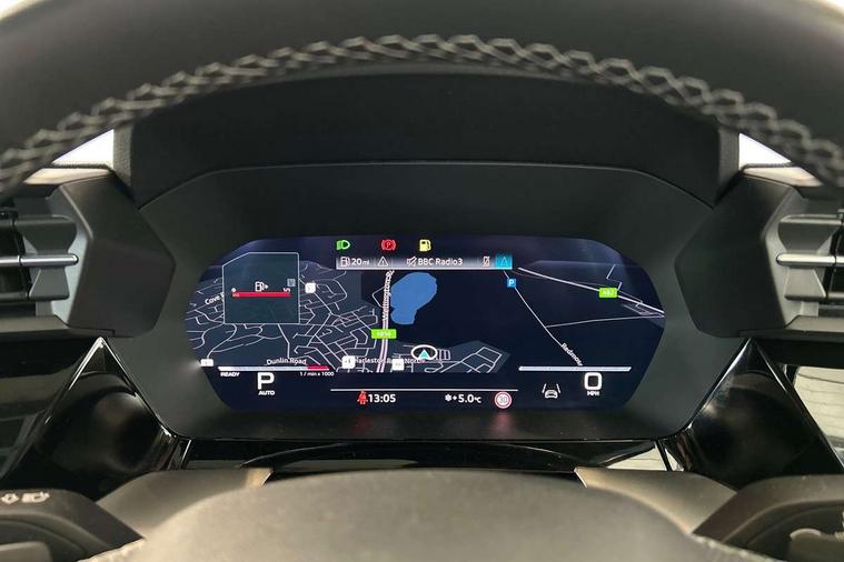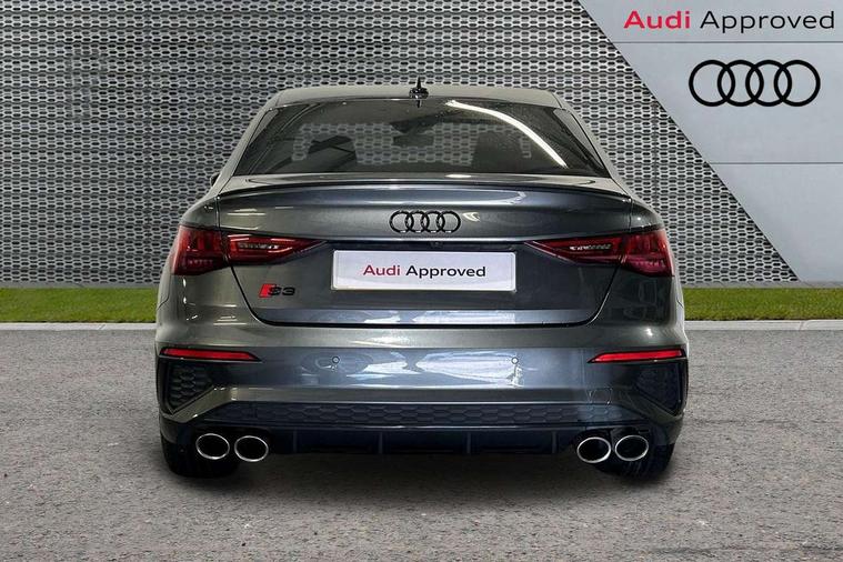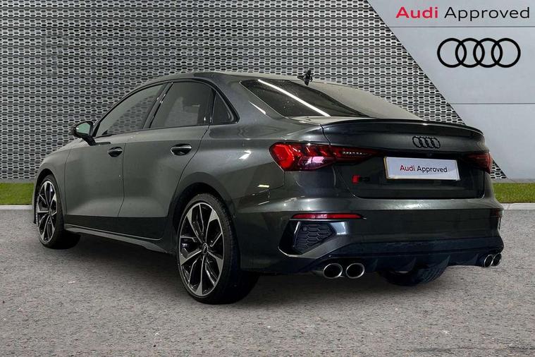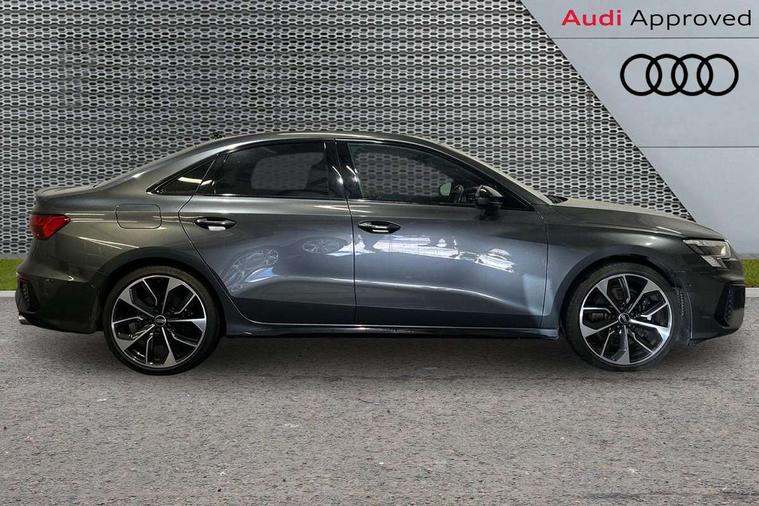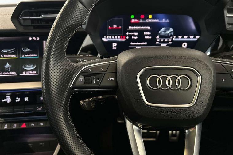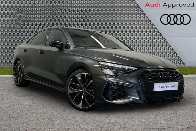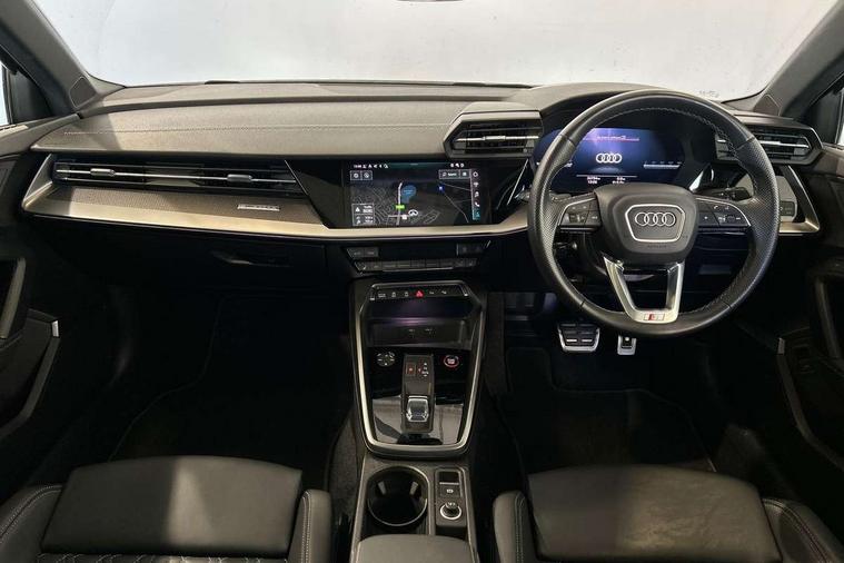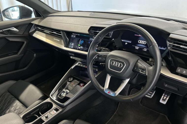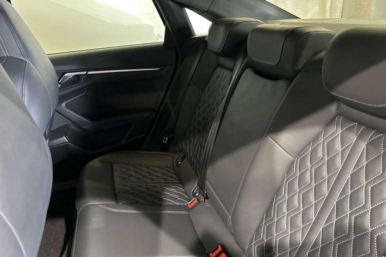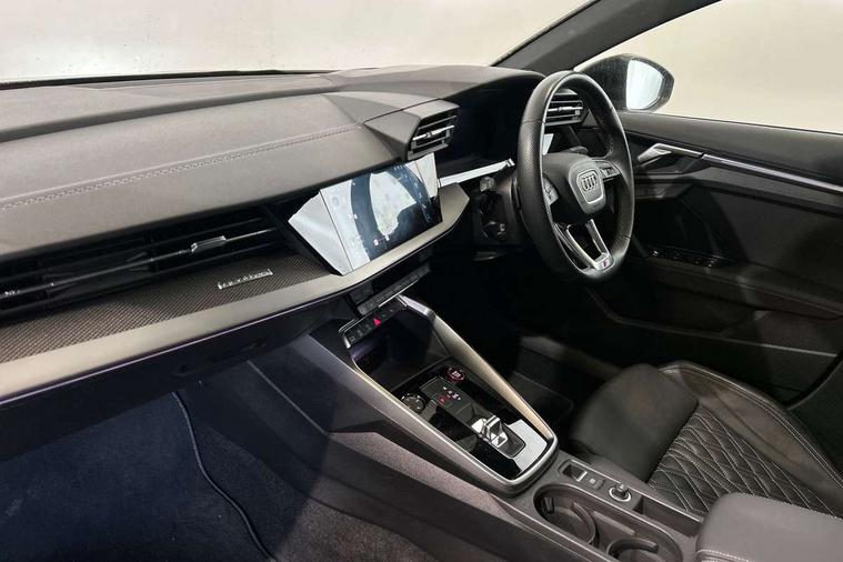 Audi connect emergency call and service, Audi drive select (Auto, Comfort, Dynamic, Efficiency and Individual), Audi smartphone interface, Audi virtual cockpit plus - 12.3" dynamic digital instrument cluster, Automatic start/stop system with recuperation, Bluetooth interface, Collision avoidance assistant, Head up Display, Lane departure warning system, MMI Navigation Plus with high resolution 10.1" colour touch screen display, Progressive steering, Reversing camera, Service indicator, Voice control system with natural language interaction, Quattro permanent all wheel drive, S sports suspension with damper control and lowering by 15mm, 2x USB Type C ports (for charging and data transfer), Bang and Olufsen premium sound system with 3D sound, CD player, DAB Digital radio, 3rd brake light, Acoustic glass windscreen, Audi Beam uses LEDs to project Vorsprung onto the ground as you exit your S3, Audi matrix LED headlights, LED rear lights, dynamic front and rear indicators and headlight cleaning system, Auto dimming frameless rear view mirror, Electric panoramic sunroof, Electrically adj heated/folding + automatically dimming exterior mirrors with memory + automatic kerb side function for passenger side exterior mirror, Front electric windows, Illuminated door sills with aluminium inserts at the front with S logo, Integrated LED indicators in door mirrors, LED daytime running lights, Light and rain sensors, Model and engine designation badges at rear, Privacy glass - dark tinted rear window, rear door and side windows, Rear boot, Rear electric windows, Rear side wing doors, 12V socket and storage compartment in front centre console, 3 seat bench in 2nd row, 3 spoke leather multifunction steering wheel with gear shift paddles, 4 way electrically adjustable lumbar support for driver and front passenger, 40/20/40 split folding rear seat bench with cupholder, Black cloth headlining, Dual zone electronic climate control, Electrically adjustable front seats with memory function for driver's side and exterior mirrors, Front and rear centre armrest in leather, Front and rear headrests, Front/rear floor mats, Heated front seats, Height and reach adjustable steering wheel, Illuminated vanity mirror, Interior lighting - glove compartment light and right hand side, Luggage compartment floor covering, Single front passenger seat, Stainless steel pedals and front footrest in black, Body styling design pack - S3, Driver Assistance pack - A3 Saloon, Extended ambient lighting pack - A3/S3 Saloon, LED interior lighting pack - A3 Saloon Edition 1/Vorsprung, Storage pack - A3/S3 Saloon, 3x3 point rear seat belts, Driver and front passenger airbag with passenger airbag deactivation, Electronic Stabilisation Control (ESC) including ABS, ASR and EDL, First aid kit with warning triangle and 2 safety vests, Front side airbags with head airbags and interaction airbag, Hill hold assist, Pre-sense front with pedestrian and cyclist detection, Seatbelt monitoring, Tyre pressure loss indicator, Advanced key and power operated tailgate - Luggage compartment lid opens electrically, Anti theft alarm, Anti-theft wheel bolts, Immobiliser, Manual child locks, Remote control central locking, Aluminium air vent surrounds, Aluminium trim elements, Carbon inlays, accent surfaces in the dashboard and centre console in platinum grey silk effect paint finish,