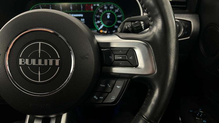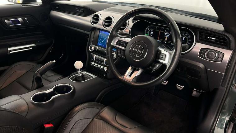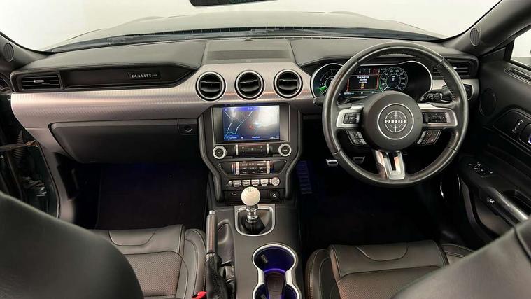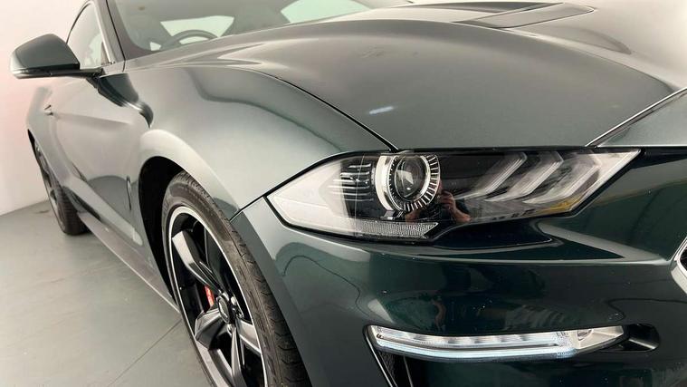 12" digital LCD instrument cluster, Adaptive cruise control, Apple car play/Android Auto, Bluetooth connectivity with voice control, Ford pass connect embedded modem, Ford SYNC 3 satellite navigation + B and O 1000w premium audio system with 12 speakers, Ford SYNC 3 with 8" colour touch screen, Increased top speed and maximum speedometer, Lane departure warning with lane keeping aid, Modified intake manifold, Oil pressure gauge, Rear view camera with rear parking sensors, Selectable driving modes - normal, mymode, snow/wet, sport+, track and drag mode, Service interval indicator, SYNC Emergency Assistance, Track apps with accelerometer technology, Trip computer, Adaptive damping system, Fully independent front and rear suspension, Launch control, Limited slip differential, Open air induction system, DAB Digital radio, USB connection, 5.0 Exterior badge on front wings, Active exhaust system with quad tailpipes, Auto dimming rear view mirror, Auto high beam, Automatic headlights, Automatic rain sensing wipers, Body colour bumpers, Body colour door mirrors, Bonnet air intake, Bullitt badge on instrument panel with unique chassis number, Chrome window surround, Electric front windows, LED headlamps with daytime running lights and LED fog lamps, Magnetic blade decklid rear spoiler, Metallic paint, Power folding door mirrors with Mustang logo projection puddle lamps, Unique front grille, splitter and rear applique, 6 way power adjustable front seats and driver seat power lumbar adjust, Ambient lighting, Cup holders, Dual electronic automatic temperature control, Front headrests, Heated steering wheel, Illuminated entry system, Individually folding rear seats, Isofix system on outer rear seats, Reach and rake adjustable leather steering wheel with integrated controls, Rear head restraints, Recaro leather seats with green detailing, Unique floor mats, Unique green stitching on centre console and gearshift gaiter, Unique white cue ball gearknob, 4 seatbelts, Brembo six piston front brake calipers in red front and rear, Drivers knee airbag, Dual front airbags, Electronic Line Lock, ESP, Front side airbags, Pre collision assist system, Side curtain airbags, Tyre pressure monitor, Unique tuning to chassis, ABS, power steering and stability control, Ford key free system with power starter button and keyless entry, Immobiliser, MyKey system, Thatcham Cat.1 alarm, 19" 5 spoke gloss black finish alloy wheels, Tyre repair kit,