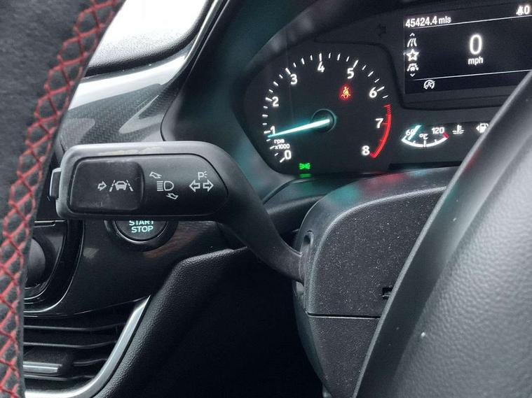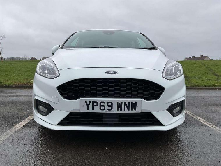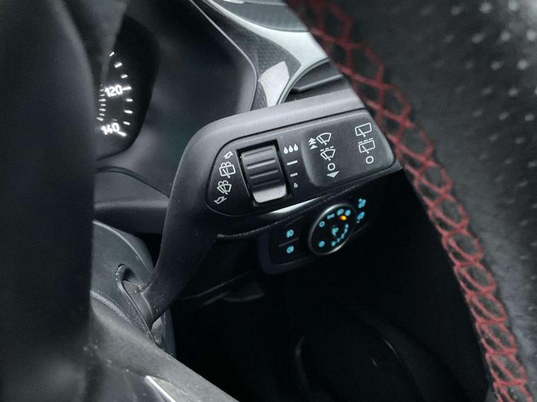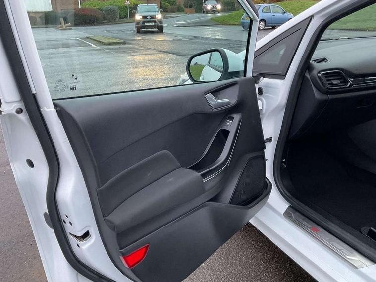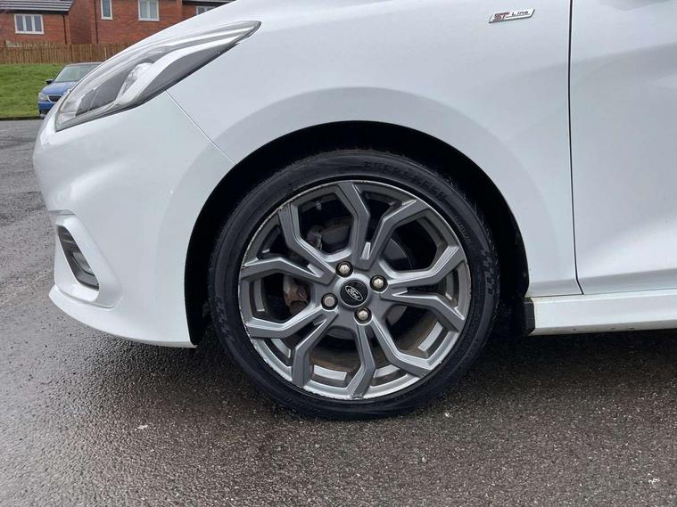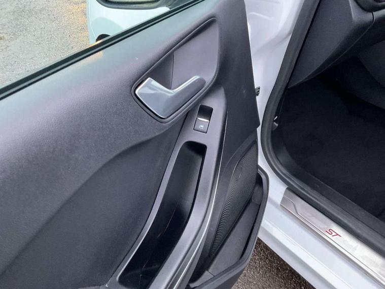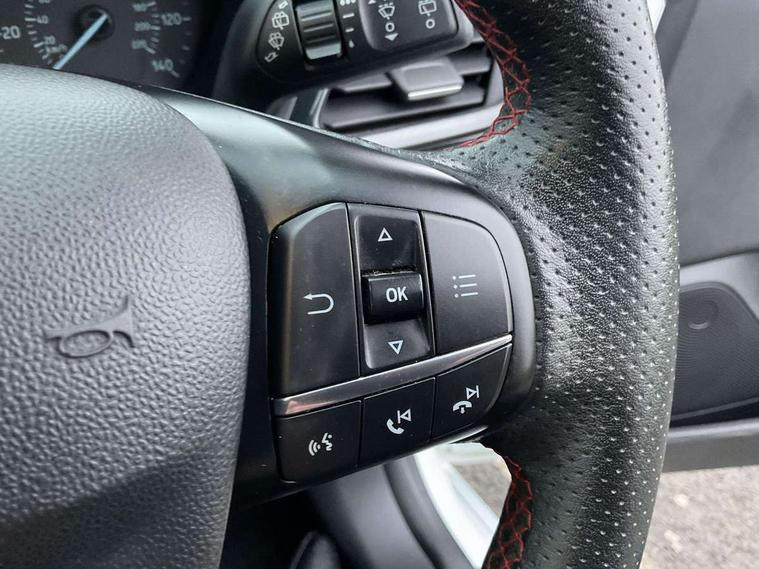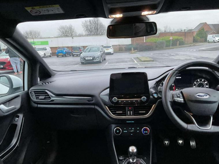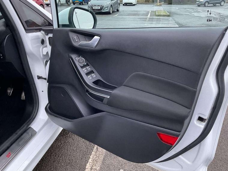 Bluetooth system, Electric power steering, Ford easy fuel, Ford SYNC 3 Navigation system incl 8" touchscreen, 7 speakers, FordPass connect, Apple carplay, android auto, voice control and emergency assistance, Rear parking distance sensors, Trip computer, Sports suspension, 2 USB ports, Auxiliary input socket, DAB Digital radio, Steering wheel mounted controls, Body colour bumpers, Body colour door handles, Body colour large rear spoiler, Body coloured electrically operated and heated door mirrors with side indicators, Cornering front fog lights, Electric front windows/one touch facility, Electric rear windows, LED Night signature to rear lights, Power foldable door mirrors with puddle lights, Quickclear heated windscreen, Rain sensing wipers and auto dimming rear view mirror, Rear privacy glass, Rear wiper, Unique ST-Line upper grille & full bodystyling kit with ST-Line wing badges, 12V Accessory socket in centre console, 3 spoke flat bottomed leather steering wheel, 60/40 split folding rear seat, Adjustable head restraints, Black headlining, Boot carpet, Centre console with armrest and illuminated cupholders, Chrome inner door handles, Cloth upholstery, Footwell illumination, Front map reading lights, Front seat and rear pockets, Front/rear floor mats, Height adjustable driver's seat, Illuminated glovebox, LED ambient lighting, Load area light, Manual air conditioning, Overhead console with sunglasses holder, Pollen filter, Rake/reach adjustable steering wheel, Sensico wrapped handbrake and gearknob, Sports front seats, Sports pedals, NCAP Pack - Fiesta, 3 point seatbelts on all rear seats, ABS+EBA, Curtain airbags, Driver and passenger airbags, Drivers knee airbag, Electronic stability control with hill start assist, Front passenger airbag deactivation, Front side airbags, Seatbelt warning, Two tone horn, Tyre pressure monitoring system, Keyless start with 'Ford Power' starter button, MyKey system, Remote central locking & engine immobiliser, Thatcham Cat.1 alarm, 17" 5 spoke alloy wheels with rock metallic finish,