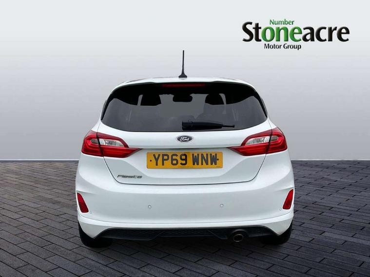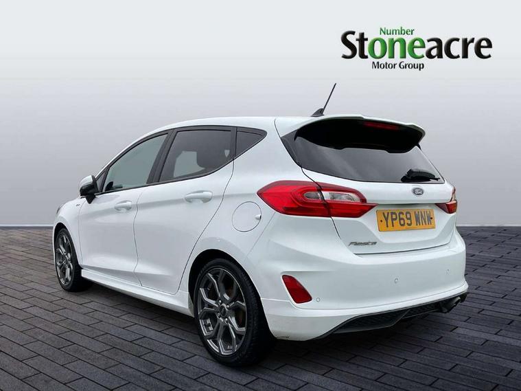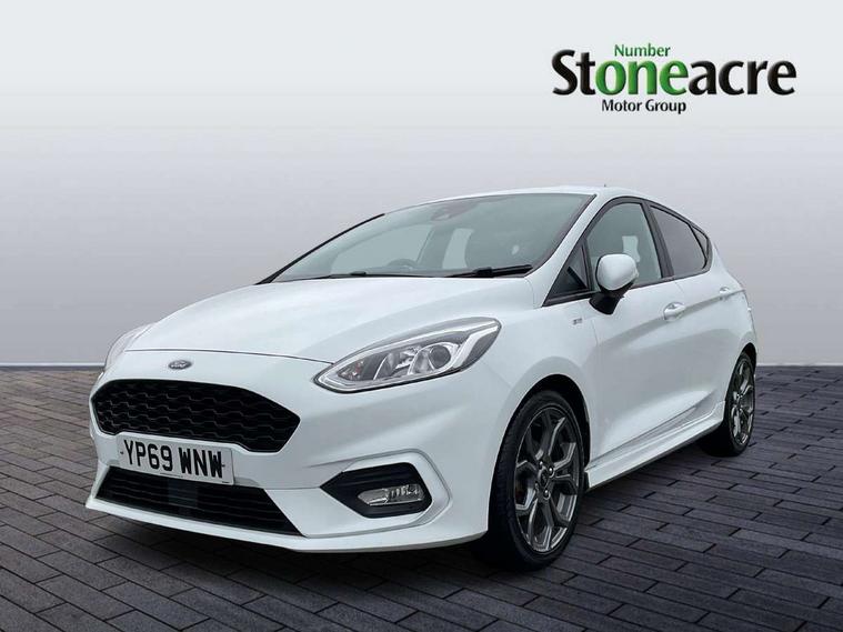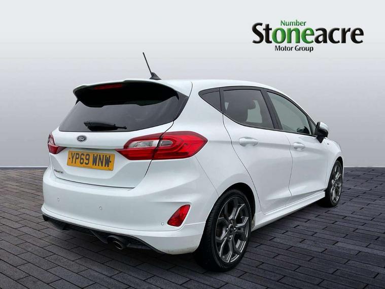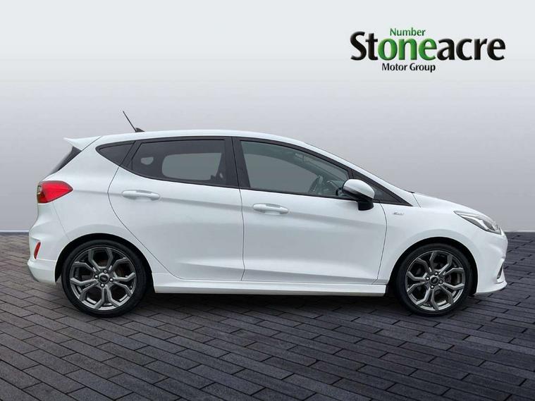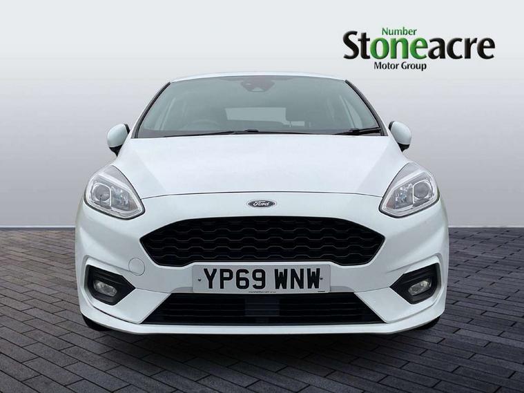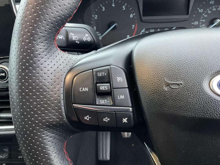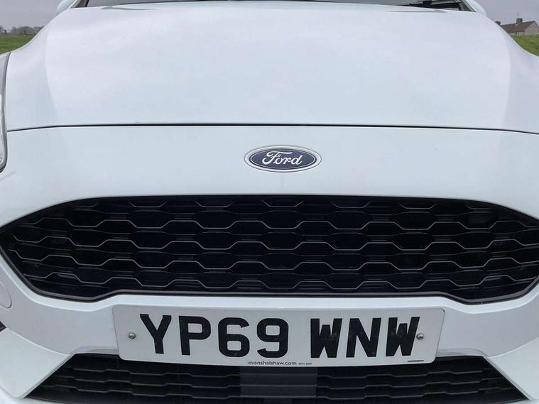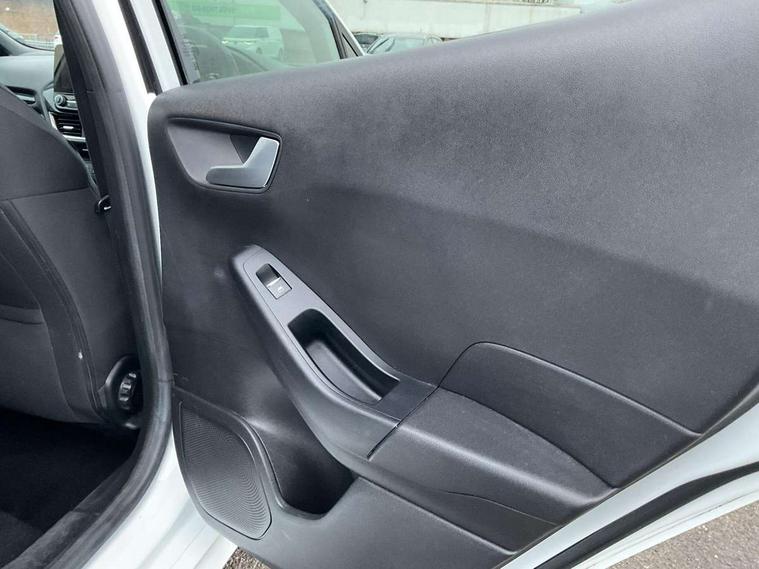 Bluetooth system, Electric power steering, Ford easy fuel, Ford SYNC 3 Navigation system incl 8" touchscreen, 7 speakers, FordPass connect, Apple carplay, android auto, voice control and emergency assistance, Rear parking distance sensors, Trip computer, Sports suspension, 2 USB ports, Auxiliary input socket, DAB Digital radio, Steering wheel mounted controls, Body colour bumpers, Body colour door handles, Body colour large rear spoiler, Body coloured electrically operated and heated door mirrors with side indicators, Cornering front fog lights, Electric front windows/one touch facility, Electric rear windows, LED Night signature to rear lights, Power foldable door mirrors with puddle lights, Quickclear heated windscreen, Rain sensing wipers and auto dimming rear view mirror, Rear privacy glass, Rear wiper, Unique ST-Line upper grille & full bodystyling kit with ST-Line wing badges, 12V Accessory socket in centre console, 3 spoke flat bottomed leather steering wheel, 60/40 split folding rear seat, Adjustable head restraints, Black headlining, Boot carpet, Centre console with armrest and illuminated cupholders, Chrome inner door handles, Cloth upholstery, Footwell illumination, Front map reading lights, Front seat and rear pockets, Front/rear floor mats, Height adjustable driver's seat, Illuminated glovebox, LED ambient lighting, Load area light, Manual air conditioning, Overhead console with sunglasses holder, Pollen filter, Rake/reach adjustable steering wheel, Sensico wrapped handbrake and gearknob, Sports front seats, Sports pedals, NCAP Pack - Fiesta, 3 point seatbelts on all rear seats, ABS+EBA, Curtain airbags, Driver and passenger airbags, Drivers knee airbag, Electronic stability control with hill start assist, Front passenger airbag deactivation, Front side airbags, Seatbelt warning, Two tone horn, Tyre pressure monitoring system, Keyless start with 'Ford Power' starter button, MyKey system, Remote central locking & engine immobiliser, Thatcham Cat.1 alarm, 17" 5 spoke alloy wheels with rock metallic finish,