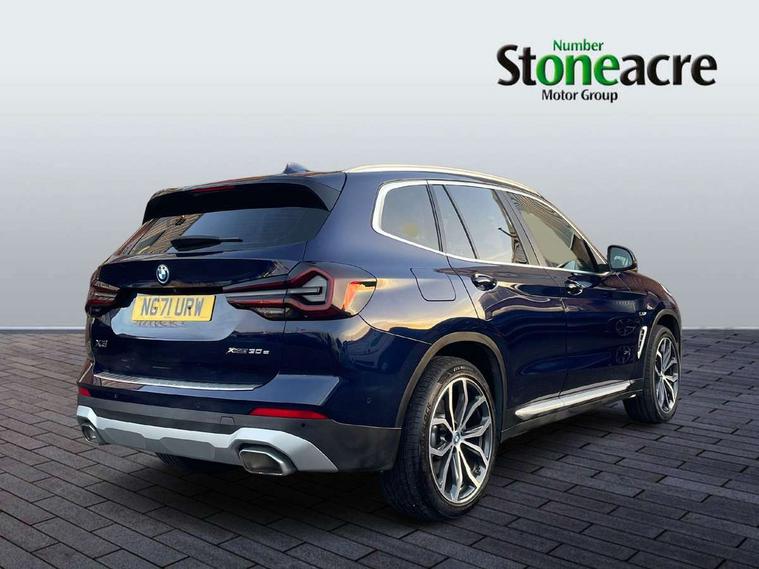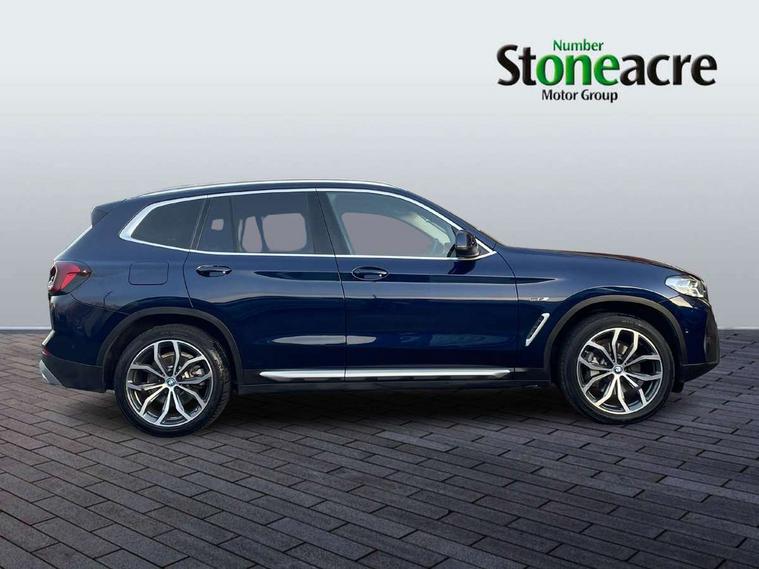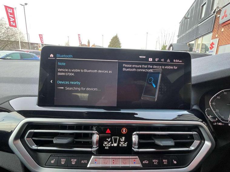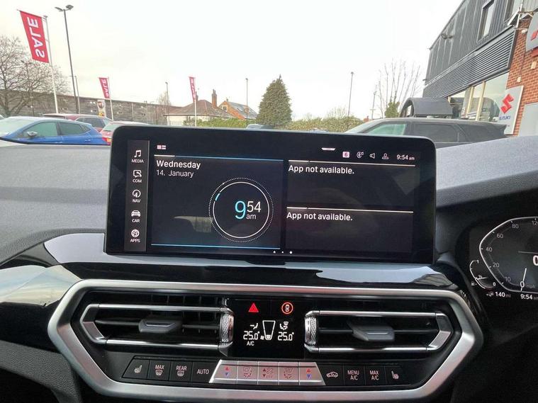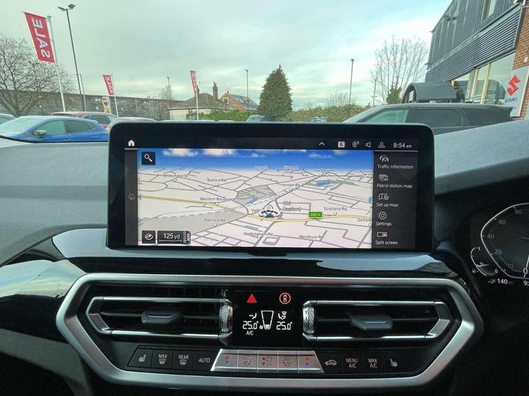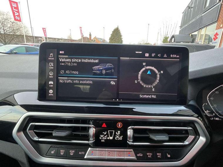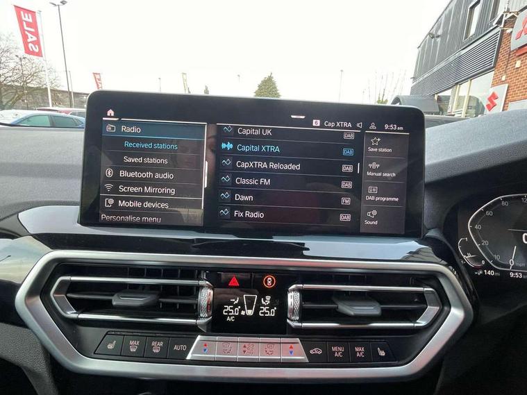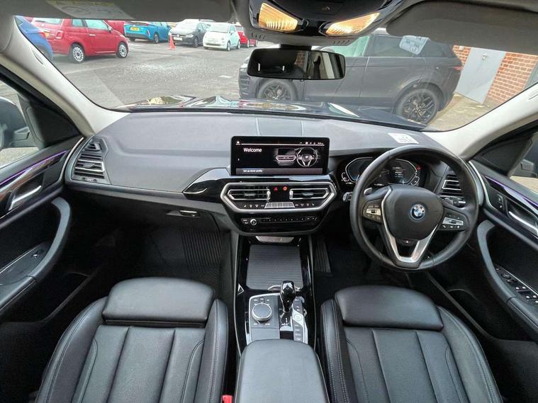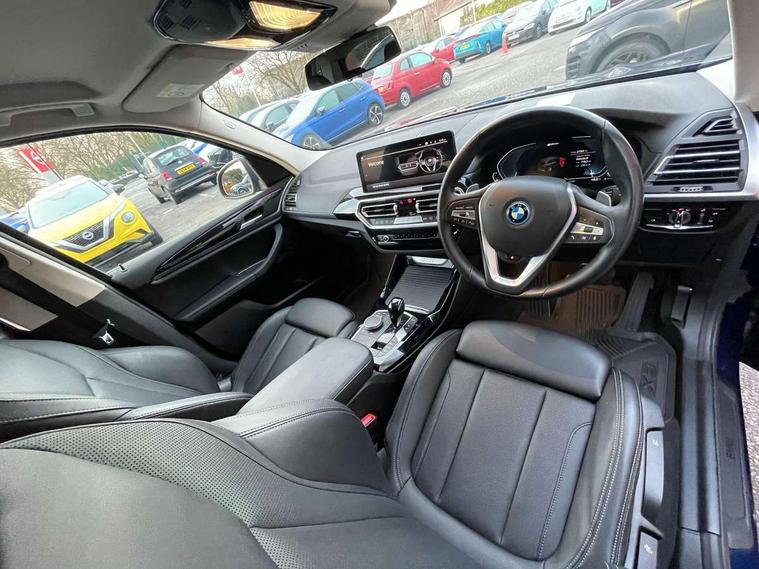 Active Guard, Attentiveness assist, BMW Live Cockpit Professional nav system including 12.3" instrument display + 12.3 high resolution control display, BMW Online services, BMW Teleservices, Brake pad wear indicator in front and rear, Check Control warning system for monitoring of lights and door/luggage compartment open warning, Condition based service - BMW service history, electronic service booklet, integrated owner's handbook, Connected drive services, Cruise control with brake function + speed limiter, Electric boot lid, Front/rear Parking distance control, iDrive Controller with 8 favourite buttons, Instrument cluster with speedometer with mph readout, tachometer, fuel gauge and oil temperature gauge, Lights on warning by audio warning signal when ignition is switched off, Oil sensor for level and grade, warning by check control system, On board computer - average speed+fuel consumption, service interval, clock/date, odometer/trip meter, outside temperature display and ice warning, Optimum shift indicator, Personal Profile - automatic lock when driving away selectable, Stop/start system, Variable sports power steering, Charging cable - Mode 2, Drive performance control with ECO PRO comfort + sport mode, eDrive exterior sound, Incorrect fuelling protection, Multi-link rear suspension, Performance Control, Sport automatic transmission with gearshift paddles, BMW professional radio/CD/MP3, DAB tuner, Acoustic glazing, Aluminium exterior trim, Automatic windscreen wipers and automatic headlight, Black finish on B pillars, Body colour door handles, Body colour electric adjust heated aspherical door mirrors, Body colour roof mouldings, Body coloured bumpers, Direction indicator, side repeaters, integrated in exterior mirrors, Dynamic brake lights, Exhaust tailpipes - dual, round, split left and right with chrome finisher, Fingertip control / anti-trap function on electric window, Folding wing mirrors with auto dimming, Follow me home headlights, Front and rear bumper system with replaceable deformation elements, Front and rear electric windows, Glacier silver metallic matt in side sills, Gloss chrome tailpipes finishers, Green tinted heat insulating glass, Heated windscreen washer jets, High beam assistant, High level 3rd brake light incorporating LED Technology, Interior rear view electrochromatic mirror with automatic anti dazzle function, LED tail lights, Lightweight engineering, Matt aluminium roof rails, Model designation, Rear side wing doors, Rear wing door, Rear wiper, Shark fin antenna, Visible VIN plate, Welcome lighting, Windscreen wipers with adjustable interval, xLine exterior styling with underbody protection, 12V power socket in front centre console, 3 rear headrests, 3 spoke sports leather multi-function steering wheel, 3 zone automatic air conditioning, 4 lashing points to secure luggage, 40:20:40 split folding rear seat with loading system, 5 seats, Ambient lighting, Automatic interior light when door is opened/ignition switched off or via remote key, Foldable storage floor with compartment, Four grab handles integrated in roof lining, Front and rear bottle holders integrated into door trim storage compartments, Front and rear side armrests integrated into door trim, Front centre armrest with storage compartment, Front door sill finishers with BMW X-line designation, Front footwell lights, Front head restraints, Front sports seats, Front/rear courtesy lights with soft on/off dimming, Front/rear reading lights, Heated front seats, Isofix rear child seat preparation, Leather gear knob, Luggage area underfloor compartment, Luggage compartment lighting, Parcel shelf removeable and storable under boot floor, Reach and rake adjustable steering column, Rear centre armrest with 2 cupholders, Removable / retractable luggage cover, Seat backrest width adjustment, Sensatec perforated upholstery, Slope adjustable rear seats, Storage compartment in rear centre console and front/rear door trims, Sun visors with vanity mirrors and ticket pocket, Toolkit located in luggage compartment, Two front cupholders with removable oddments tray/lid, Connected pro pack - X3, Driving assistant pack - X3, ADB - Automatic Differential Brake, Anti-lock braking system (ABS) with brake assist, Automatic Stability Control (ASC), Battery safety cut-off, BMW emergency call, Brake drying, Brake energy regeneration, Braking pre-tensioning, Child locks on rear doors, Cornering brake control (CBC), Crash Sensor - activation of central locking release, hazard warning light and interior lighting, Deactivation of fuel pump in the event of a crash, Driver and front passenger front and side airbags with passenger deactivation and ITS front and rear head airbags, DSC+, Dynamic brake control, Dynamic Traction Control - DTC, Electromechanical parking brake, Hill descent control, Hill start assist, Seatbelt security check for front seats, Side impact protection, Three point seatbelts to all seats with front and outer rear pyrotechnic belt tensioners and seat belt force limiters, Two tone horn, Tyre pressure sensor, Ventilated front and rear disc brakes, Warning triangle and first aid kit, Central locking switch for all doors, fuel filler cap and luggage compartment, Electronic engine immobiliser, Locking wheel nuts, Remote control including two integrated key - one button for open/close all lockable content, windows and separate button for open luggage compartment, Remote control Thatcham category 1 alarm, Start/stop button with Comfort Go keyless engine start and auto Start/stop deactivation button, Low rolling resistance tyres, Tyre repair kit,