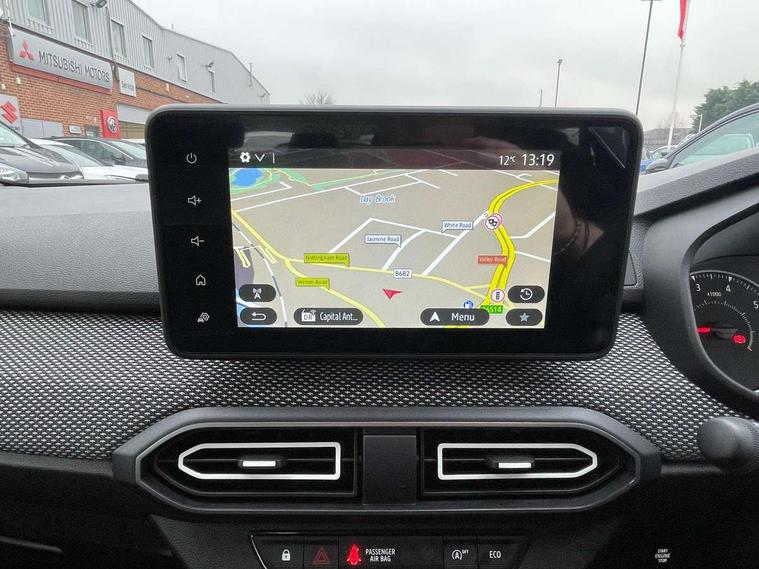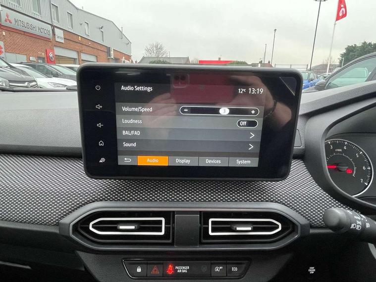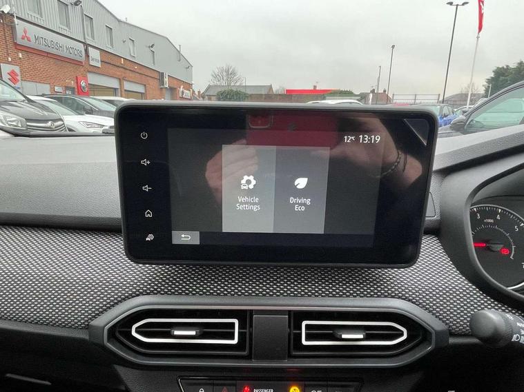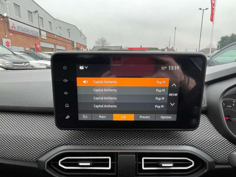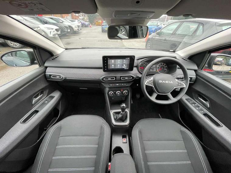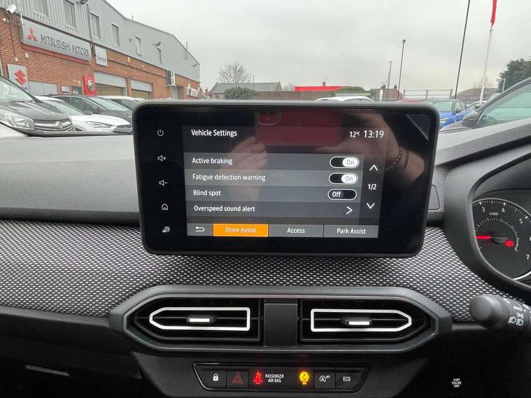 3.5" TFT instrument panel with on-board computer, Blind spot warning, Cruise control with speed limiter, Driver attention warning, eCall emergency call system, Eco mode, Electric power assisted steering, Emergency Stop Signal (ESS), Event data recoder, Front parking sensors, Lane departure warning, Lane keep assist, Rear parking sensors, Rescue code, Rev counter, Reversing camera, Speed limiter with audibe warning, Stop/start system, Traffic sign recognition with speed alert/Intelligent speed assist (ISA), 8" MediaNav - DAB Radio, smartphone replication, bluetooth, 6 Speakers, Apple CarPlay and Android Auto, Pre-wiring for radio and speakers, USB connection for data transfer and charging, USB socket, USB-C plug, USB-C plug rear, 3 speed windscreen wipers, Auto lighting, Automatic wipers, Black painted door mirrors, Black radiator grille, Body colour door handles, Door sill protection, Drivers one touch electric windows, Electrically adjustable and heated door mirrors, Front and rear body coloured bumpers, Front electric windows, Front fog lights, Heated rear window, High level third brake light, LED automatic daytime running lights, LED Y shape Dacia signature lighting, Rear electric windows, Rear side wing doors, Rear wash/wipe, Shark antenna, Tinted windows, 1/3 to 2/3 split folding rear seats, 12 volt front socket, 12 volt rear socket, 3 height adjustable rear headrests, 3 seat rear bench, Automatic air conditioning, Black titane door panels, Driver and passenger vanity mirror with cover, Fabric upholstery, Fixed smartphone holder on dashboard, Flexible trunk floor, Fog grey air vents, Fog grey interior door handles, Front ceiling light, Gear shift indicator, Height adjustable drivers seat with armrest, Height adjustable front headrests, Height/depth adjustable steering wheel, High central armrest with console storage, Isofix points for child seats in both outer rear seats, Journey carpets mats, Removable phone support, Single front passenger seat, Soft feel steering wheel, Steering wheel controls, 3x3 point rear seatbelts, 6 airbags - Driver, front passenger, curtain and side airbags, ABS and Emergency brake assist, Advanced emergency braking system, Alcohol imoboliser predisposal, Automatic emergency braking system, Child locks on rear doors, Door open visual and audible warning, EBD - Electronic brakeforce distribution, Electronic parking brake, ESC (Electronic Stability Control), ESP (Electronic Stability Program) + Hill Start Assist, Front seatbelt pretensioners, Height adjustable front seatbelts, Seatbelt reminder for driver and front passenger, Side impact protection, Tyre pressure monitor, Automatic central locking, Engine immobiliser, Keyless entry, Remote central locking, Decopart on instrument panel and door with textile, 16" Alloy wheels Randia,