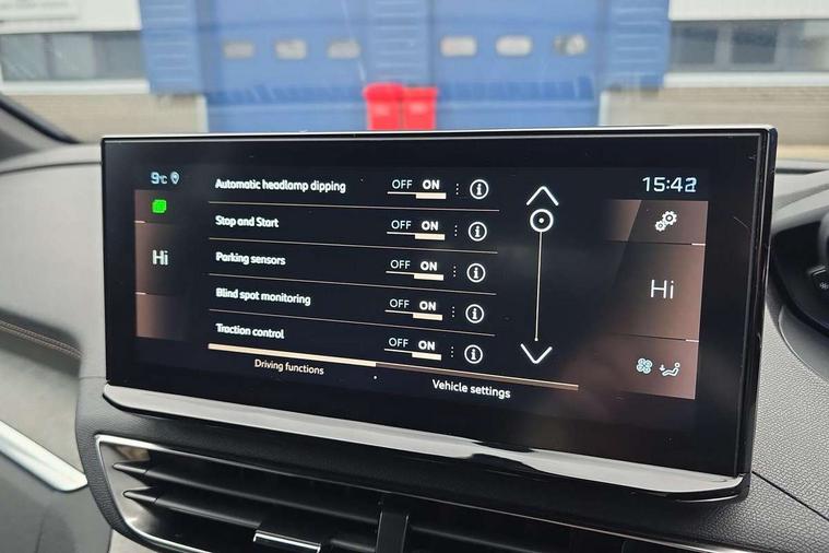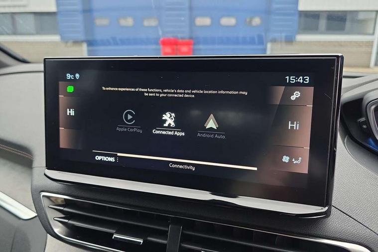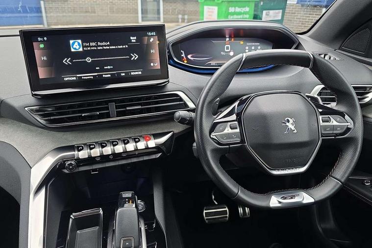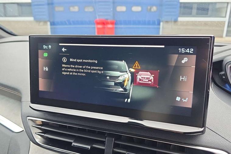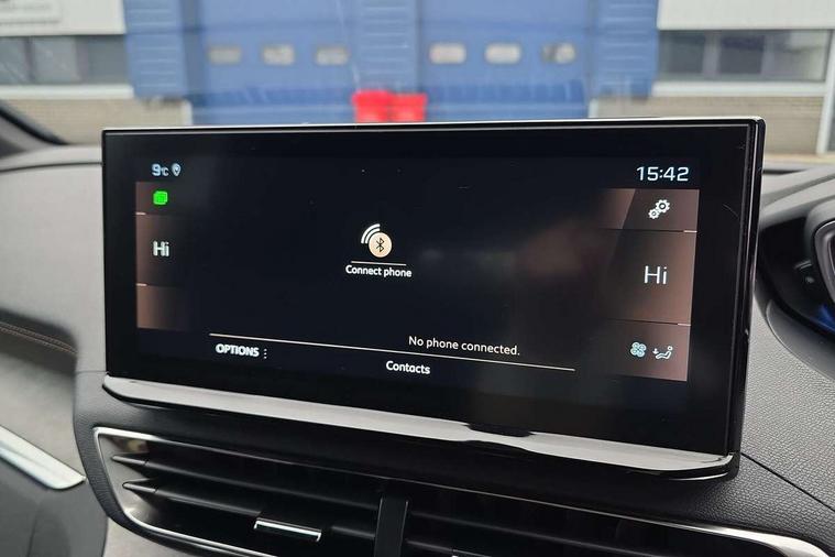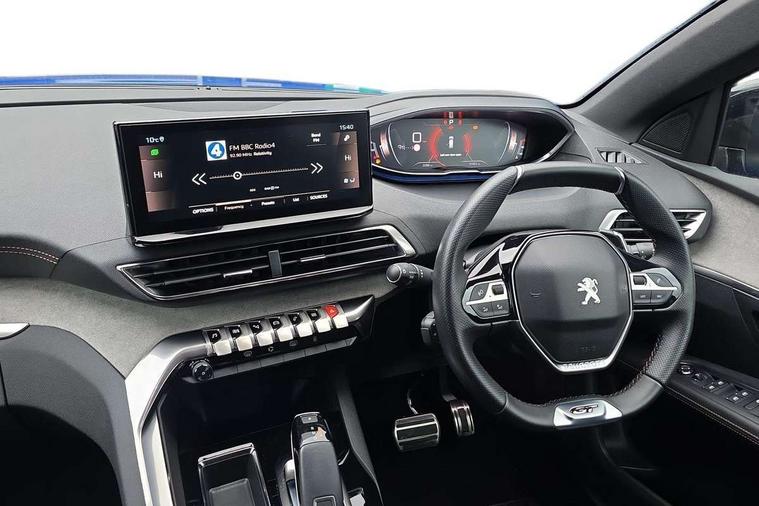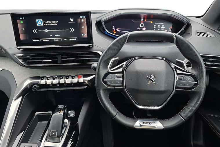 3D connected navigation with 10" HD touchscreen + voice recognition system, Apple car play and Android auto, Bluetooth telephone facility, Drive modes select (Eco, normal and sport), Driving Time Warning (DAA1), Emergency services call system, Extended traffic sign recognition, Exterior temperature indicator with ice warning, Front and rear parking sensors, Lane departure warning system, Mirror screen with mirror link, apple carplay and android auto, Multi function trip computer, Peugeot i-cockpit with compact multi-function sports steering wheel, PEUGEOT i-Cockpit with configurable 12.3" Head-up digital instrument panel, Rear passenger USB charging sockets (x2) (type A), Speed limit recognition and recommendation, Dynamic stability control and electronic anti-skid system, Stop/start function, DAB Digital radio, USB socket, Auto self levelling headlights, Automatic hazard light activation upon heavy brake application, Automatic triggered rear windscreen wiper in reverse gear, Black with chrome detailed front wing trim, Body colour door handles, Body colour rear roof spoiler with stainless steel edging trim, Body protectors (bottom of front and rear bumpers + wheel arches + protection at bottom of doors) in black, Dark tinted rear side windows + tailgate window, Diamond Black door mirror shells, Door mirror mounted LED courtesy floor lighting, Electric folding door mirrors with exterior courtesy LED lighting, Electric operated/heated door mirrors, Fog Mode, Front windscreen wiper with magic wash cleaning system, Full LED headlights with LED fog lights with static cornering function, Gloss black B and C pillar and aerodynamic deflector trim, Gloss black front bumper air scoops, Gloss black rear cluster connecting strip, Gloss black windscreen trim, GT emblem in satin copper (front wings and tailgate), Headlights left on audible warning, Heated rear windscreen with integrated antenna, LED daytime running lights, LED front indicator, LED rear number plate lighting, LED side indicator lights integrated into door mirrors, LED third brake light, One touch electric front/rear windows with pinch protection, Rear LED Peugeot signature 'Claw Effect' lights, Rear side wing doors, Stainless steel roof arches, Twin exhaust tailpipe, 1/3 to 2/3 split folding rear seats, 12V Sockets in dashboard, rear cabin and load area, 2 cupholders in front centre console, 2 cupholders in rear armrest, 2 x Rear reading spotlights, 2x Rear coat hooks, 3x Isofix child seat fittings in the front passenger and outer rear seats, 4 Grab handles retractable and damped, Aikinite stitching in armrest, gear lever and dashboard facia, Aluminium pedals, Blue ambient lighting for connecting zone, Blue ambient lighting to front door panels, central storage and cupholders, Blue ambient lighting to headup instrument panel, Centre front armrest with butterfly wing opening and illuminated storage compartment, Driver seat manual adjustment (longitudinal and back rest angle), Dual zone automatic climate control, Electric power steering with reach and rake adjustable steering column, Flocked front door pocket interior with blue ambient lighting, Flocked glovebox interior, Foldable front passenger seat with picnic table, Footwell illumination, Front interior light with 2 reading spotlights and rear interior light with timer, Front passenger seat manual adjustment (longitudinal and back rest angle), Front seat back map pockets, Gear shift indicator, Illuminated glovebox, Individual left and right controls in boot for seat folding, LED interior lighting in storage spaces and load area, LED roof interior lighting, Mistral floor mats with Aikinite contrast stitching, Mistral full grain perforated leather steering wheel with aikinite stitch detail and satin chrome 'GT' emblem, Rear bench seat with central armrest and ski hatch, Rear centre console ventilation system, Roof lining - Mistral black, Satin chrome dashboard trim, Satin chrome digital instrument panel and touchscreen trim, Satin chrome front door panel recess trim, Satin chrome interior door handles, Satin chrome scorpion's tail and toggle switch trim, Seatbelt not fastened audible and visual alert for front seats, Seatbelt unfastened on the move audible and visual alert for front and rear seats, Sunvisors with illuminated vanity mirrors, Two position boot floor, Drive assist plus pack - 3008, Visibility pack - 3008, 3x Rear three-point retractable seatbelts with force limiters in the outer rear seats, ABS (Anti-lock Braking System) with EBD (Electronic Brakeforce Distribution) and EBA (Emergency Braking Assistance), Adaptive driver and front passenger airbags with passenger airbag deactivation function, Driver and front passenger side airbags, Electric child locking functionality on rear windows and doors, Electric parking brake, Front and rear curtain airbags, Front optimised safety headrests and 3 x rear retractable headrests with height adjustable, Front three point retractable seatbelts with pre tensioners and force limiters, Front ventilated disc brakes and rear disc brakes, Hill start assist, Two tone horn, Automatic door locking when moving off, Electronic immobiliser, key operated exterior door lock from the left hand door, Perimetric and volumetric alarm with lift and tilt sensor, Peugeot Open and Go System, Remote control central locking with two plip keys, Puncture repair kit including compressor, sealant cartridge and towing eye,