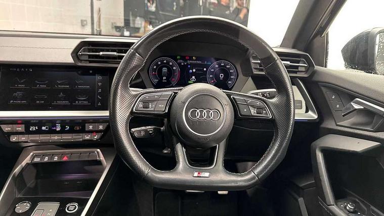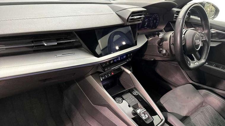 Audi connect emergency call and service, Audi drive select (Auto, Comfort, Dynamic, Efficiency and Individual), Audi smartphone interface, Audi virtual cockpit plus - 12.3" full HD resolution dynamic digital instrument cluster, Automatic start/stop system with recuperation, Bluetooth interface, Collision avoidance assistant, Electromechanical power speed sensitive steering, Lane departure warning system, MMI Navigation Plus with high resolution 10.1" colour touch screen display, Service indicator, Trip computer, Voice control system with natural language interaction, Sports suspension, 2xUSB-C connection with data and charging functions, 6 passive loudspeakers, DAB Digital radio, 3rd brake light, Acoustic glass windscreen, Audi matrix LED headlights with LED rear lights + dynamic front and rear indicators, Auto dimming frameless rear view mirror, Body colour front spoiler blade, Electrically adj heated/folding + automatically dimming exterior mirrors + automatic kerb side function for passenger side exterior mirror, Front electric windows, Headlight washers, Illuminated aluminium inserts front door sills with S logo, Integrated LED indicators in door mirrors, LED daytime running lights, Light and rain sensors, Privacy glass - dark tinted rear window, rear door and side windows, Rear diffuser in grained matt black, Rear electric windows, Rear side air outlets in grained matt black, Rear wiper, S roof spoiler, 12V socket and storage compartment in front centre console, 4 way electrically adjustable lumbar support for driver and front passenger, 40/20/40 split folding rear seat bench with cupholder, Black cloth headlining, Dual zone electronic climate control, Electrically adjustable front seats for driver's side, Front and rear centre armrest in leather, Front and rear headrests, Front/rear floor mats, Heated front seats, Height and reach adjustable steering wheel, Interior lighting - glove compartment light and right hand side, Luggage compartment floor covering, Seat side bolsters, Stainless steel pedals and front footrest in black, Aluminium interior elements pack - A3 Sportback, Black styling pack - A3 Sportback, Dinamica microfibre/mono.pur 550 artificial leather pack - A3 Sportback, Extended ambient lighting pack - A3 Sportback, LED interior lighting pack - A3 Sportback Edition 1/Vorsprung, 3x3 point rear seat belts, Driver and front passenger airbag with passenger airbag deactivation, Electronic Stabilisation Control (ESC) including ABS, ASR and EDL, First aid kit with warning triangle and 2 safety vests, Front side airbags with head airbags and interaction airbag, Hill hold assist, Pre-sense front with pedestrian and cyclist detection, Seatbelt monitoring, Tyre pressure loss indicator, Anti theft alarm, Anti-theft wheel bolts, Electronically operated child lock, Immobiliser, Remote control central locking, Accent surfaces in the dashboard and centre console in platinum grey silk effect paint finish, Dark spectrum aluminium inlays, 19" 5 arm trapezoid design alloy wheels in titanium matt grey with diamond cut finish,
