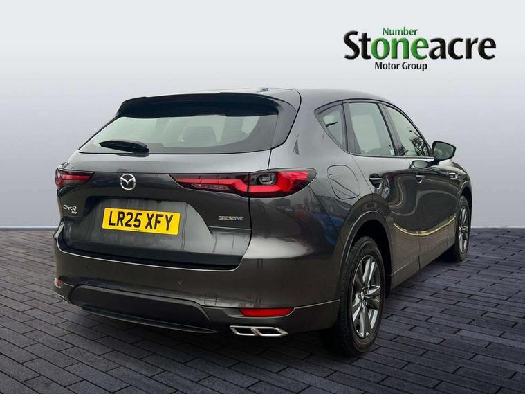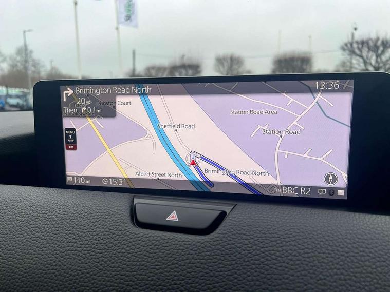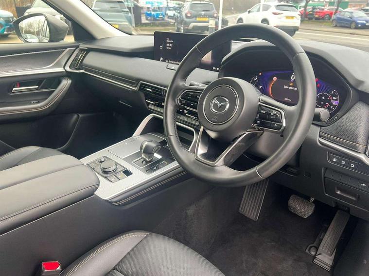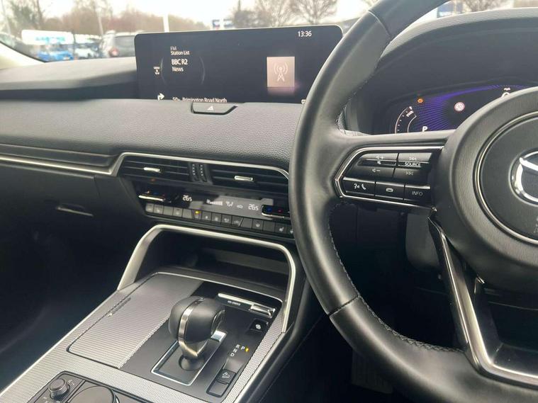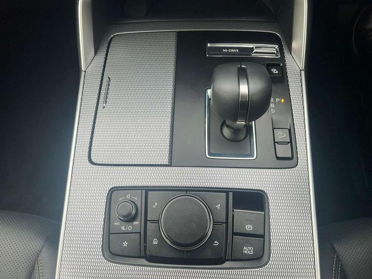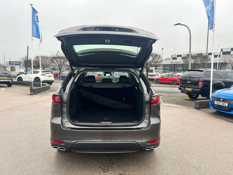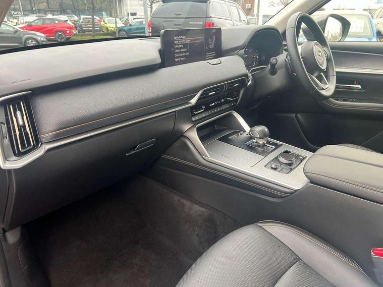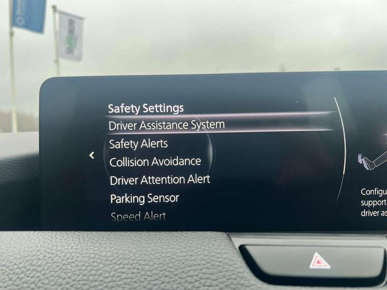 Emergency lane keeping with blind spot assist, Low washer fluid warning light, 12.3" Colour entertainment centre display with mazda connect infotainment, 12.3" TFT Colour display, Adjustable speed limiter, Blind spot assist, Blind spot monitoring with rear cross traffic alert, Cruise control, Distance alert system, Driver attention alert system, E-call with GPS, Emergency stop signalling system, Exit warning function, Front and rear parking sensors, Integrated bluetooth, Intelligent speed assist, Kinematic posture control, Lane keep assist system (LAS) with Lane departure warning system (LDWS), Mazda Navigation System with european mapping, Multimedia Commander, PAS, Power lift gate with handsfree function, Power liftgate, Power start/stop button, Reversing camera with static guide lines, Speed alert, Traffic sign recognition enhanced with mandated excessive speed warning, Trip computer, Windscreen projected colour active driving display, Wireless apple car play/android Auto, Type 2 Mode 2 cable for AC charging via UK 3-pin plug, 7.2 kw On board Charger, Mi-Drive (Normal, Sport, Off-road, Towing and EV mode), Paddle shift, Type 2 Mode 3 cable for AC charging via home or public charge points, AM / FM / DAB radio with 8 speakers, Steering wheel mounted audio/bluetooth controls, USB-C inputs (x2 front and x2 rear), Auto dimming driver's door mirror, Automatic headlight levelling, B-pillar and C-pillar garnishes in gloss black finish, Black wheel arch and side mouldings, Body colour roof spoiler, Body coloured bumpers, Body coloured door mirrors, Chrome finish signature wing in front grille, Chrome front side garish, Coming/leaving home lighting function, Dark plated headlight lense, Dusk sensing headlights, Electric front/rear windows with one touch auto up/down, Electrically adjustable, heated auto power folding door mirrors, Frameless auto dimming interior rear view mirror, Front kodo turn signal, Front wiper de-icer, Headlight washers, High beam control, LED 3rd brake light, LED headlamps, LED rear signature combination lamps, Piano black bar type front grille, Piano black window surrounds, Rain sensing front wipers with adjustable sensitivity and speed, Rear side wing doors, Rear wiper, Roof pillars and roof lining finished in lighter colour to soften the overall look, Signature LED daytime running lights, Silver decoration panel, 12v power outlet - front, 12V socket in boot, 3 height adjustable rear headrests, 3 seat bench in 2nd row, 40/20/40 split folding rear seats with quick levers in the boot, Cargo net, Chrome interior trim accents with steering wheel centre bezel, surround of engine start / stop button and glove box handle, Door panel trim vinyl leather with armrest, Driver and front passenger two rear grab handles with rear coat hooks, Driver and front passenger visors with covered vanity mirror and driver ticket holder, Driver seat manual slide, recline, height and seat tilt adjust, Driver, front passenger and two rear door pockets, Driver/passenger front seatback pockets, Dual zone climate control air conditioning with rear air vents, Featuring black vinyl leather dashboard trim with titanium coloured accents, Folding rear centre armrest with two cup holders, Front and rear signature illumination, Front centre storage with two cupholders, Front down lamp with front and rear foot lamps, Front headrests, Front passengers seat manual slide, recline and height adjustment, Glovebox illumination, Heated front seats with 3 stage setting, Heated leather wrapped steering wheel, ISOFIX child seat anchorage points attached on outer rear seats, Karakuri tonneau cover, Leather upholstery, Leather wrapped gear shift knob, LED illumination luggage compartment, Manual telescopic and tilt adjustment steering wheel, Practical and spacious front centre armrest storage, Rear seat recline function for rear passenger comfort, Remote fold down rear seats, Roof mounted sunglasses holder, Single front passenger seat, 3 point ELR front seat belts x2 with pretensioners, 3 point ELR rear seat belts, Active bonnet, Anti-lock braking system (ABS), Drivers knee airbag, DSC - Dynamic Stability Control, Electronic parking brake with auto disengage function and auto hold function, Front and rear curtain airbags, Front dual stage driver and single stage front passenger airbags, Front passenger airbag cut-off switch, Front side airbags, Front smart city brake support, Hill decent control, Hill launch assist, Manual rear child locks, Seatbelt reminder for driver/front passenger and rear seats, Traction control, Tyre pressure monitoring system (TPMS), Remote central locking with deadlocking and automatic door lock when driving, Smart keyless entry, Thatcham accredited alarm and immobiliser, Mesh metal film centre console panel, 18" Grey metallic alloy wheels, Emergency tyre repair kit,