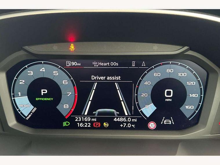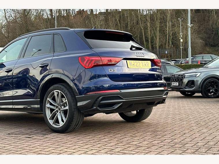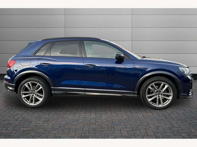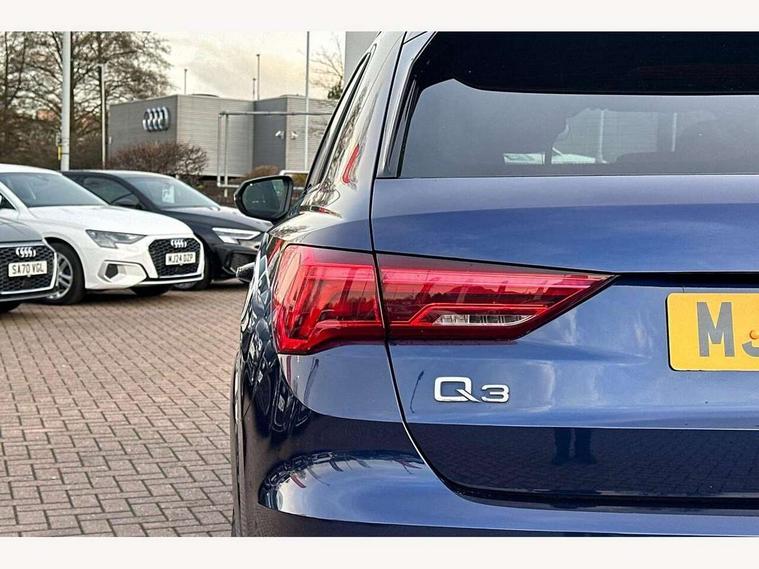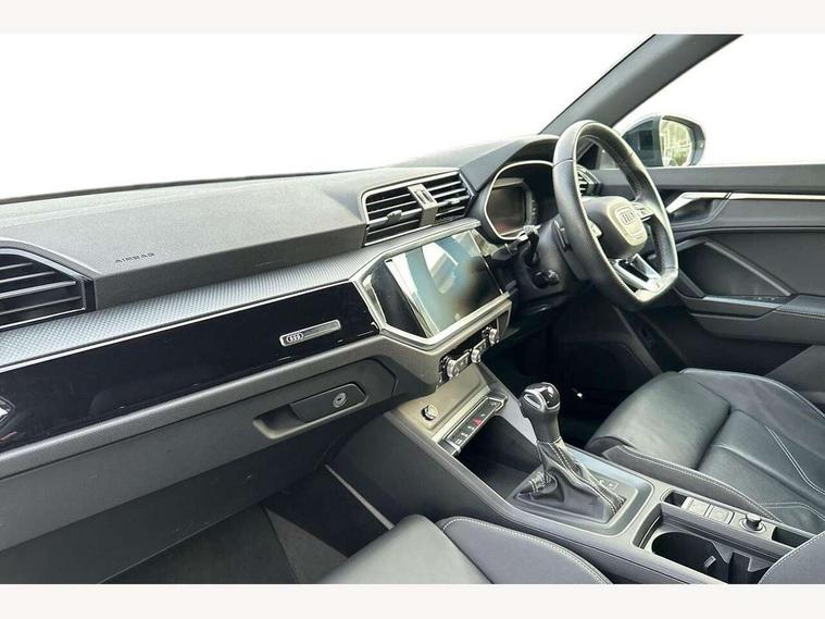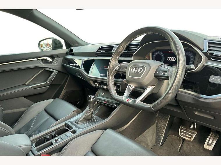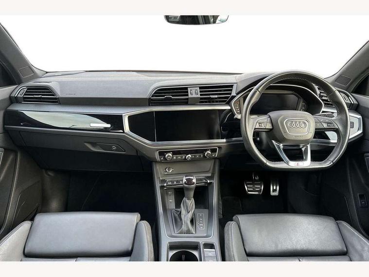 Amazon alexa Integration, Audi connect safety and service (e-call), Audi drive select, Audi lane departure warning, Audi Virtual Cockpit - 10.25" display, Bluetooth interface, Camera based traffic sign recognition, MMI Navigation Plus with high resolution 10.1 inch touchscreen colour display, Power operated tailgate, Progressive steering, Service interval indicator, Smartphone interface includes wireless Apple carplay/Android Auto, Start stop system with recuperation, Voice control system with natural language interaction, 48V Mild hybrid technology, Sports suspension, 2 USB-C ports with charge and data functions, 6 passive loudspeakers, DAB digital radio module, Acoustic windscreen, Auto dimming frameless rear view mirror, Black roof rails, Electrically folding, adjustable and heated door mirrors with integrated LED side indicators and kerb view function for passenger side, Front and rear electric windows, Front fog lights, Grille vertical bars in aluminium silver/Matt, High gloss black finish B and C pillars, LED headlights with LED daytime running lights, LED rear lights, LED third brake light, Privacy glass dark tinted rear and rear-side windows (from B-pillar backwards), Rain and light sensors, Rear diffuser strip in matt titanium black, Rear side wing doors, Rear wiper, S line bumpers in contrasting Manhattan grey, Variable front intermittent wipers, 12V socket in rear centre console, 3 seat bench in 2nd row, 40:20:40 folding with manual adjustment for 60:40 forwards/backwards position and backrest angle, Adjustable rear seat bench/backrest with centre armrest and cupholder, Black cloth headlining, Dual zone electronic climate control, Front and rear black floor mats with contrast stitching in rock grey, Front and rear headrests, Front and rear roof module including reading lights, Front centre armrest, Glove compartment lighting, Height and reach adjustable steering wheel, Illuminated door sill trims with S logo, ISOFIX child seat mounting for front passenger with airbag deactivation and outer rear seat including top tether attachment point for outer rear seats, Luggage compartment light, Manual front seats with height adjustment, Perforated leather gearknob, Single front passenger seat, Stainless steel luggage compartment sill finisher, Stainless steel pedals, Black styling pack - Q3, Non smoking pack - Q3, 3x3 point rear seatbelts, 6 airbags - Driver, front passenger, curtain and side windows, Audi pre-sense front with pedestrain and cyclist recognition, Electromechanical parking brake, Electronic stabilisation control including ABS, ASR and EDL, Front seatbelt reminder, Hill descent control, Hill hold assist, Manual child lock in rear doors, Pre sense basic, Seatbelt monitoring, Tyre pressure warning, Warning triangle and first aid kit, Anti theft alarm, Anti theft wheel bolts, Immobiliser, Remote central locking, Detail dashboard around MMI touch colour display in glass look, black with surround in aluminium look, Leatherette door armrest, Piano black inlay, Tool kit, Tyre repair kit,