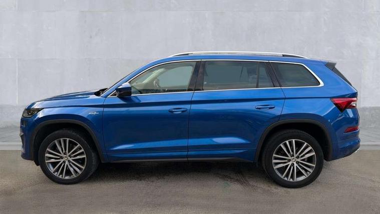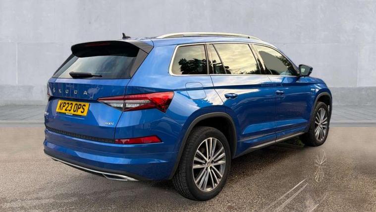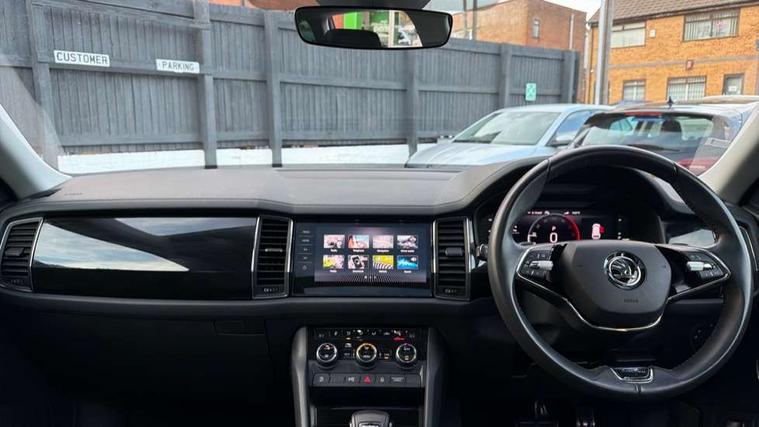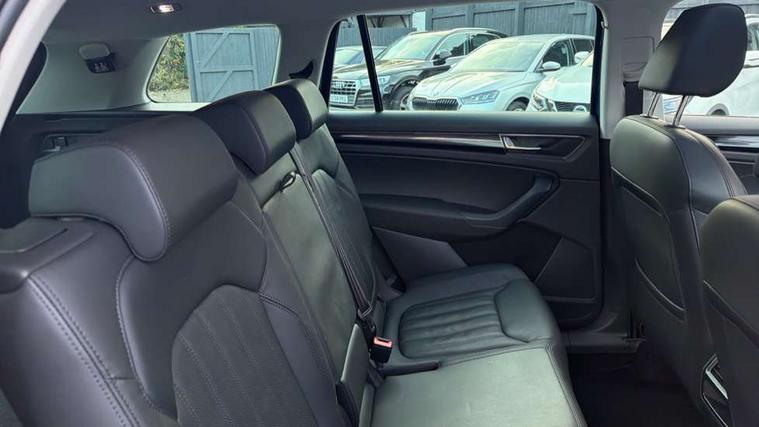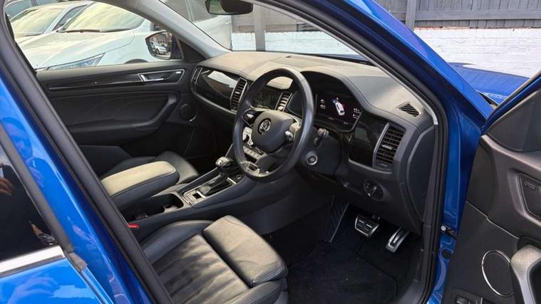 Area view, Blind spot detection system, Bluetooth system, Columbus satellite navigation with 9.2" touchscreen, integrated Wi-Fi, web radio, Digital voice enhancement, e call+, ECO Stop/start function, Exterior temperature indicator, Progressive steering, Smartlink wireless for apple carplay and wired for android auto, Speed limiter, USB C Port x 2 in front centre console, Virtual Cockpit - 10.25" digital display, Wireless charging, Canton sound system, DAB Digital radio, Aero front windscreen wipers with intermittent function, Aero rear window wiper, Auto dimming rear view mirror, Black wheel arch surrounds, Body colour bumpers, Body colour door mirrors and handles, Body colour door panels, Chrome front grille, Chrome roof rails with chrome window surround, Electric adjustable/heated/folding door mirrors, driver side auto dimming with boarding sports and memory function, Electric front and rear windows, Extended rear spoiler with finlets in gloss black, Front fog lights, Full LED matrix headlights with AFS (adaptive front light system), cornering function and AWL (all weather lighting system), Headlight washers, Heated rear window, Invisible tailpipe, L&K front and rear bumpers including lower rear chrome strip, LED daytime running lights, LED rear fog light, LED third brake light in rear spoiler, Light assistant (coming/leaving home/tunnel light), Off-road style lower front bumper element, Panoramic sunroof, Privacy glass, Rain and light sensors, Rear LED lights (high functionality) with welcome effect and dynamic indicators, Rear side wing doors, Safety reflectors on front and rear doors, Window control switches with black trim, Without engine designation, 12V socket in boot, 2 rails with 2 hooks, 2 seat bench in 3rd row, 3 seat bench in 2nd row, 4 foldable roof handles with rear coat hooks, 60:40 foldable rear seat with sliding adjustment and backrest angle adjustment, Aluminium pedals, Bottle holders in door panel in the 1.5 litre front and 1 litre rear, Cargo storage compartments, Chrome headlight control button, Chrome interior door handles, Coat hooks on B pillar, Covered storage compartment on driver side, Decorative door sill covers, Front and rear door armrest with black adductor trim, Front centre armrest with storage compartment, cup holder and 12V socket, Front courtesy lights, Gear shift lever with chrome frame and black gloss insert, Grey stitching in front and rear armrests and door armrests + door inserts, Height adjustable front headrests, Illuminated and cooled glovebox, Illuminated luggage compartment, Isofix child seat fittings in outer rear seats with top tether, Manually adjustable steering column, Net programme in boot (1x horizontal Net, 2x vertical Nets), Overhead glasses storage compartment, Pollen filter, Rear centre armrest with cupholders, Single front passenger seat, Sliding trunk cover, Small Bags on the inner sides of the front backrests, Sunvisors with illuminated vanity mirrors, Three rear height adjustable headrests, Ticket holder on A Pillar, Umbrella in door panel, Variable boot floor, LED Interior light pack - Kodiaq, Auto door release and activation of warning lights, Child locks on rear doors, Driver and front passenger airbag with knee airbag and front passenger airbag deactivation, Electronic parking brake with hill start assist, Emergency rear braking signal, ESC (incl. ABS+MSR+ASR+EDS+HBA+DSR+RBS+MKB), Front assist with autonomous emergency braking, Front side airbags with curtain airbags, Fuel cut off safety device, Height adjustable front 3 point seatbelts + pretensioners, Hill hold control, Rear disc brakes, Safety vest holder in door, Seat belt reminder for all seats, Tailgate unlocking from outside, Three point rear seat belts, Two tone horn, Tyre pressure monitor, Alarm with interior monitoring and tilt sensor with safe function, Anti-theft wheel bolts, Immobiliser, Keyless entry and start system (KESSY), Remote central locking with 2 keys, Grey stitching in dashboard, Piano black decorative inserts, Plaquette L&K front fenders, Temporary spare wheel (space saver),