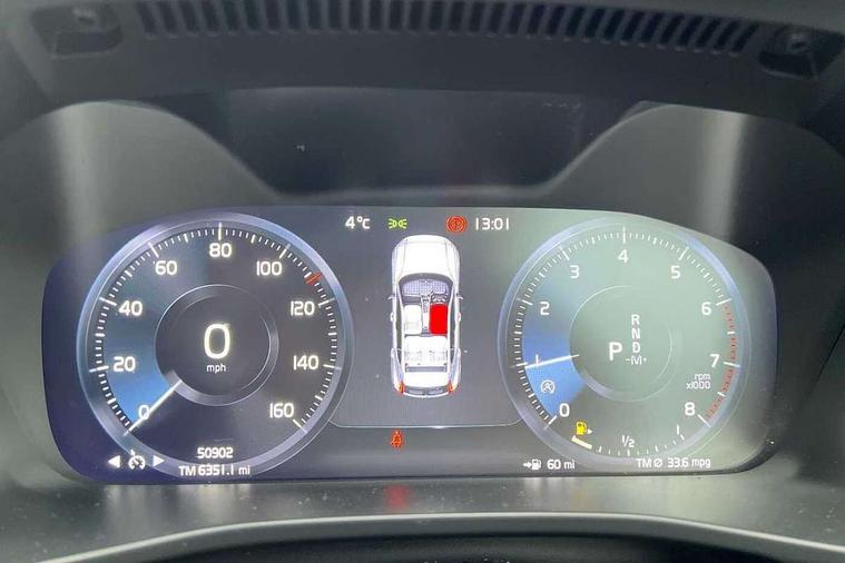 12.3" Active TFT crystal driver's instrument display, 9" centre console portrait touch screen, Adjustable steering wheel force, Bluetooth hands free telephone kit, Drive mode selector, Lane keep assist with driver alert control, Oncoming Lane Mitigation, Sensus navigation with European mapping and traffic information, Speed limiter, Speed sensitive steering, Voice activated control for key functions, Volvo on call, Sports chassis, DAB Digital radio, Steering wheel mounted remote controls, Adaptive brake lights with high level LED brake lights, Auto dimming interior mirror, Automatic headlamp levelling, Black stone door mirrors, Black stone roof, Colour coordinated auto folding and heated power door mirrors, Dark tinted windows for rear door side windows and cargo compartment, Dual integrated exhaust pipes with high gloss black surround, Front aluminium tread plates, Front and rear electric windows, High gloss black front and rear skid plate, High gloss black lower front bumper, High gloss black mesh front grille with high gloss black surround, High gloss black roof rails, High gloss black sensus surround deco, High gloss black window trim, Home safe and approach lighting, LED front fog lights, LED Headlights + Active high beam incorporating daytime running lights, Rain sensor with automatic windscreen wiper activation, Rear side wing doors, Rear wiper, Roof antenna, Roof spoiler, Visible VIN plate, 12V socket in front tunnel console and luggage compartment, 2 zone electronic climate control and rear air vent, 3 seat bench in 2nd row, 60/40 split folding rear seat, Ambient front door and instrumental panel lighting, Centre console cupholders and storage, Charcoal headlining, Driver's side lower dashboard credit card storage compartment, Front door pocket and front cupholder illumination, Front footwell illumination, Front headrests, Front reading light and theatre lighting, Front tunnel net pocket and integrated waste bin, Glovebox bag hook, Height/reach adjustable steering column, High gloss centre tunnel deco, Illuminated glovebox, Illuminated luggage compartment, Illuminated tailgate, Illuminated vanity mirrors, Isofix attachments on outer rear seats, Key integrated remote, Leather gearknob, Load protection net, Multi directional lumbar support, Multicolour theatre lights, Rear armrest / integral cup holders / storage tray, Rear coat hook, Rear reading and courtesy lights, Single front passenger seat, Sports Leather steering wheel, Sports pedals, Underfloor cargo storage, 3x3 point rear seatbelts, City safety includes pedestrian, cyclist and large animal detection and front collision warning with full auto brake, Drivers knee airbag, Dual stage driver/passenger airbags, Electronic parking brake with auto hold, First aid kit, Front and outer rear seatbelt reminder and pretensioners, Front seats SIPS airbags, Hill descent control, Hill start assist, Inflatable curtain, Passenger airbag cut-off device, Road sign information display, Run off Road Mitigation, Run off Road Protection, SIPS (Side Impact Protection System), Slippery road and hazard light alert, Stability and Traction Control with Spin control, Engine Drag Control and Corner Traction Control, Tyre pressure monitoring system, Vehicle deceleration control with Anti-lock Brake System, Electronic Brake Distribution and Emergency Brake Assist, Warning triangle, WHIPS whiplash protection system - front, Anti-theft alarm including immobiliser/volume sensor + level sensor, Care key with user defined top speed, Key integrated remote control central locking + fuel flap with deadlocking system and auto open/close power windows, Locking wheel nuts, Private locking for tailgate, Cutting edge aluminium inlay,