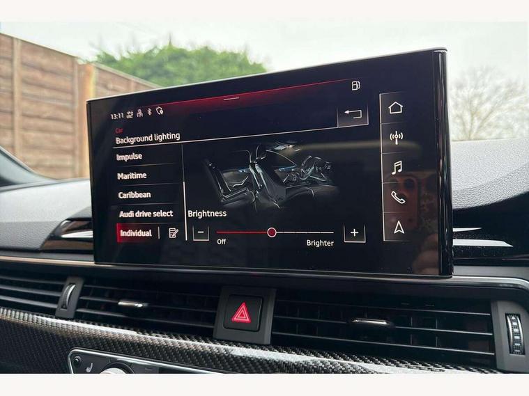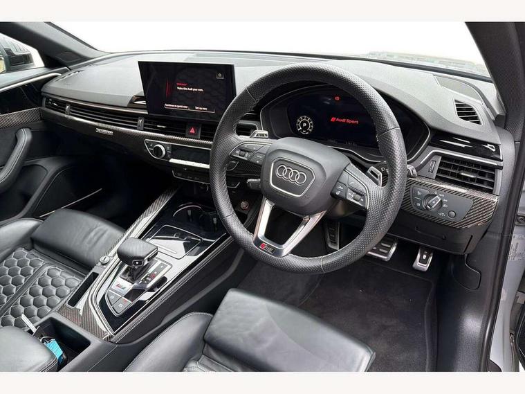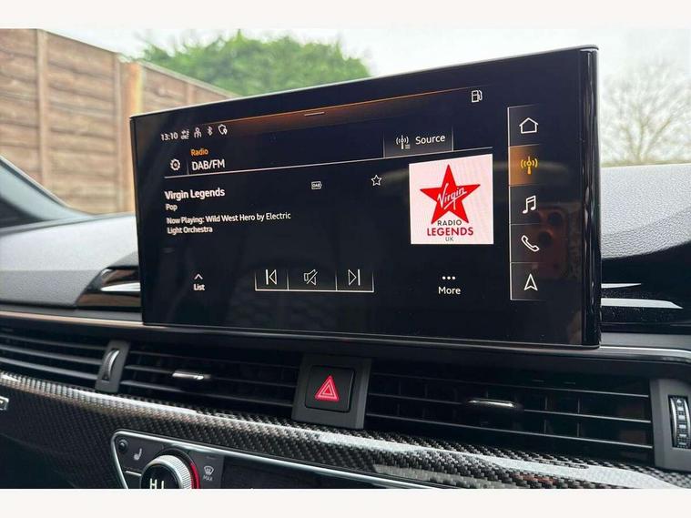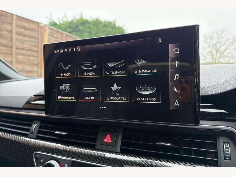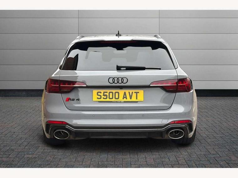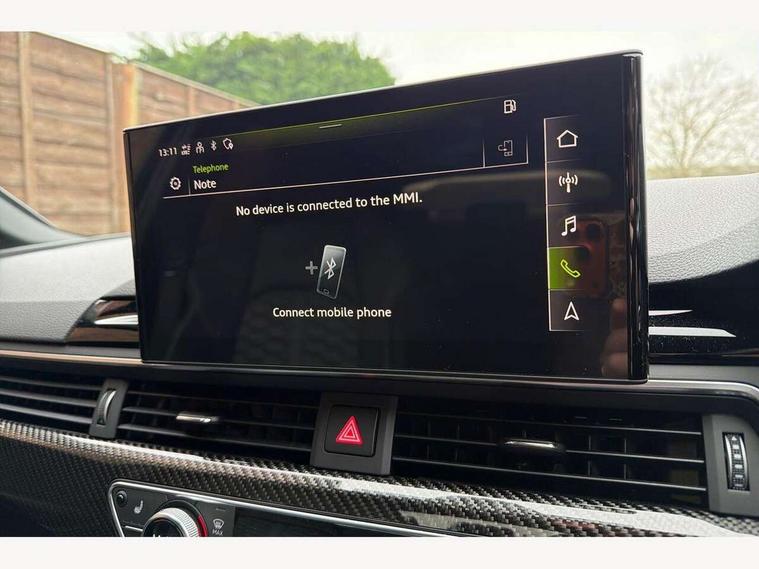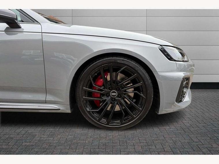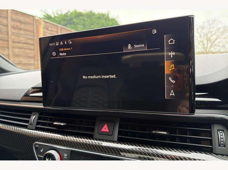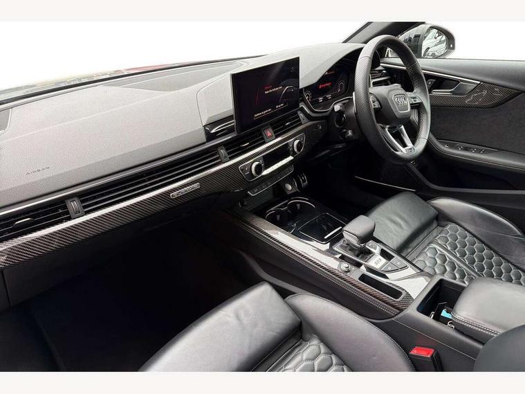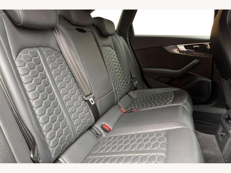 7" Colour driver information system, Amazon alexa Integration, Audi connect safety and service (e-call), Audi drive select, Audi side assist, Audi smartphone interface, Audi virtual cockpit with RS specific display, Automatic start-stop system with coasting functionality and efficiency programme, Bluetooth interface, Electromechanical power steering, Email, calendar and text messages displayed via MMI, MMI Navigation plus with MMI touch includes 10.1" high resolution colour MMI display, 3D map, Power opening/closing tailgate, Service interval indicator, Voice control system, 58 Litre fuel tank, Quattro sports differential, 2 USB charging ports, Audi sound system, DAB digital radio module, 3rd brake light, Acoustic windscreen, Audi Beam uses LEDs to project the RS logo onto ground as you exit your RS4, Audi matrix LED headlights with LED rear lights + dynamic front and rear indicators, Audi rings and lettering glossy black, Auto dimming rear view mirror, Automatic headlights + automatic windscreen wipers, Black roof rails, Blue tinted glass, Body colour door handles, Electric front windows, Electric rear windows, Electrically folding auto dimming/adjustable/heated door mirrors with memory function, LED side indicators and kerb view function for passenger side, Flared front and rear wheel arches, Front bumper with enlarged air inlets, Headlight range control, High beam assistant, High gloss black door mirror housing, High gloss black triangular aperture at rear door, Honeycomb design grille with quattro logo, Lateral air inlets next to front headlights, LED daytime running lights, LED indicators in door mirrors, Privacy glass with rear acoustic glazing, Rain and light sensors, Rear side wing doors, Rear wiper, Roof spoiler, RS 4 badges on grille and rear, RS4 dual branch chrome tailpipes with left and right oval pipes, 3 seat bench in 2nd row, 3 spoke multifunction plus leather steering wheel with heating and RS badging, 40/20/40 split folding rear seats with rear centre armrest, Black cloth headlining, Deluxe 3 zone electronic climate control, Electric load area cover, Electrically adjustable front seats, Fine nappa leather with contrast honey comb stitching + super sports seats with pneumatic massage function, Front centre armrest, Front headrests, Front/rear floor mats, Heated front seats, Height and reach adjustable steering wheel with full size airbag, Illuminated door sill trims with RS4 logo, ISOFIX child seat mounting and top tether, Leather door armrests and knee pad, Luggage compartment carpet, Perforated leather gear lever knob with contrast stitching, Rear headrests, Retractable load area cover, Single front passenger seat, Stainless steel pedals, Sunvisors with vanity mirrors, Carbon black styling pack - RS4, LED Interior light pack - RS4, Non Smokers pack, 3 point seatbelts on all rear seats, Adaptive driver and front passenger airbags, Electromechanical parking brake, Electronic stabilisation control including ABS, ASR and EDL, Enhanced braking system, Front head airbags, Front seatbelt pretensioners + load limiters, Front side airbags, Hill hold assist, Manual child lock in rear doors, Multi-Collision braking, Pop-up bonnet for pedestrian protection, Pre sense city, Rear side airbags, Seatbelt monitoring, Traction control, Tyre pressure warning, Variable restraint system, Warning triangle and first aid kit, Anti theft alarm, Anti-theft wheel bolts, Immobiliser, Keyless Go, Remote central locking, Remote control key with RS emblem, Carbon twill inlays, 20" 5 segment spoke evo design glossy black sport alloy wheels, Tool kit, Tyre repair kit,