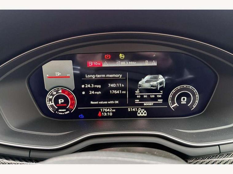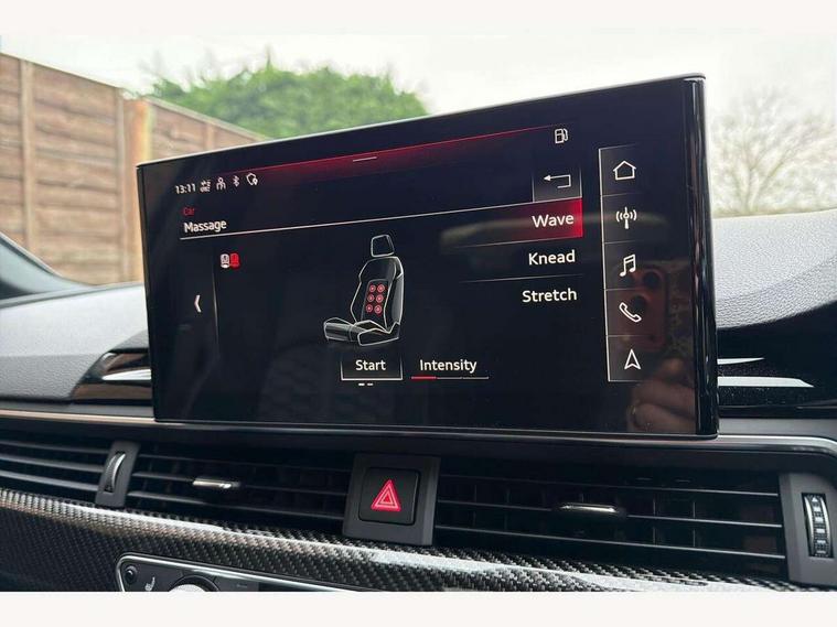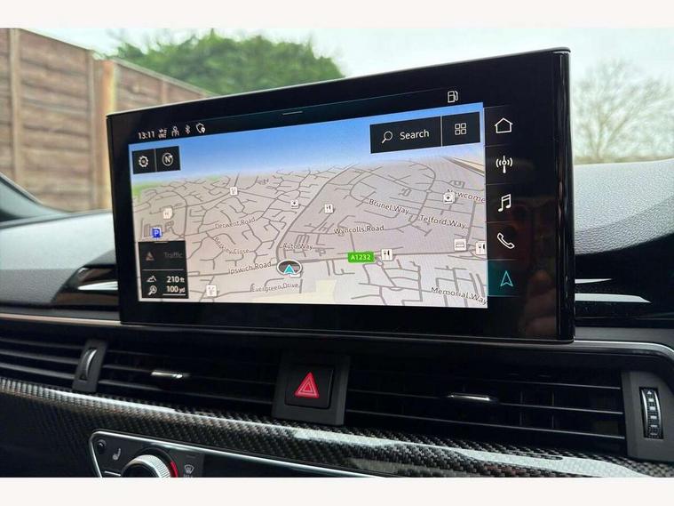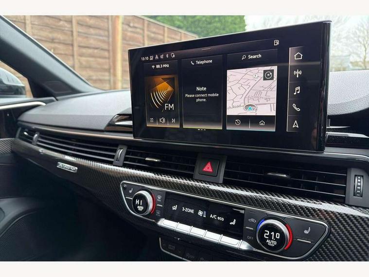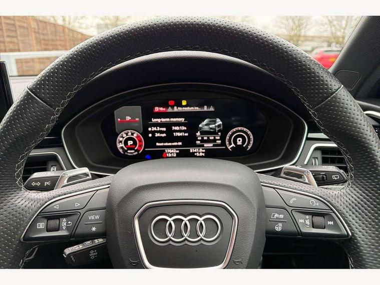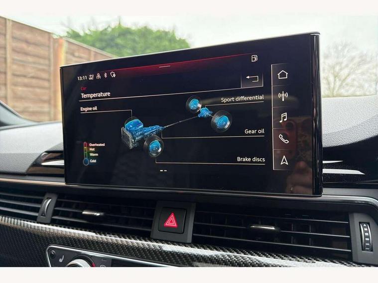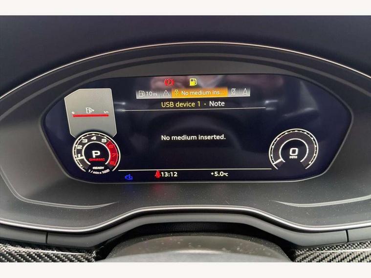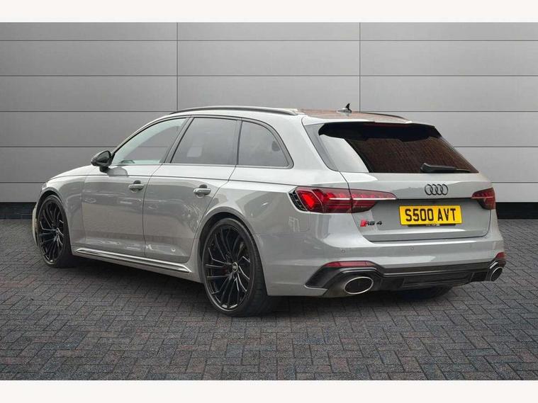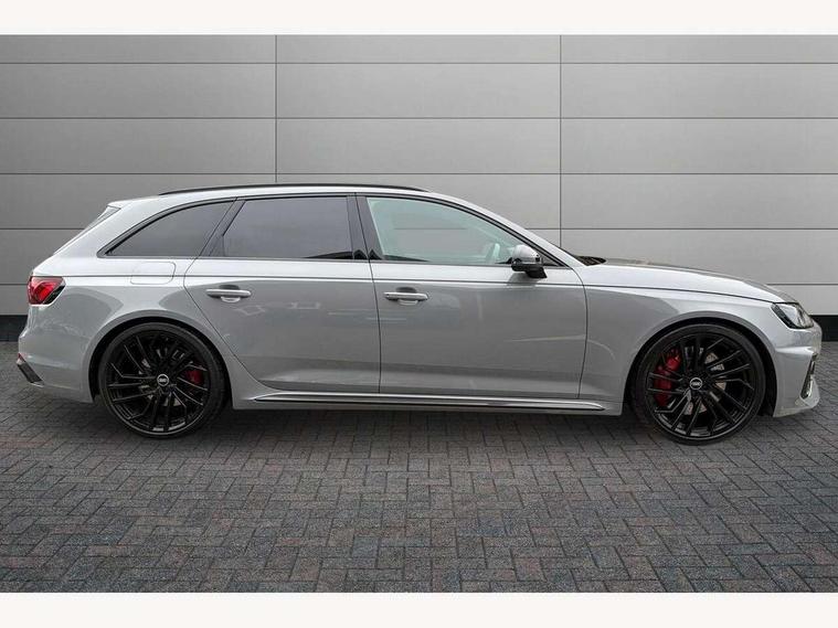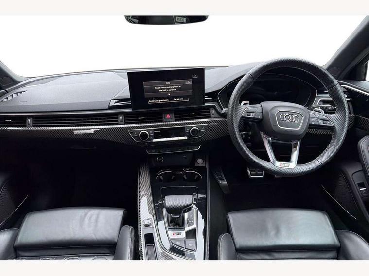 7" Colour driver information system, Amazon alexa Integration, Audi connect safety and service (e-call), Audi drive select, Audi side assist, Audi smartphone interface, Audi virtual cockpit with RS specific display, Automatic start-stop system with coasting functionality and efficiency programme, Bluetooth interface, Electromechanical power steering, Email, calendar and text messages displayed via MMI, MMI Navigation plus with MMI touch includes 10.1" high resolution colour MMI display, 3D map, Power opening/closing tailgate, Service interval indicator, Voice control system, 58 Litre fuel tank, Quattro sports differential, 2 USB charging ports, Audi sound system, DAB digital radio module, 3rd brake light, Acoustic windscreen, Audi Beam uses LEDs to project the RS logo onto ground as you exit your RS4, Audi matrix LED headlights with LED rear lights + dynamic front and rear indicators, Audi rings and lettering glossy black, Auto dimming rear view mirror, Automatic headlights + automatic windscreen wipers, Black roof rails, Blue tinted glass, Body colour door handles, Electric front windows, Electric rear windows, Electrically folding auto dimming/adjustable/heated door mirrors with memory function, LED side indicators and kerb view function for passenger side, Flared front and rear wheel arches, Front bumper with enlarged air inlets, Headlight range control, High beam assistant, High gloss black door mirror housing, High gloss black triangular aperture at rear door, Honeycomb design grille with quattro logo, Lateral air inlets next to front headlights, LED daytime running lights, LED indicators in door mirrors, Privacy glass with rear acoustic glazing, Rain and light sensors, Rear side wing doors, Rear wiper, Roof spoiler, RS 4 badges on grille and rear, RS4 dual branch chrome tailpipes with left and right oval pipes, 3 seat bench in 2nd row, 3 spoke multifunction plus leather steering wheel with heating and RS badging, 40/20/40 split folding rear seats with rear centre armrest, Black cloth headlining, Deluxe 3 zone electronic climate control, Electric load area cover, Electrically adjustable front seats, Fine nappa leather with contrast honey comb stitching + super sports seats with pneumatic massage function, Front centre armrest, Front headrests, Front/rear floor mats, Heated front seats, Height and reach adjustable steering wheel with full size airbag, Illuminated door sill trims with RS4 logo, ISOFIX child seat mounting and top tether, Leather door armrests and knee pad, Luggage compartment carpet, Perforated leather gear lever knob with contrast stitching, Rear headrests, Retractable load area cover, Single front passenger seat, Stainless steel pedals, Sunvisors with vanity mirrors, Carbon black styling pack - RS4, LED Interior light pack - RS4, Non Smokers pack, 3 point seatbelts on all rear seats, Adaptive driver and front passenger airbags, Electromechanical parking brake, Electronic stabilisation control including ABS, ASR and EDL, Enhanced braking system, Front head airbags, Front seatbelt pretensioners + load limiters, Front side airbags, Hill hold assist, Manual child lock in rear doors, Multi-Collision braking, Pop-up bonnet for pedestrian protection, Pre sense city, Rear side airbags, Seatbelt monitoring, Traction control, Tyre pressure warning, Variable restraint system, Warning triangle and first aid kit, Anti theft alarm, Anti-theft wheel bolts, Immobiliser, Keyless Go, Remote central locking, Remote control key with RS emblem, Carbon twill inlays, 20" 5 segment spoke evo design glossy black sport alloy wheels, Tool kit, Tyre repair kit,
