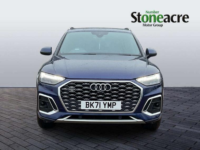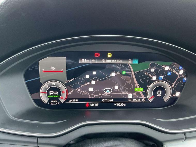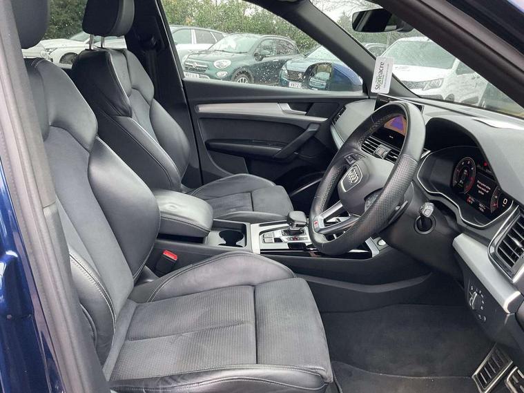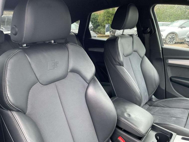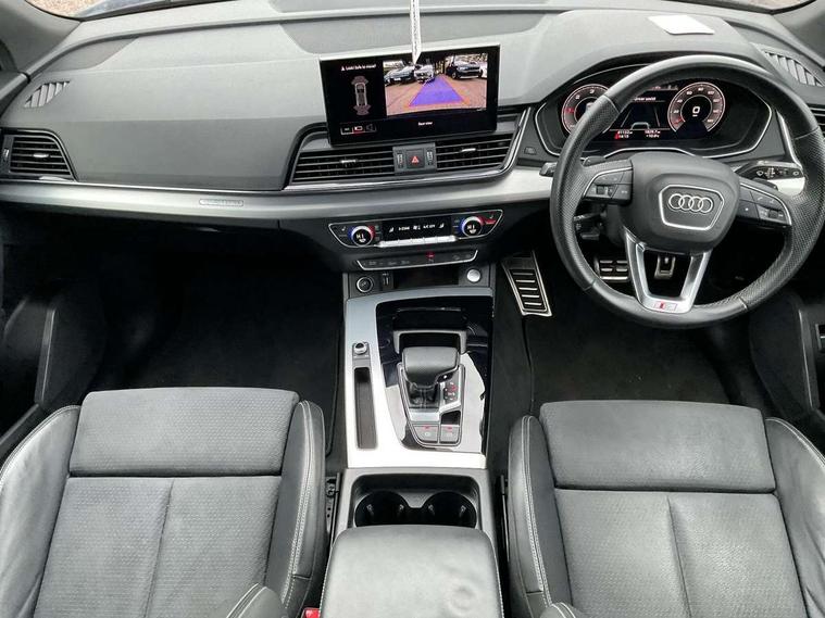 Audi connect safety and service (e-call), Audi connect with Amazon Alexa Integration, Audi drive select, Audi virtual cockpit plus with 12.3" screen and three different layout designs, Audi wireless smartphone interface, Automatic start-stop system with coasting functionality and efficiency programme, Bluetooth interface, Electro - mechanical power assisted steering, MMI navigation plus with 10.1" touch screen, Power tailgate, Reversing camera, Service interval indicator, Voice control system with Audi hotword activation "Hey Audi", Diesel particulate filter, Quattro on demand, S line sports suspension, DAB Digital radio, Acoustic windscreen, Aluminium roof rails, Audi matrix LED headlights with dynamic front and rear indicators, Auto dimming rear view mirror, Automatic headlights and windscreen wipers, Body colour door mirrors, Body colour rear diffuser with matt aluminium silver surrounds, Body colour underbody protection, Chrome plated exhaust trims, Door sills in Selenite silver, Electric adjustable/heated/folding door mirrors, Front air inlet surrounds in aluminium, Front and rear electric windows, Front radiator grille in honeycomb design, Headlight washers, Lower bumpers painted in contrast Manhattan grey, Rear chrome trim strip below lights, Rear privacy glass and rear side windows, Rear spoiler, Rear wiper, Roof bars, S Line badges on the front wings, S Line front and rear bumpers, S Line side skirts, 2 x USB charging port with aux input socket, 3 rear headrests, 40:20:40 split folding rear seat with rear centre armrest, Black cloth headlining, Comfort front centre armrest, Contrast stitching on seats, steering wheel and gear lever gaiter, Deluxe 3 zone electronic climate control, Front head restraints, Front/rear floor mats, Gear lever in black leather, Heated front seats, Height/reach adjustable steering column, Illuminated door sill trims with S logo, ISOFIX child seat mounting and top tether, Manual seat adjustment with 4-way electric lumbar support, Removable luggage compartment floor, Stainless steel pedals, Sunvisors with vanity mirrors, Trunk roller cover, High gloss pack - Q5, LED interior light pack - Q5, 3 point seatbelts on all seats, 6 airbags - Driver, front passenger, curtain and side airbags, Electrically operated child locks on rear doors, Electromechanical parking brake, Electronic stabilisation control including ABS, ASR and EDL, Front passenger airbag deactivation, Hill descent control, Hill hold assist, Multi collision brake assist, Pop-up bonnet for pedestrian protection, Pre sense city, Seat belt force limiter, Seatbelt monitoring, Tyre pressure warning, Warning triangle and first aid kit, Anti theft alarm, Anti-theft wheel bolts, Keyless Go access/ignition system, Matt brushed aluminium inlays,