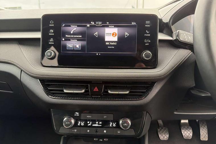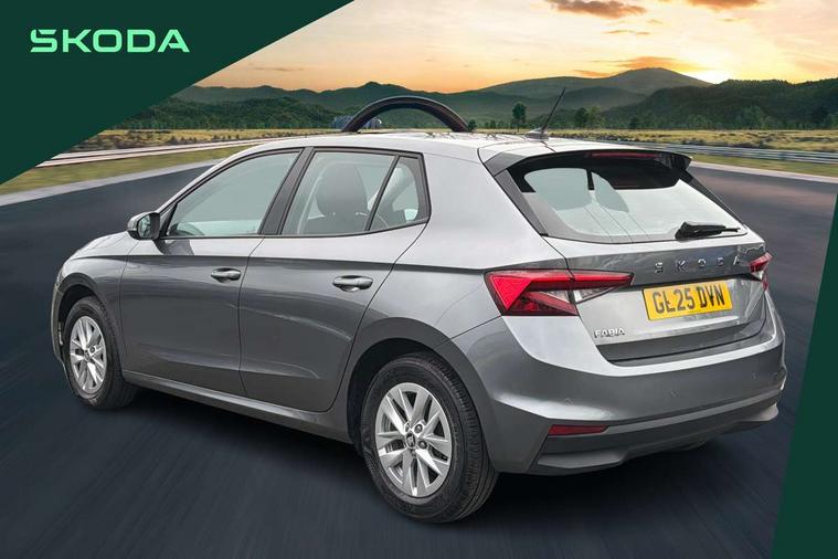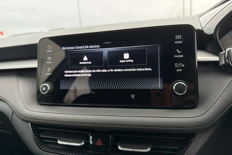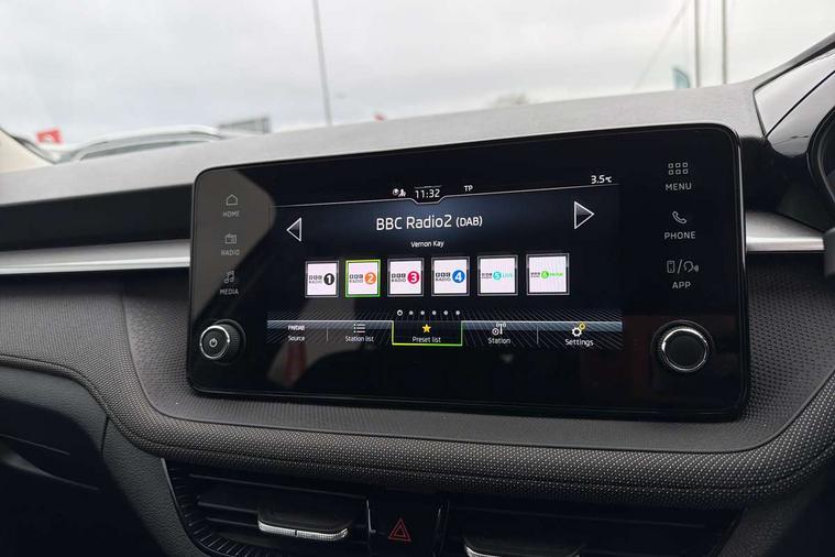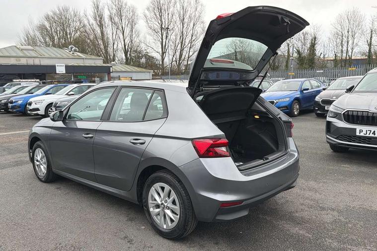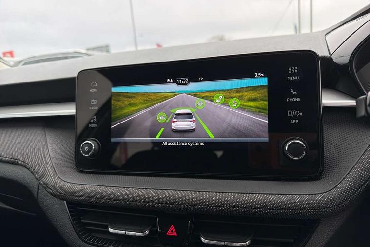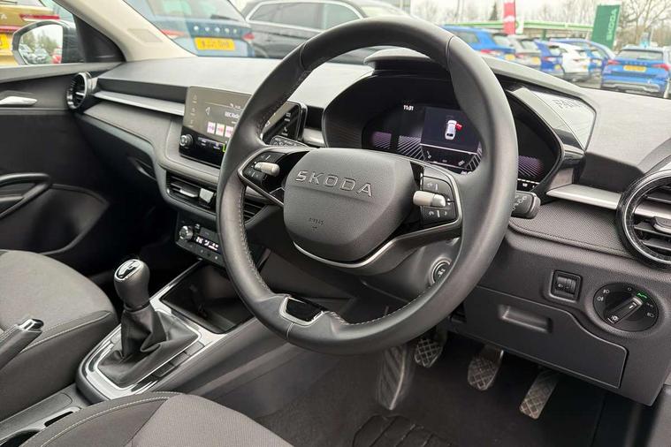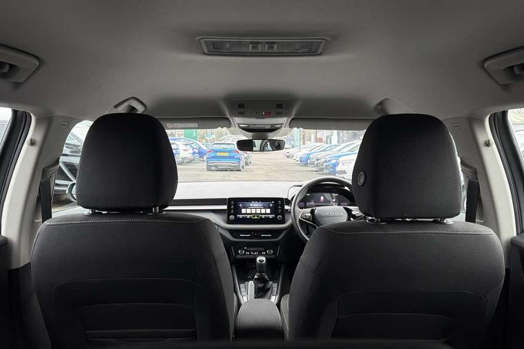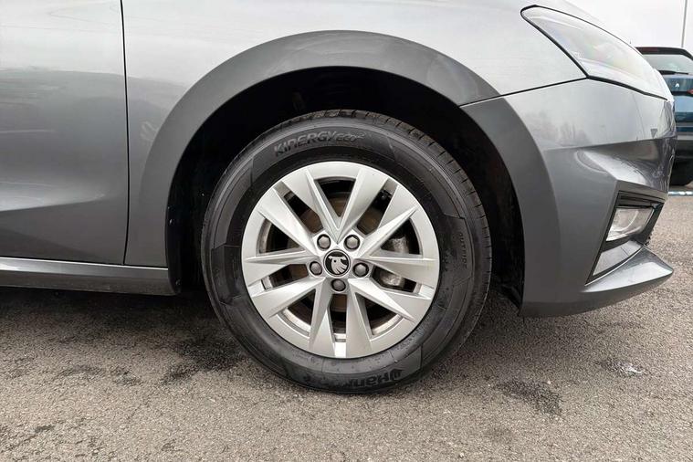 8" Digital instrument display, Advanced driver attention and drowsiness monitor, Bluetooth connection, Electromechanical power steering, Exterior temperature gauge, Service interval indicator, Traffic sign recognition, Wireless SmartLink for Apple CarPlay and Android Auto, 6 Speakers (4 in front and 2 in rear), 8.25" Skoda infotainment touchscreen display, Auxiliary socket for external MP3 player, DAB digital radio reception, Auto dimming rear view mirror, Body colour door mirrors, Body coloured bumpers, Door mirror integrated indicators, Front and rear electric windows, Front window wiper intermittent control, Headlight range control - Automatic, Ice scraper in fuel cap, LED 3rd brake light, LED daytime running lights with coming and leaving home feature, LED rear lights, Rear LED fog light, Rear side wing doors, Rear window wiper with washing nozzles, Roof mounted spoiler, SKODA tailgate lettering in chrome, Unique dark chrome design logo on alloy wheels, 2 reading lights in front and 2 reading lights in rear, 3 rear headrests, Backrest split and folding, Central console with removable cup holder and storage box, Chrome handbrake release button, Dual zone air conditioning with climatronic electronic control, Fabric upholstery, Front centre armrest, Gearshift knob/handle in leather, Grain satin black interior door handles, Hand brake lever handle in leather, Height adjustable front headrests, Height adjustable front seats, Height adjustable steering wheel, ISOFIX and TopTether anchorage points to the outer rear seats, ISOFIX and TopTether on the front passenger seat, Luggage compartment lighting, Manually adjustable lumbar support in front seats, Pollen filter, Rear seat bench unsplit, Single front passenger seat, Skoda lettering on steering wheel, Storm grey headlining, Sun visors with mirror and airbag label on passenger side, Textile floor mats, Ticket holder, Umbrella in drivers door, 3-point height adjustable front seats belts with pretensioner and force limiter, Automatic warning lights in case of crash, Driver and passengers airbag with switch off function, e-Call+, ESC including ABS, MSR, ASR, EDS, HBA and XDS, Front and rear seat belt warning, FRONT ASSIST (AEB City and AEB Inter Urban), Front side airbags, Head airbags, One tone horn, Pedestrian protection, Three rear 3-points safety seat belts with pretensioner and force limiter including stop function for outer rear seat belts, Tyre pressure monitoring system, Anti-theft alarm system including immobiliser, interior monitoring, backup horn, and towing protection, Central locking with radio remote control, interior controls, SAFE function and 2 foldable keys, Black painted air vents, Grain satin black central console cover, Metallic grey upper decorative trim, Satin black door and side trim panel in front, Textile Kota grey lower decorative inserts, Anti-theft wheel bolts protection, Super-low rolling resistance tyres,