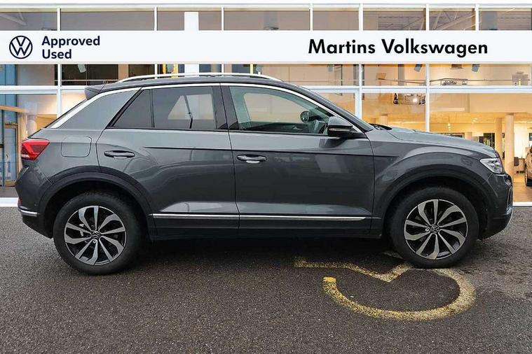 10.25" Digital cockpit pro, Bluetooth mobile phone interface, Driver alert system with fatigue detection, Driver tips and journey analysis, Emergency call service, Lane keeping system Lane Assist, Modified key software - reduce switch off time for key status change to Long no motion, Online services, Park assist including front and rear parking sensors, Service interval indicator, Tailgate/trunk lid release from outside, Think blue trainer driver tips and journey analysis, Warning sound and light for front seatbelts unfastened, Wireless app connect, Battery regeneration during braking, Start/stop function with battery regeneration, Diversity antenna for FM reception, Front and rear 6 speakers, Music playback - MP3, WMA and AAC files, Premium USB cable in choice of either Apple or Android smartphone compatibility, SD card slot, Simultaneous pairing of 2 compatible mobile devices, Title and cover art display, We Connect and We Connect Plus functionality, 3rd brake light, Auto dimming interior rear view mirror, Automatic hazard lights activation under emergency braking, Automatic headlight control with LED separate daytime running lights with coming/leaving home function, Body colour sports bumpers with silver metallic underbody fascia, Dynamic headlight range control with self adjusting whilst driving, Extended roof spoiler, Exterior mirrors aspherical on driver side, convex on front passenger side, External USB type C socket and charging sockets, Front windscreen wiper with intermittent wipe and 4 position delay, Heated rear window, LED Plus headlamps, LED rear combination lamps, LED rear number plate lights, LED tail lamp rear comination lamps, Light mode for poor weather, rain, fog or snow, Power windows with comfort operation and circuit breaker, Rain sensor, Rear exhaust tailpipe, Rear fog light on one side and reversing lights on both sides, Rear side wing doors, Rear wash/wipe with intermittent wipe setting, Remote electrically foldable door mirrors, puddle lights and reverse activated passenger's door mirror, 12V power socket in centre console, 3 rear head restraints, 3 seat bench in 2nd row, 4 load lashing points in luggage compartment, Air care climatronic air conditoning system with active combination filter and 2-zone temperature control, Chrome plated radiator grille inserts, air vent surrounds and light switch surrounds, Door and side trim panel with leatherette insert, Drawer under drivers seat, Front + rear carpet mats, Front centre armrest, Front comfort sports seats, Front cupholders x 2, Front footwell illumination, Instrument lighting, white adjustable panel illumination, Interior ambient lighting and surround lighting, Interior light delay, Isofix child seat preparation, Leather gearshift handle, LED interior light with switch off delay/dimmer and 2 front/rear LED reading lights, Load-through provision with cup holder when folded down ('Unsplit rear seat bench, split folding backrest, with centre armrest), Luggage compartment lighting, Non-folding front passenger seat backrest, Single front passenger seat, Storage compartment in left and right luggage area, Storage compartment in rear doors, Storage compartments in driver and front passenger doors, Sunvisors with illuminated vanity mirrors, Variable boot floor, height adjustable and removable, Driver assistance pack without proactive passenger protection - T-Roc, 3 point height adj front seatbelts + pretensioners, 3 point seatbelts in outer rear with ECE label, ABS, Child locks on rear doors, Driver and front passenger airbag with front passenger airbag deactivation, Driver and front passenger safety-optimised head restraints, Drivers seatbelt reminder, Electronic parking brake, Electronic Stability Control (ESC) inc EDL (Electronic Differential Lock) and ASR (Traction Control), Front and rear passengers curtain airbag system including front side airbags, Front assist with city emergency braking and pedestrian monitoring, Front seat side impact airbags, Predictive pedestrian protection, Rear disc brakes, Single tone horn, Tyre pressure loss indicator, Volkswagen roadside assistance, Alarm with interior protection, Anti-theft alarm system with interior monitoring, backup horn, and towing protection, Remote central locking with SAFELOCK, radio remote control with 2 remote control folding keys, Trims for alloy wheels,