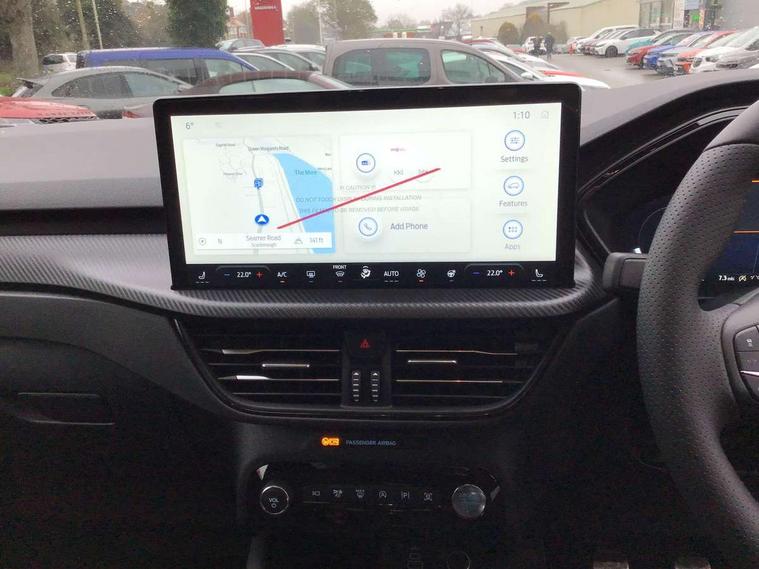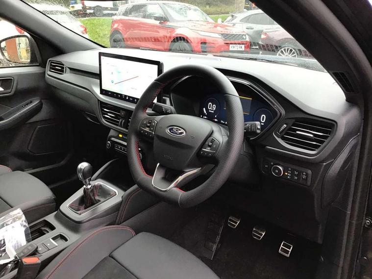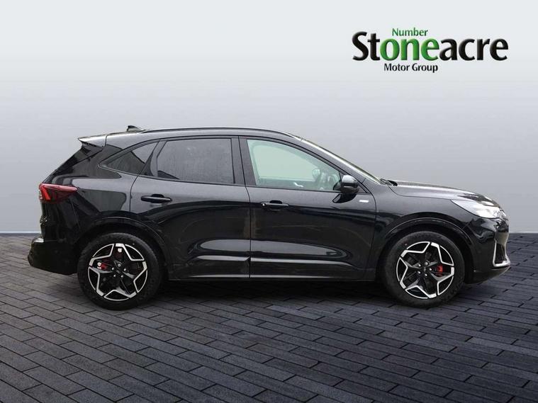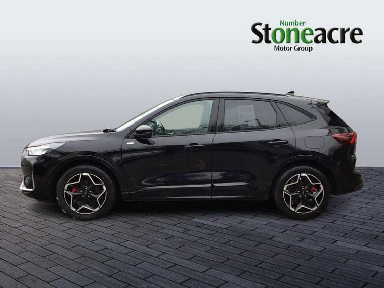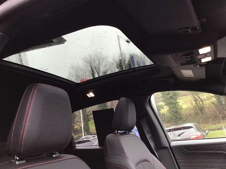 12.3" digital colour instrument cluster, 360 degree view camera, Cross traffic alert with active braking, e-Call (emergency call), Ford easy fuel, Ford SYNC 4 Navigation with 13" touchscreen, DAB radio, emergency assistance, Andriod Auto/Apple CarPlay, 5G modem & Ford Pass connect, Front and rear parking sensors, Hands free power tailgate, Lane keeping aid with lane departure warning, Power assist steering, Selectable drive modes, Service interval indicator, Sports suspension, B&O premium audio system with 10 speakers, subwoofer and 2 USB ports, Auto headlamps with high and low beam, Black roof rails, Body colour bumpers, Front LED fog lamps, Large rear spoiler, LED daytime running lights, LED rear lights, LED third brake light, Pop out door edge protectors, Power front/rear windows with global close, Power heated folding door mirrors with puddle lights, memory function and camera, Power opening panoramic roof, Quickclear heated windscreen, Rain sensing wipers, Rear privacy glass, Rear side wing doors, Rear wiper, ST-Line body styling kit, 2nd row sliding seats, Electronic automatic temperature control (EATC), Front and rear head restraints, Partial premium touch sensico upholstery, Rear centre head restraint, Single front passenger seat, Sports seats, Driver assistance pack - Kuga Manual, Winter pack - Kuga, 3x3 point rear seatbelts, Airbags - front driver/passenger, front and rear curtain, Drivers knee airbag, Dynamic brake support, Electronic stability control (ESC) and ABS, Evasive steering assist, Ford MyKey Gen 2 safety system, Manual child proof rear door locks, Pre collision assist with autonomous emergency braking, Rear seat Occupancy alert, Red brake calipers, Tyre pressure monitoring system, Engine immobiliser, Keyless entry and Ford power start button (Keyless start), Locking wheel nuts, Remote powered central double locking doors, Thatcham category 1 alarm,