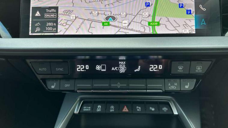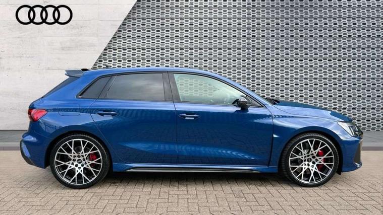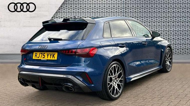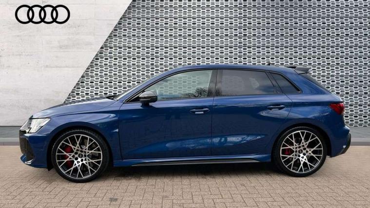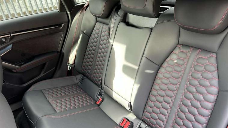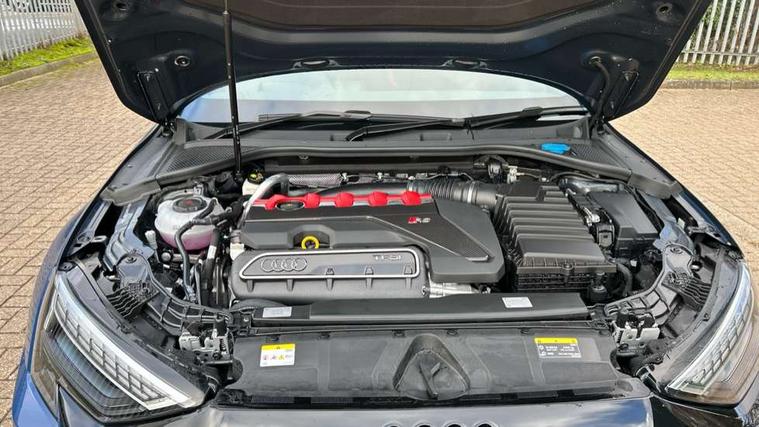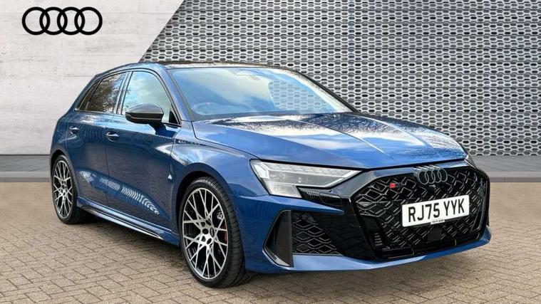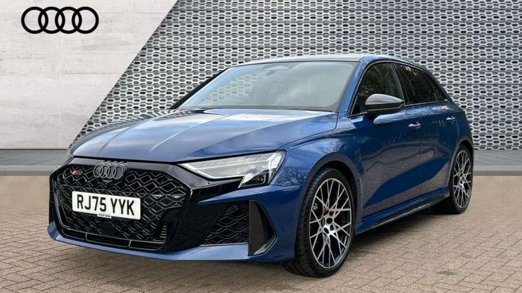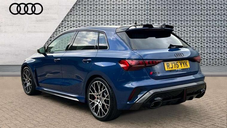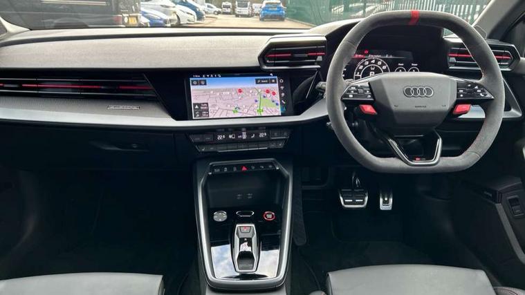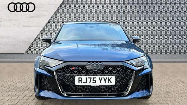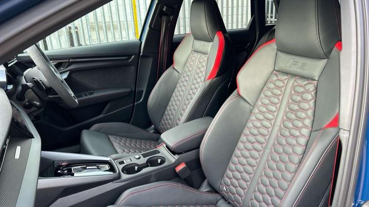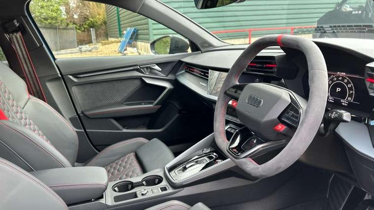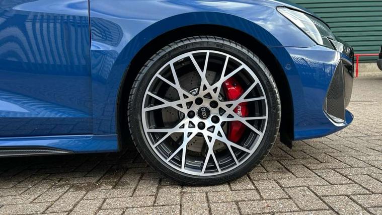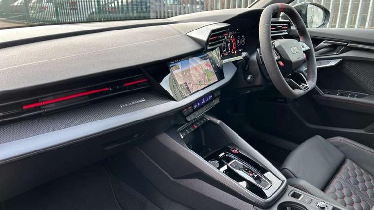 Adjustable speed limiter, Audi drive select comfort, auto, dynamic and efficiency, Audi virtual cockpit plus with RS specific design and 12.3" display with additional graphic display options, Automatic start/stop system with recuperation, Bluetooth interface, Camera based traffic sign recognition, Collision avoidance assistant, Driver attention and fatigue detection, e-Call (emergency call), MMI Navigation Plus with high resolution 10.1" colour touch screen display, Progressive steering, RS specific driving modes - RS Individual, RS Performance and RS Torque rear, Service indicator, Smartphone interface with app store includes wireless Apple carplay, Android auto and Amazon alexa integration, Trip computer, Voice control system with natural language interaction, Adaptive suspension, Increase of top speed to 174 mph, Quattro permanent four wheel drive, Audi Phonebox light with wireless charging, DAB Digital radio, USB ports with charging function in the rear, Audi beam LED projection of RS logo on ground as you exit, Auto dimming frameless rear view mirror, Carbon door mirror housings, Electrically adjustable/heated/folding/auto dimming door mirrors with integrated LED indications + kerb view function for passenger side, Engine compartment cover with carbon trim, Exterior model badging, Front electric windows, Heat insulating glass windscreen, LED 3rd brake light, Light and rain sensors, Privacy glass - dark tinted rear window, rear door and side windows, Rear electric windows, Rear side wing doors, Rear wiper, Roof edge spoiler in carbon, RS sport exhaust system - dual branch with flap control and gloss black oval tailpipe trims, 12V socket and storage compartment in front centre console, 3 seat bench in 2nd row, 3 Spoke flat top and bottomed black leather multi function steering and gear shift paddles, 3-zone deluxe automatic air conditioning, 40/20/40 split folding rear seat bench, Black cloth headlining, Black front and rear floor mats, Front and rear headrests, Front centre armrest, Front door sill trims with RS 3 logo, Heated front seats, Height and reach adjustable steering wheel, Manual boot compartment lid, Rear centre armrest with cupholder, Seat side bolsters, Single front passenger seat, Stainless steel pedals and front footrest in black, Vanadium look - Interior door handles, Door trim, power latching, Air vents, window controls, mirror adjust, rear door lock, Selector lever in centre console, Black Styling plus package - RS3, Extended ambient lighting package Pro with Multi-coloured contour lighting of instrument panel - RS3, RS exterior features pack in carbon and gloss black - RS3, Storage package - RS3 Sportback, 3x3 point rear seat belts, Driver and front passenger airbag with passenger airbag deactivation, Electronic Stabilisation Control (ESC) including ABS, ASR and EDL, First aid kit with warning triangle and 2 safety vests, Hill hold assist, Pre-sense front with pedestrian and cyclist detection, Seatbelt monitoring, Tyre pressure loss indicator, Anti theft alarm, Anti-theft wheel bolts, Electronically operated child locks, Immobiliser, Black dashboard, Inlays in carbon atlas structure, Tyre repair kit,
