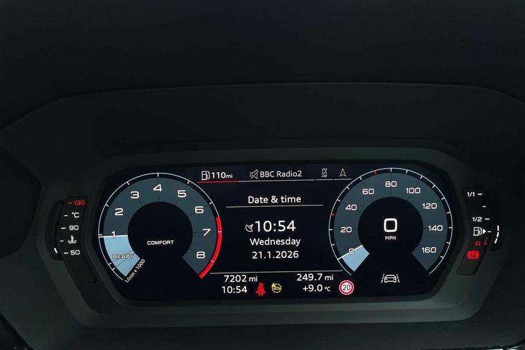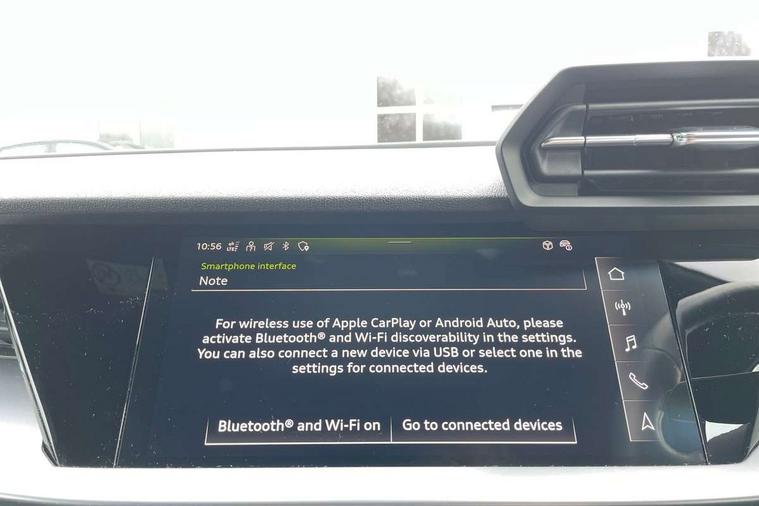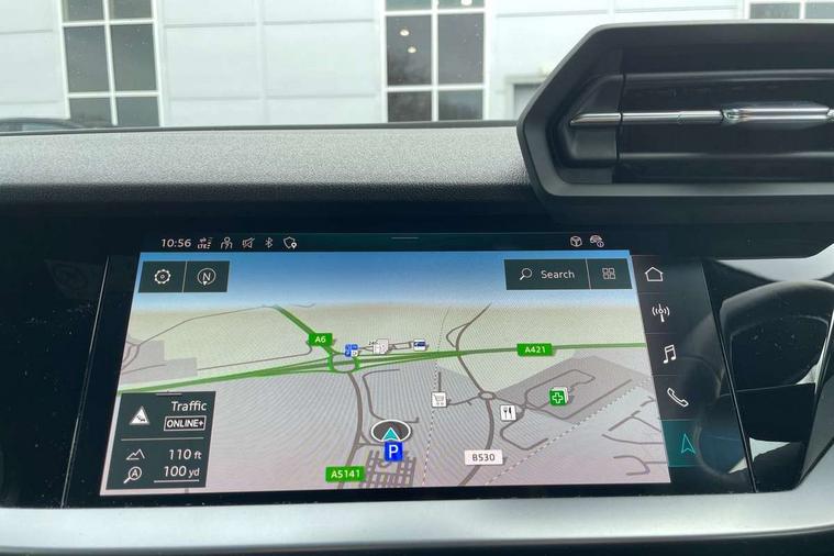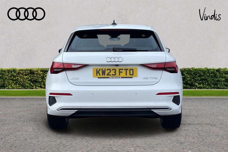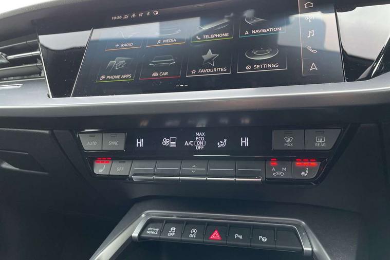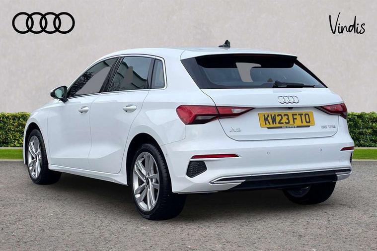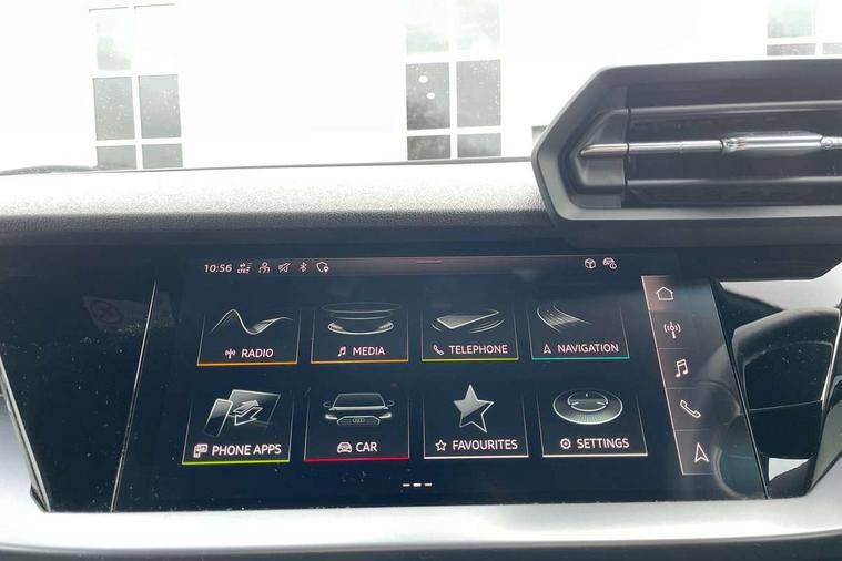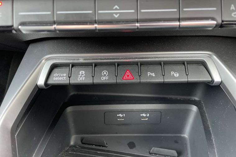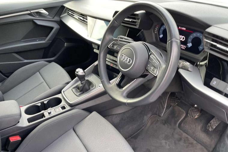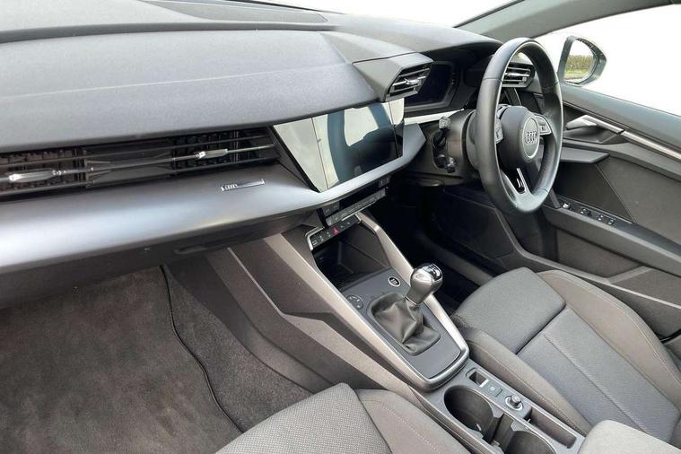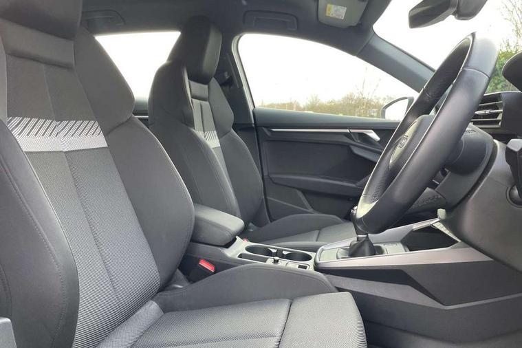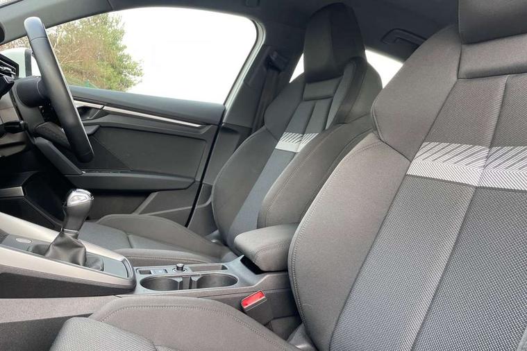 Audi drive select (Auto, Comfort, Dynamic, Efficiency and Individual), Audi smartphone interface, Audi Virtual Cockpit - 10.25" digital and colour instrument cluster, Automatic start/stop system with recuperation, Bluetooth interface, Camera based traffic sign recognition, Collision avoidance assistant, Cruise control, e-Call (emergency call), Electromechanical power speed sensitive steering, Lane departure warning system, MMI Navigation Plus with high resolution 10.1" colour touch screen display, Rear parking sensors, Service indicator, Trip computer, Voice control system with natural language interaction, Standard suspension, 2xUSB-C connection with data and charging functions, 6 passive loudspeakers, DAB Digital radio, 3rd brake light, Acoustic glass windscreen, Aluminium window trim, Auto dimming frameless rear view mirror, Body colour exterior mirrors, Body colour roof spoiler, Electrically adjustable/heated/folding/auto dimming door mirrors with integrated LED indications + kerb view function for passenger side, Front electric windows, LED daytime running lights, LED headlights and halogen rear lights, Light and rain sensors, Rear electric windows, Rear side wing doors, Rear window, rear door windows and rear side windows in clear glass, Rear wiper, 12V socket and storage compartment in front centre console, 3 seat bench in 2nd row, 3 spoke leather multifunction steering wheel, 4 way electrically adjustable lumbar support for driver and front passenger, 60/40 split folding rear seat bench, Dual zone electronic climate control, Front and rear headrests, Front centre armrest, Front door sill trims with aluminium inlay, Front/rear floor mats, Height and reach adjustable steering wheel, Interior lighting - Front and rear roof module including reading lights, glove compartment light and right hand side, Interior lighting - glove compartment light and right hand side, Luggage compartment floor covering, Manual boot compartment lid, Manually adjustable front seats, Routine cloth upholstery with front sports seats, Seat side bolsters, Single front passenger seat, Steel grey cloth headlining, Aluminium interior elements pack - A3 Sportback, LED interior lighting pack - A3 Sportback, Sport styling pack - A3 Sportback, 3x3 point rear seat belts, Driver and front passenger airbag with passenger airbag deactivation, Electronic Stabilisation Control (ESC) including ABS, ASR and EDL, First aid kit with warning triangle and 2 safety vests, Front side airbags with head airbags and interaction airbag, Pre-sense front with pedestrian and cyclist detection, Seatbelt monitoring, Tyre pressure loss indicator, Anti theft alarm, Anti-theft wheel bolts, Electronically operated child locks, Immobiliser, Remote control central locking, Inlays with silk effect paint in platinum grey,