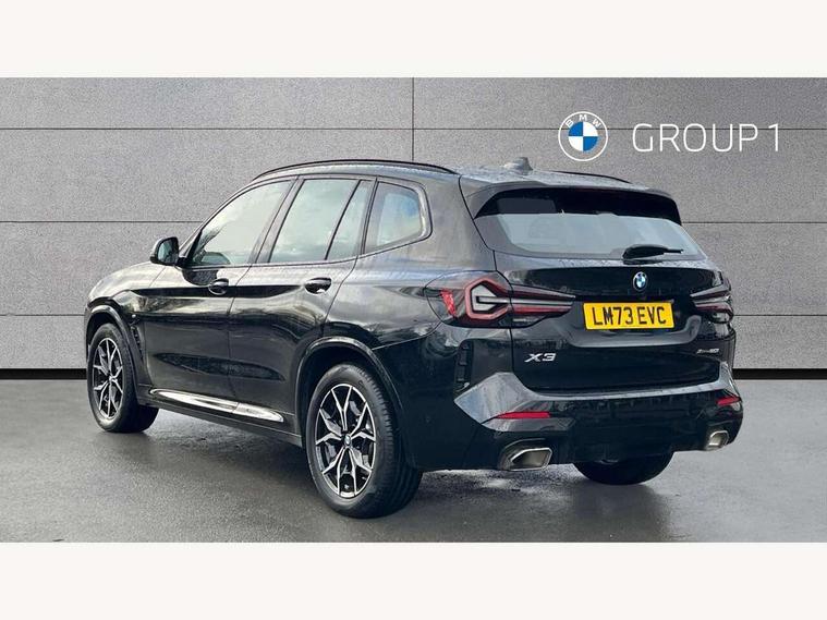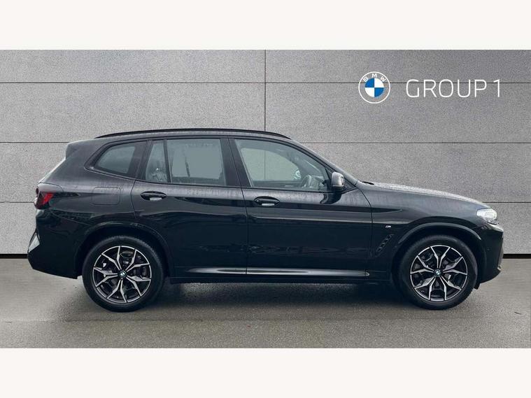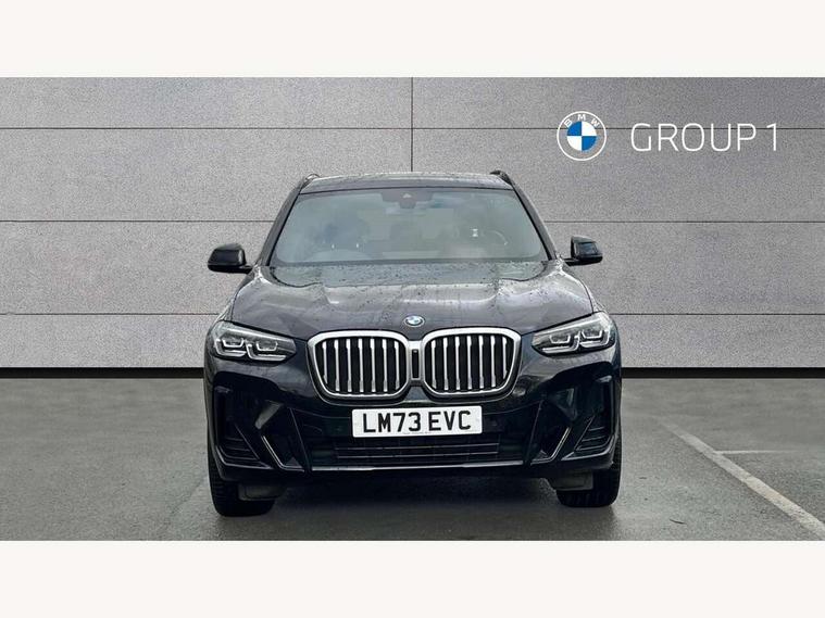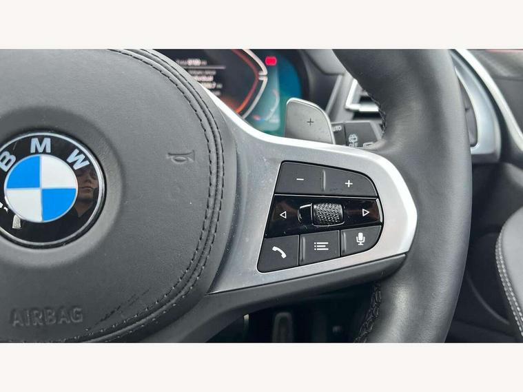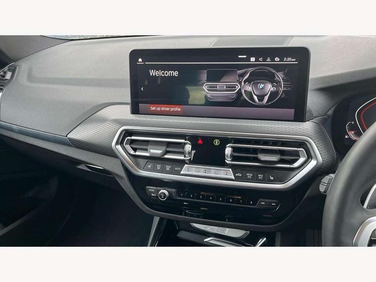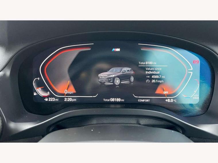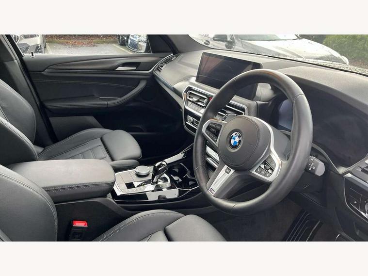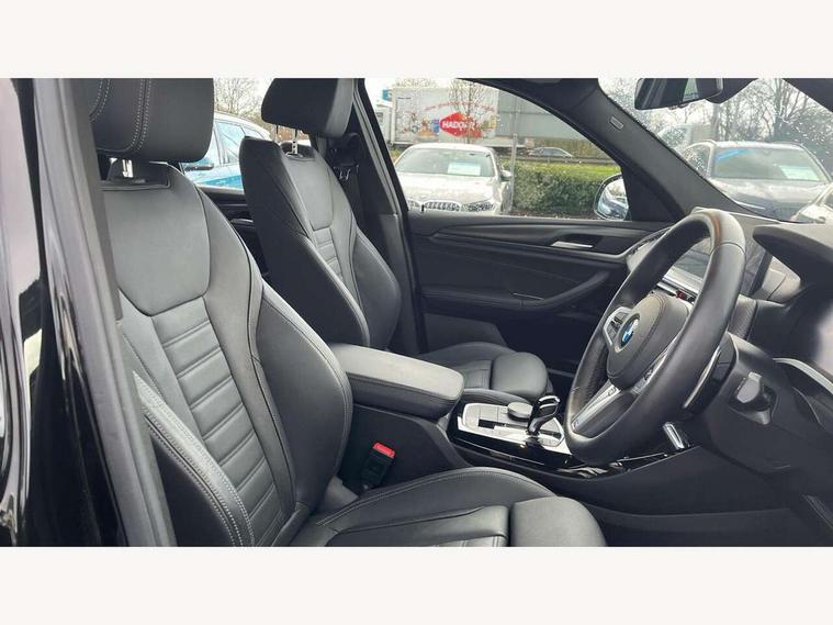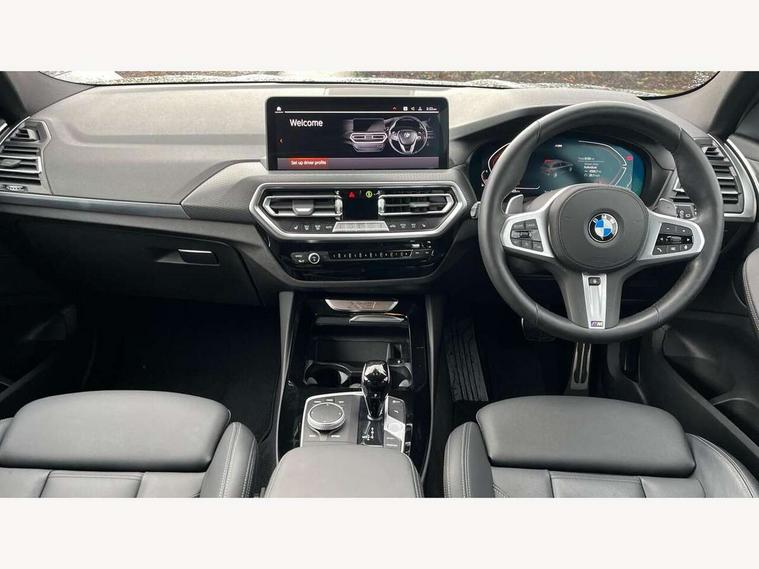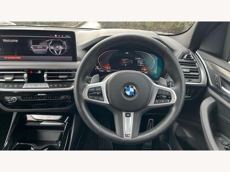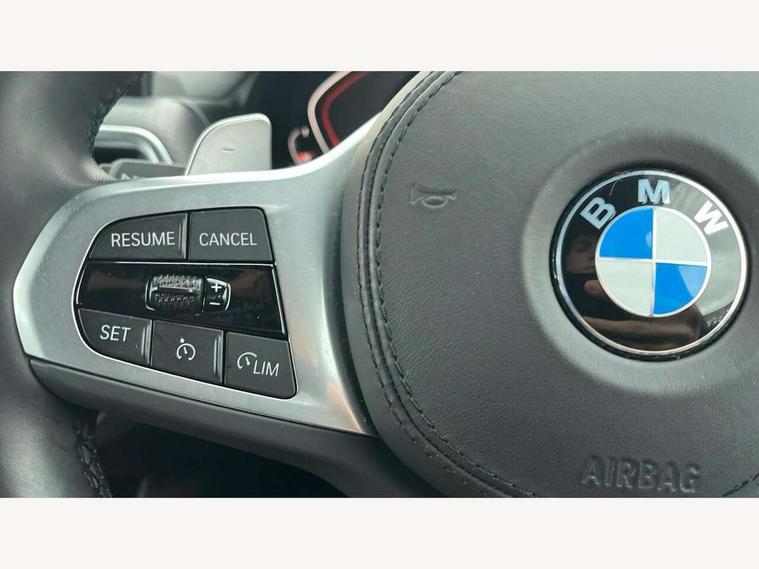 Active Guard, Attentiveness assist, BMW Live Cockpit Professional nav system including 12.3" instrument display + 12.3 high resolution control display, BMW Online services, BMW Teleservices, Brake pad wear indicator in front and rear, Check Control warning system for monitoring of lights and door/luggage compartment open warning, Condition based service - BMW service history, electronic service booklet, integrated owner's handbook, Connected drive services, Electric boot lid, Front/rear Parking distance control, iDrive touch controller with 8 favourite buttons, Instrument cluster with speedometer with mph readout, tachometer, fuel gauge and oil temperature gauge, Lights on warning by audio warning signal when ignition is switched off, Oil sensor for level and grade, warning by check control system, On board computer - average speed+fuel consumption, service interval, clock/date, odometer/trip meter, outside temperature display and ice warning, Optimum shift indicator, Personal Profile - automatic lock when driving away selectable, Run flat indicator, Stop/start system, Variable sports power steering with drive performance control Sport+ mode, Automatic transmission with gearshift paddles, Incorrect fuelling protection, M sport suspension, Multi-link rear suspension, BMW professional radio/CD/MP3, DAB tuner, Acoustic glazing, Automatic windscreen wipers and automatic headlight, Black finish on B pillars, Body colour door handles, Body colour electric adjust heated aspherical door mirrors, Body colour roof mouldings, Body coloured bumpers, Direction indicator, side repeaters, integrated in exterior mirrors, Dynamic brake lights, Exhaust tailpipes - dual, round, split left and right with chrome finisher, Fingertip control / anti-trap function on electric window, Folding wing mirrors with auto dimming, Follow me home headlights, Front and rear bumper system with replaceable deformation elements, Front and rear electric windows, Gloss chrome tailpipes finishers, Green tinted heat insulating glass, Heated windscreen washer jets, High beam assistant, High gloss black shadow line roof rails, High gloss shadowline exterior trim in decorative moulding side frame/recess cover/guide rail/B, C pillars/mirror frame and triangle with mirror base, High level 3rd brake light incorporating LED Technology, Interior rear view electrochromatic mirror with automatic anti dazzle function, LED tail lights, Lightweight engineering, M aerodynamic bodystyling, M Sport entry door sill strips, Model designation, Rain sensor, Rear side wing doors, Rear wing door, Rear wiper, Shark fin antenna, Side exterior M designation badges, Visible VIN plate, Welcome lighting, Windscreen wipers with adjustable interval, 12V power point in luggage area, 12V power socket in front centre console, 2 x USB Type C ports for charging and data transmission (front centre console) and 2 x USB Type C ports for charging (rear centre console), 3 rear headrests, 3 seat bench in 2nd row, 3 zone automatic air conditioning, 4 lashing points to secure luggage, 40:20:40 split folding rear seat with loading system, Ambient lighting, Anthracite headlining, Automatic interior light when door is opened/ignition switched off or via remote key, Floor mats in velour, Foldable storage floor with compartment, Four grab handles integrated in roof lining, Front and rear bottle holders integrated into door trim storage compartments, Front and rear side armrests integrated into door trim, Front centre armrest with storage compartment, Front footwell lights, Front head restraints, Front passenger seat, Front sports seats, Front/rear courtesy lights with soft on/off dimming, Front/rear reading lights, Heated front seats, Isofix rear child seat preparation, Leather gear knob, Lockable glove compartment, Luggage area underfloor compartment, Luggage compartment lighting, M sport leather steering wheel, Multifunction steering wheel, Parcel shelf removeable and storable under boot floor, Reach and rake adjustable steering column, Rear centre armrest with 2 cupholders, Removable / retractable luggage cover, Slope adjustable rear seats, Storage compartment in rear centre console and front/rear door trims, Sun visors with vanity mirrors and ticket pocket, Toolkit located in luggage compartment, Two front cupholders with removable oddments tray/lid, Connected pro pack - X3, ADB - Automatic Differential Brake, Anti-lock braking system (ABS) with brake assist, Automatic Stability Control (ASC), Battery safety cut-off, BMW emergency call, Brake drying, Brake energy regeneration, Braking pre-tensioning, Child locks on rear doors, Cornering brake control (CBC), Crash Sensor - activation of central locking release, hazard warning light and interior lighting, Deactivation of fuel pump in the event of a crash, Driver and front passenger front and side airbags with passenger deactivation and ITS front and rear head airbags, Driver and front passenger knee airbag, DSC+, Dynamic brake control, Dynamic Traction Control - DTC, Electromechanical parking brake, Hill descent control, Hill start assist, Seatbelt security check for front seats, Side impact protection, Three point seatbelts to all seats with front and outer rear pyrotechnic belt tensioners and seat belt force limiters, Two tone horn, Tyre pressure sensor, Ventilated front and rear disc brakes, Warning triangle and first aid kit, Central locking switch for all doors, fuel filler cap and luggage compartment, Electronic engine immobiliser, Locking wheel nuts, Remote control including two integrated key - one button for open/close all lockable content, windows and separate button for open luggage compartment, Remote control Thatcham category 1 alarm, Start/stop button with Comfort Go keyless engine start and auto Start/stop deactivation button, Low rolling resistance tyres,