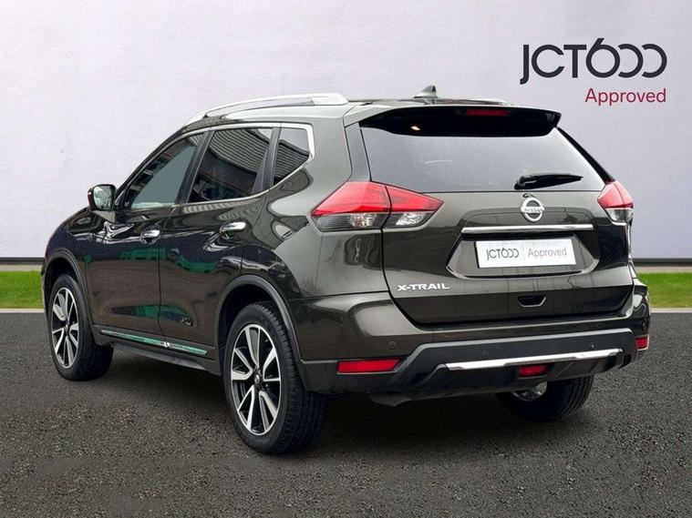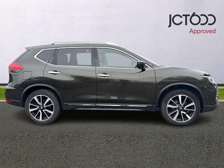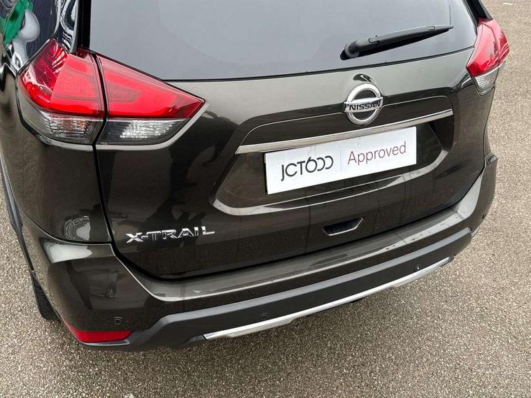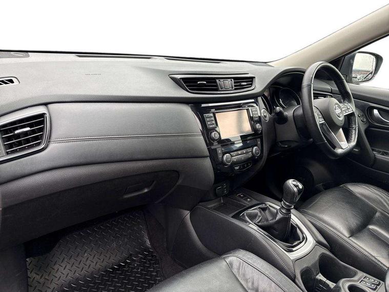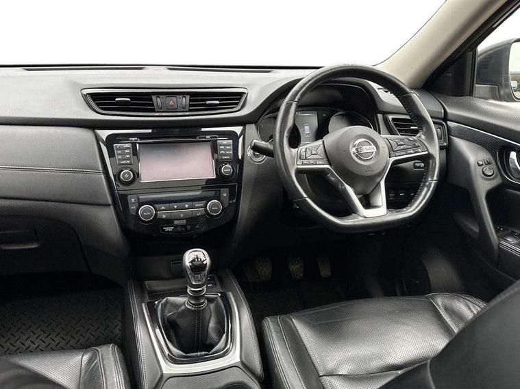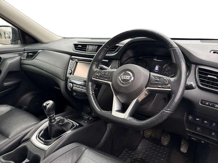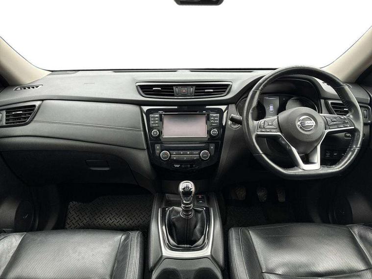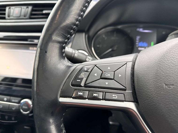 5" TFT driver information centre, Around View Monitor, Attention assist, Automatic tailgate opening, Blind spot monitoring, Bluetooth phone integration system, Cruise control + speed limiter, Engine start button, Front and rear parking sensors, Intelligent parking assist, Lane departure warning system, Moving object detection, Nissan connect sat nav system, PAS, Rear cross traffic alert, Traffic sign recognition, Trip computer, Audio remote control in steering wheel, Bose premium 8 speaker system, DAB Digital radio, Radio/CD, Smartphone apps, USB/aux input socket, Adaptive front lighting system, Auto dimming rear view mirror, Automatic headlights, Automatic rain sensing wipers, Black honeycomb front grille, Body colour door mirrors, Chrome door handles, Chrome side mouldings, Chrome window surround, Electric folding door mirrors, Electric heated door mirrors, Front and rear power windows, Front fog lights, High beam assist, LED daytime running lights, LED Headlights, Panoramic sunroof, Rear privacy glass, Satin silver roof rails, Shark fin roof aerial, 3 rear headrests, 60/40 split rear bench seat, Centre console storage box/armrest, Configurable luggage board system, Dual zone climate control, Electric adjustable front seats including height adjust, Front and rear door pockets with bottle holders, Front cupholders, Heated front seats, Heated rear seats, Heated steering wheel, Height adjustable front headrests, Individual rear reading lights, Isofix child seat attachment, Leather steering wheel and gear knob, Lumbar support, Pollen filter, Rake/reach adjustable steering wheel, Rear armrest, Synthetic leather instrumental panel inserts, Synthetic leather knee pad, 3 point seatbelts on all seats, ABS, Child locks on rear doors, Driver and passenger airbags, EBD + Brake Assist, Electronic parking brake, ESP + traction control, First aid kit, Front and rear curtain airbags, Hill hold assist, Intelligent emergency braking with pedestrian recognition, Seatbelt warning, Tyre pressure monitoring system, Warning triangle, Alarm, Immobiliser, Intelligent Key, Remote central locking, Full size spare wheel,