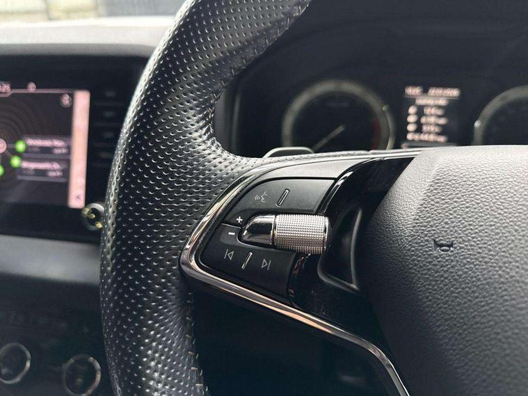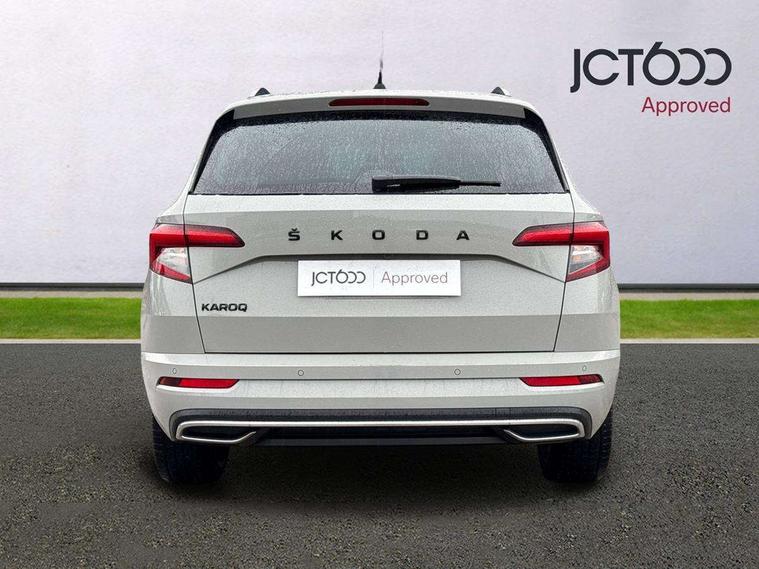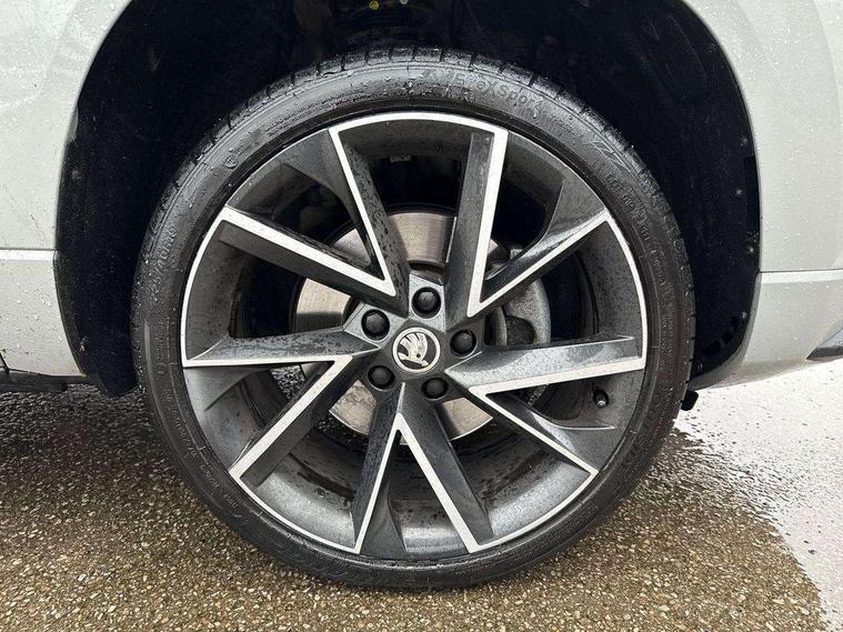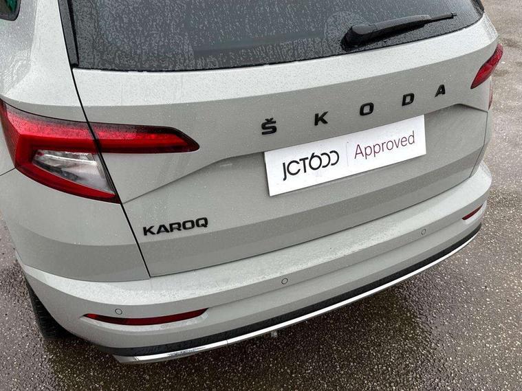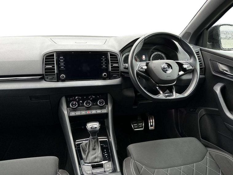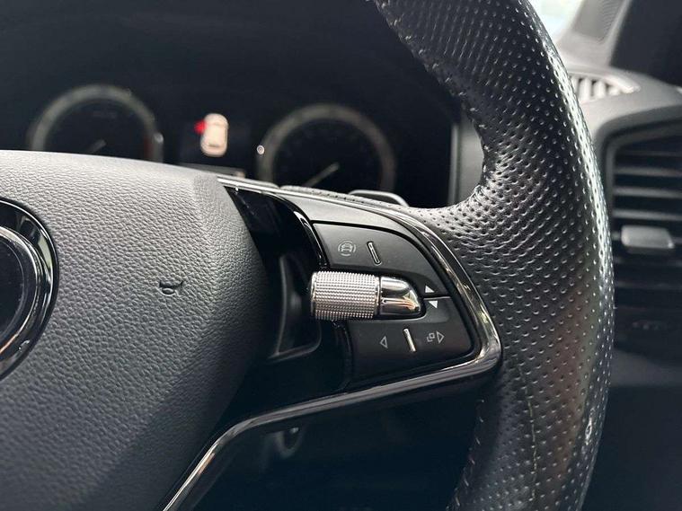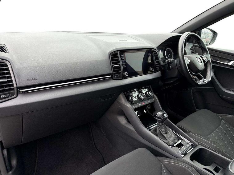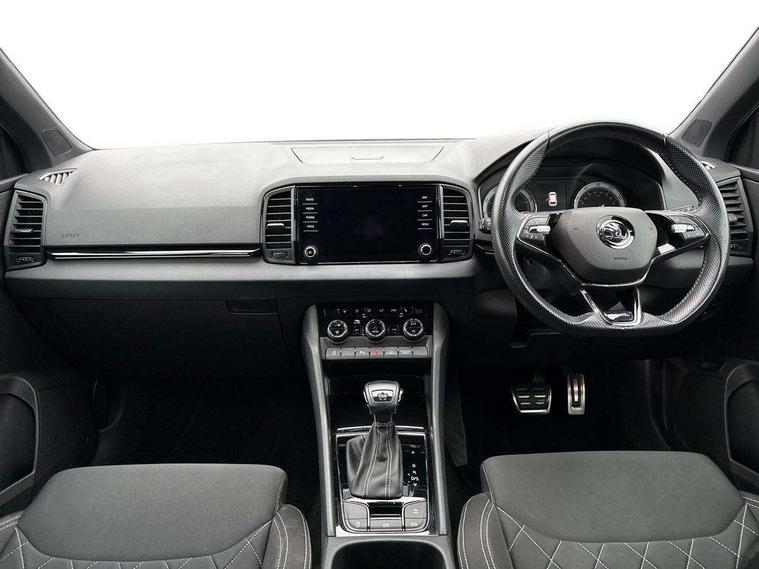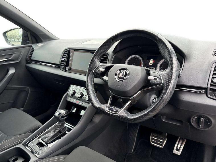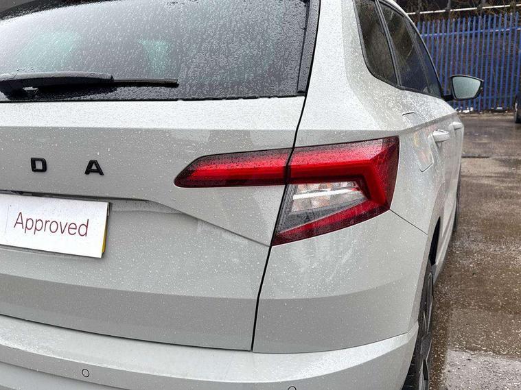 Care connect, Drive mode selector, Driver fatigue sensor, Multifunction colour trip computer, Outside temperature gauge, Service interval indicator, SmartLink wireless for Apple and wired for Android, Start/stop system with regenerative braking, USB C Port x 2 in front centre console, DAB radio with Bluetooth, USB connection, Wireless charging without wireless aerial connection, Acoustic glass, Aero front windscreen wipers with intermittent function, Automatic headlight control system, Black door mirrors, Black electric window control buttons, Black radiator grille, Black roof rails, Body colour door handles, Body coloured bumpers, Electric front and rear windows with child proof lock, Front door steps with SportLine logo, Full LED headlights + adaptive front light system + LED daytime running lights and front cornering fog lights, Headlight washers, Heated rear windscreen, LED rear lights with high functionality, Light assistant (coming/leaving home/tunnel light), Panoramic sliding sunroof, Privacy glass, Protective door side sills in body colour, Rear diffuser, Safety reflectors on front doors, Skoda lettering on tailgate in black, Sportline badge on front fender, Sportline decorative inserts with badging, Sports front and rear bumpers, Third brake light, 1.5 litre bottle holders in driver and front passenger door panels, 12V socket in boot, 12v socket in front centre armrest with storage compartment and rear air vents, 2 Folding hooks and nets in boot, 2 Front readings lights for driver and passenger, 3 rear height adjustable headrests, 4 foldable roof handles with rear coat hooks, Aluminium pedals, Black roof headlining, Cargo elements in boot, Chrome inner door handles, Door sill scuff plates, Driver and passenger seats height adjust, Front head restraints, Height adjustable front three point seats belts with tensioners, Height/reach adjust steering wheel, Ice scraper, Illuminated and cooled glovebox, Illuminated luggage compartment, Isofix child seat preparation outer rear, Manual lumbar support for front seats, Net programme in boot, Pen holder, Pollen filter, Rear reading lights, Rear seats fixed folding and divided 60:40, Retractable parcel shelf attachable to tailgate, Safety vest holder, Solid rear boot cover, Storage box in upper central dashboard closed, Storage compartment below the passenger seat, Sunvisors with illuminated vanity mirrors, Textile floor mats, Umbrella under passenger seat, Welcome animation with sportline logo, LED Interior lighting pack with Skoda welcome logo - Karoq, Airbags - Front side, head, knee and curtain, Automatic door unlocking in case of crash, Automatic fuel cut off in case of crash, Driver airbag, Electronic parking brake with auto hold function, Emergency rear braking signal, ESC including ABS, MSR, ASR, EDS, HBA, DSR, RBS, MKB and traction control, Front assist radar scanning of the space in front of the car with automatic braking, Hill hold control, Passenger airbag with switch-off function, Pedestrian monitor, Seatbelt reminder signalisation and pretensioner for all seats, Three point seatbelts rear, Two tone horn, Tyre pressure display, Tyre pressure monitor, Alarm with interior monitoring, back up horn and tilt sensor with safe function, Electronic engine immobiliser, Keyless entry and keyless start with safe system, Remote central locking with 2 remote folding keys, Black air vent surround, 19" Vega anthracite alloy wheels, Anti-theft wheel bolts protection, Storage on wheel cover,
