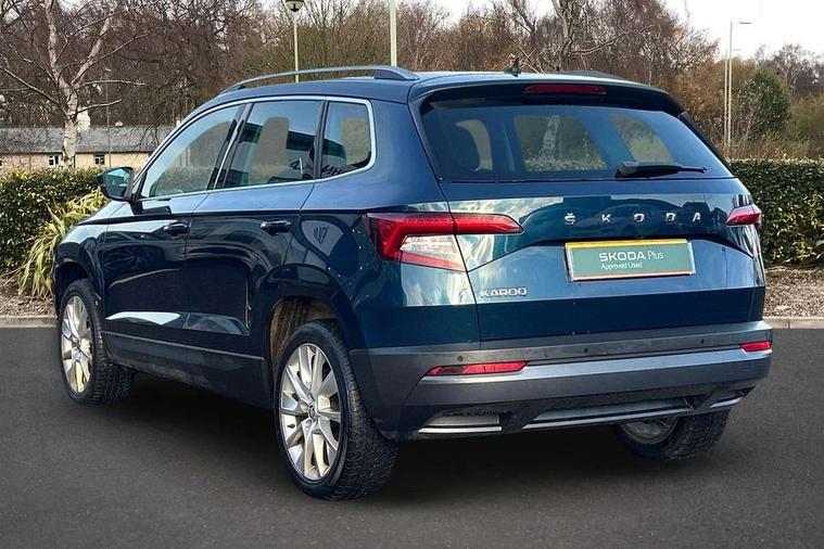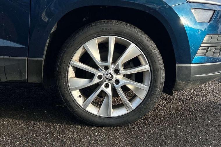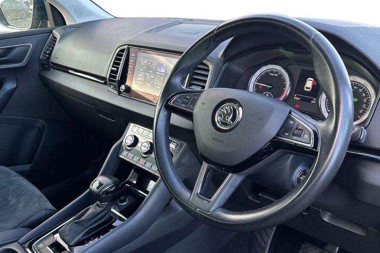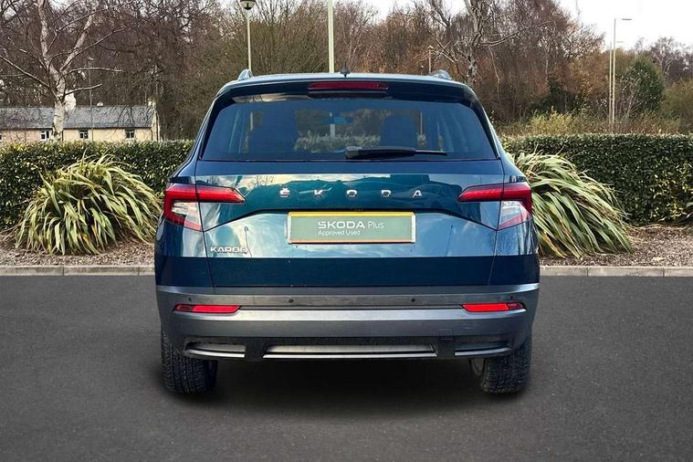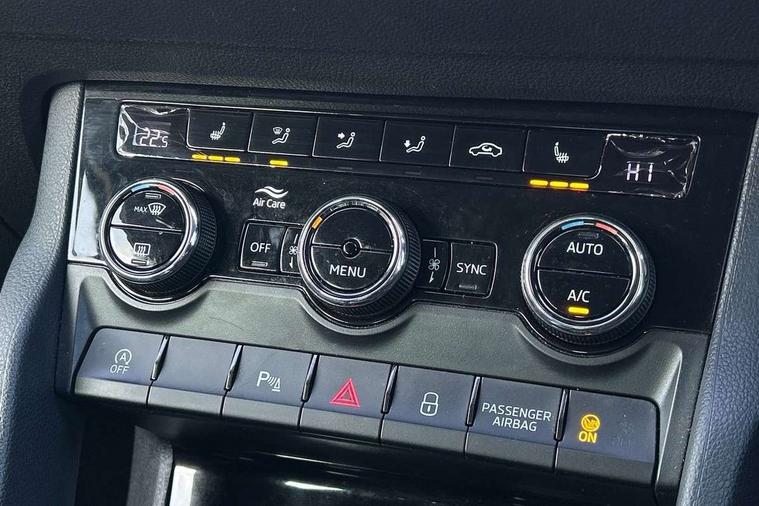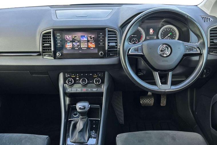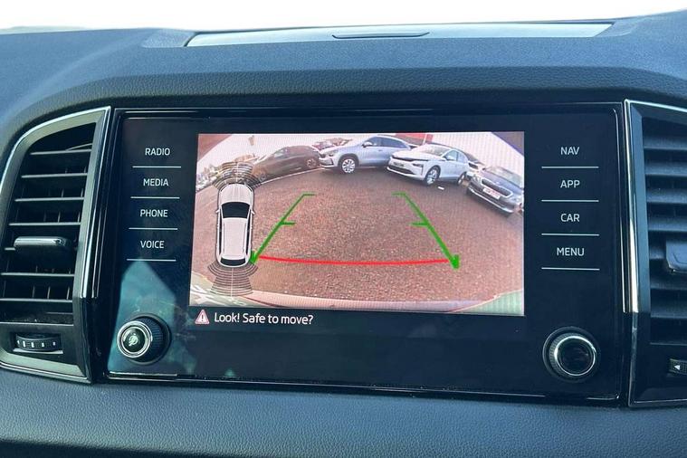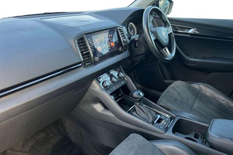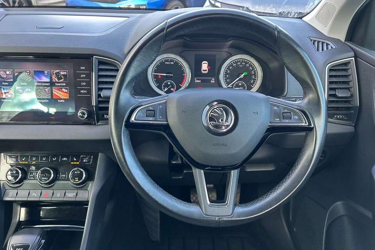 Drive mode selector, Driver alert system, Driver fatigue sensor, Driver profile selection, Multifunction colour trip computer, Outside temperature gauge, Rear view camera, Service interval indicator, Start/stop system with regenerative braking, Diesel particulate filter, DAB radio with Bluetooth, SD card slot, USB connection, Acoustic glass, Aero front windscreen wipers with intermittent function, Automatic headlight control system, Black electric window control buttons, Body colour door mirrors and handles, Body coloured bumpers, Electric front and rear windows with child proof lock, Full LED headlights + adaptive front light system + LED daytime running lights and front cornering fog lights, Headlight washers, Heated rear windscreen, LED rear lights with high functionality, Light assistant (coming/leaving home/tunnel light), Privacy glass, Safety reflectors on front doors, Third brake light, 1.5 litre bottle holders in driver and front passenger door panels, 12V socket in boot, 12v socket in front centre armrest with storage compartment and rear air vents, 2 Folding hooks and nets in boot, 2 Front readings lights for driver and passenger, 3 rear height adjustable headrests, 4 foldable roof handles with rear coat hooks, 4 lashing points on luggage floor, Backrest release, Cargo elements in boot, Chrome inner door handles, Dual zone climate control, Folding tables on the front seat backrests, Front head restraints, Front seat and rear pockets, Height adjustable front three point seats belts with tensioners, Height adjustable passenger seat, Height/reach adjust steering wheel, Ice scraper, Illuminated and cooled glovebox, Illuminated luggage compartment, Isofix child seat preparation outer rear, Net programme in boot, Pen holder, Pollen filter, Rear boot cover, Rear reading lights, Rear seats fixed folding and divided 60:40, Removable LED torch in the boot, Retractable parcel shelf attachable to tailgate, Safety vest holder, Storage box in upper central dashboard closed, Storage compartment below the passenger seat, Sunvisors with illuminated vanity mirrors, Textile floor mats, Umbrella under passenger seat, VarioFlex seats with retractable parcel shelf, Chrome roof rails + chrome pack - Kodiaq, Airbags - Front side, head, knee and curtain, Automatic door unlocking in case of crash, Automatic fuel cut off in case of crash, Driver airbag, Electronic parking brake with auto hold function, Emergency rear braking signal, ESC including ABS, MSR, ASR, EDS, HBA, DSR, RBS, MKB and traction control, Front assist radar scanning of the space in front of the car with automatic braking, Hill hold control, Passenger airbag with switch-off function, Pedestrian monitor, Seatbelt reminder signalisation and pretensioner for all seats, Three point seatbelts rear, Two tone horn, Tyre pressure display, Tyre pressure monitor, Alarm with interior monitoring, back up horn and tilt sensor with safe function, Electronic engine immobiliser, Keyless entry and keyless start with safe system, Remote central locking with 2 remote folding keys, Chrome framed air vents, Storage on wheel cover,