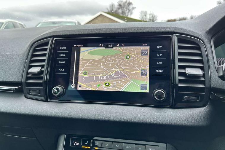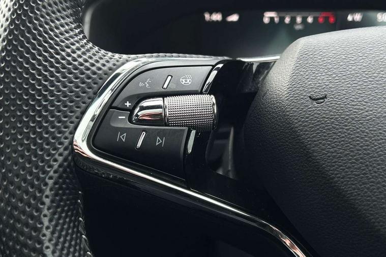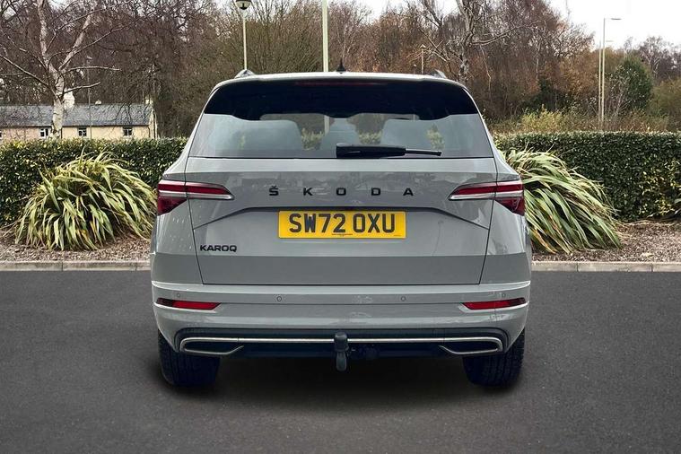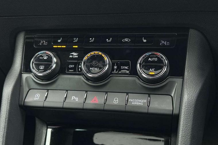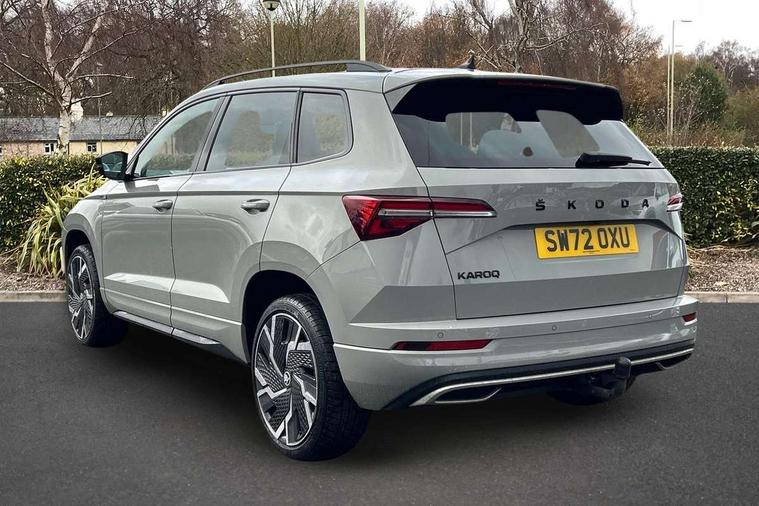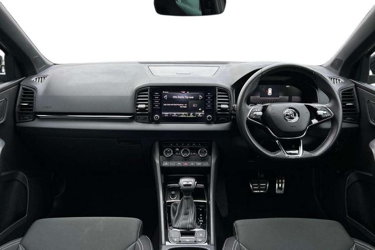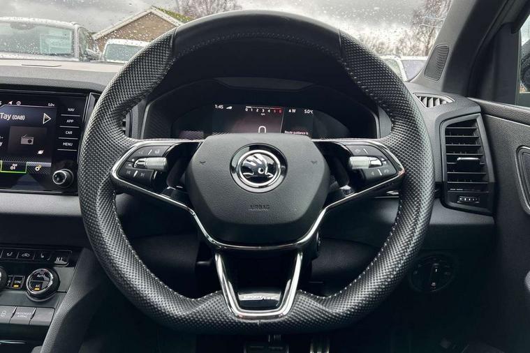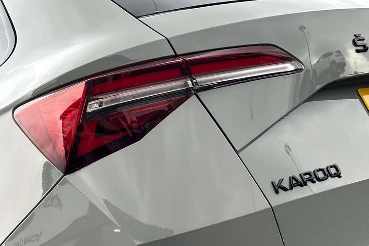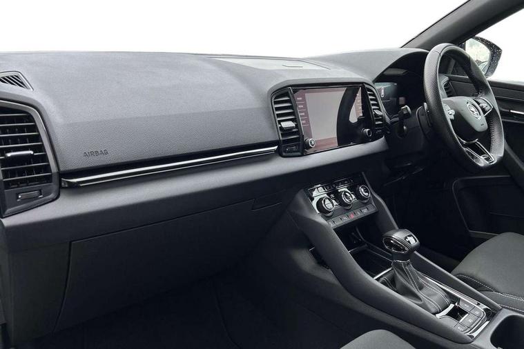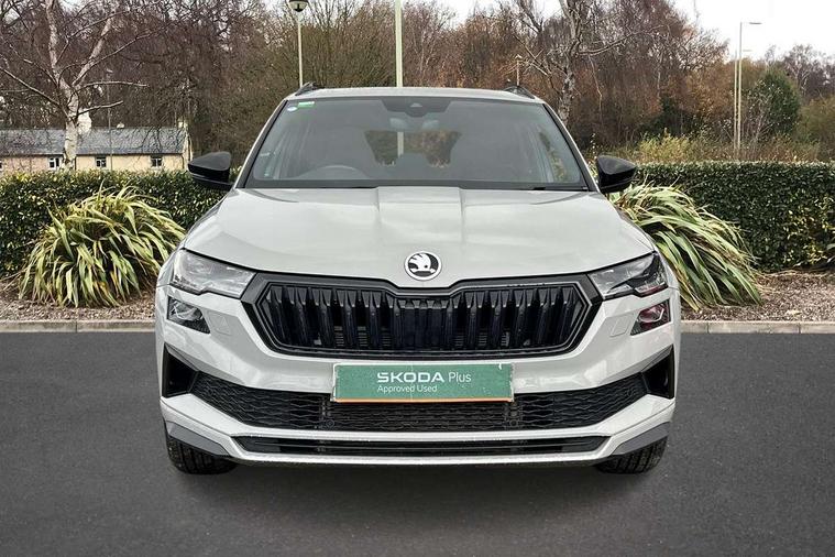 8" Digital display, Care connect, Driver fatigue sensor, Emergency services call system, Outside temperature gauge, Service interval indicator, SmartLink wireless for Apple and wired for Android, Start/stop system with regenerative braking, USB C Port x 2 in front centre console, Virtual pedal with electrically operated boot door, 8 Speakers, DAB radio with Bluetooth, USB connection, Acoustic glass, Aero front windscreen wipers with intermittent function, Auto dimming rear view mirror with light and rain sensors, Black door mirrors, Black electric window control buttons, Black radiator grille, Black roof rails, Body colour door handles, Dynamic headlight range control with cornering light function, Electric front and rear windows with child proof lock, Front door steps with SportLine logo, Heated rear windscreen, LED daytime running lights, LED rear lights with high functionality welcome effect and dynamic indicators, Light assistant (coming/leaving home/tunnel light), Panoramic sliding sunroof, Plastic scuff plates, Privacy glass, Protective door side sills in body colour, Rear diffuser, Rear side wing doors, Rear spoiler, Rear window wiper with washer system and intermittent control, Safety reflectors on front doors, Skoda lettering on tailgate in black, Sportline badge on front fender, Sportline decorative inserts with badging, Sports front and rear bumpers, 1.5 litre bottle holders in driver and front passenger door panels, 12V socket in boot, 12v socket in front centre armrest with storage compartment and rear air vents, 2 Folding hooks and nets in boot, 3 rear height adjustable headrests, 3 seat bench in 2nd row, 3 spoke leather sports multifunction steering wheel and silver stitching with gear shift paddles, 4 foldable roof handles with rear coat hooks, Black floor carpet, Black roof headlining, Chrome inner door handles, Double sided boot floor, Foldable hooks in the boot, Front head restraints, Height adjustable front three point seats belts with tensioners, Height/reach adjust steering wheel, Ice scraper, Illuminated glovebox, Illuminated luggage compartment, Isofix child seat preparation outer rear, Manual lumbar support for front seats, Pen holder, Pollen filter, Rear boot cover, Rear reading lights, Rear seats fixed folding and divided 60:40, Rubbish bin door, Safety vest holder, Single front passenger seat, Storage box in upper central dashboard closed, Sunvisors with illuminated vanity mirrors, Textile floor mats, Ticket holder, Titan black interior ceiling, Welcome animation with sportline logo, Light Pack - Karoq, Parking pack - Karoq, Automatic door unlocking in case of crash, Automatic fuel cut off in case of crash, Child locks on rear doors, Driver airbag, Electronic parking brake with auto hold function, Emergency rear braking signal, ESC including ABS, MSR, ASR, EDS, HBA, DSR, RBS, MKB and traction control, Front side airbags, Hill hold control, Knee airbags, Passenger airbag with switch-off function, Pedestrian monitor, Seatbelt reminder signalisation and pretensioner for all seats, Three point seatbelts rear, Two tone horn, Tyre pressure display, Tyre pressure monitor, Alarm with interior monitoring, back up horn and tilt sensor with safe function, Electronic engine immobiliser, Keyless entry and start/stop, Remote central locking with 2 remote folding keys, Black air vent surround, Black centre console, Satin black dashboard, Satin black door trim, 19" Vega black polished alloy wheels, Anti-theft wheel bolts protection, Matt black aero hub caps, Storage on wheel cover, Tool kit,