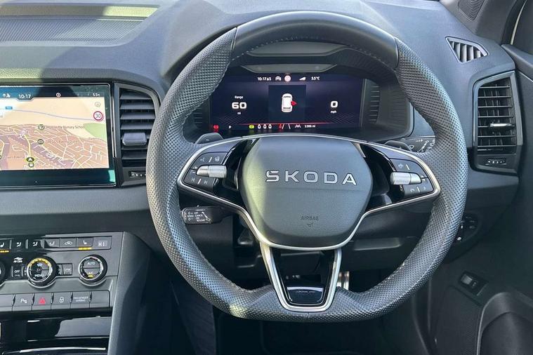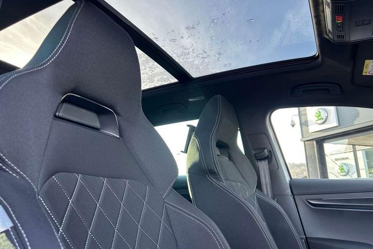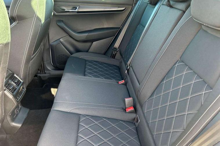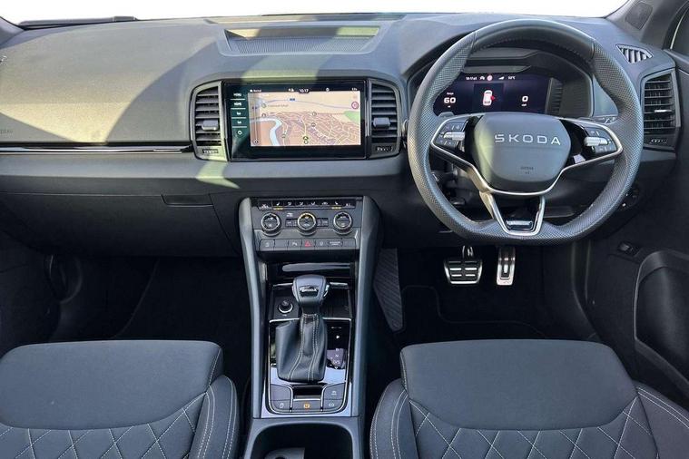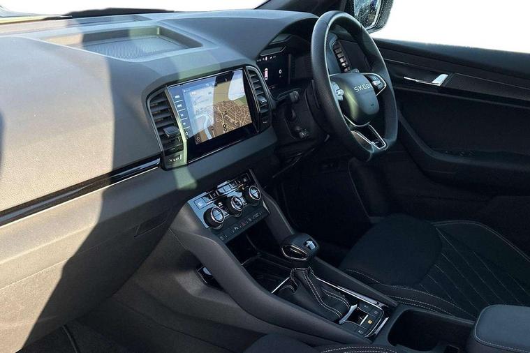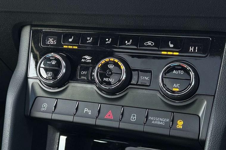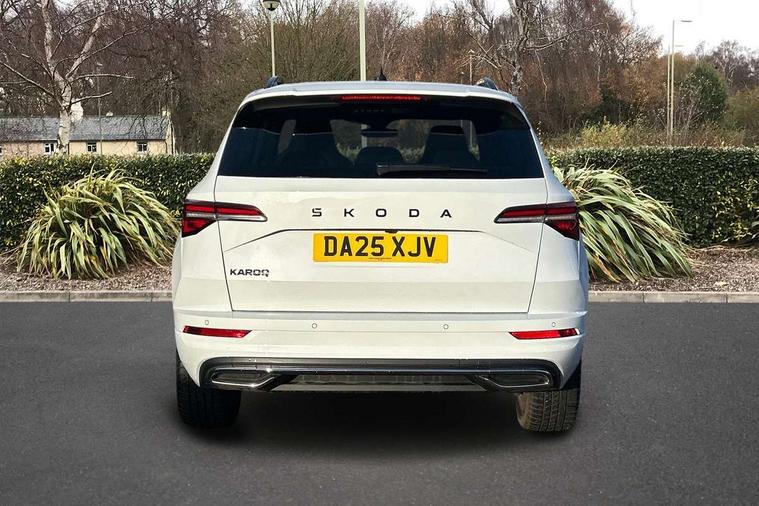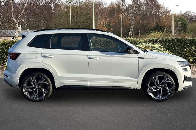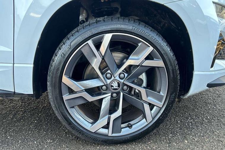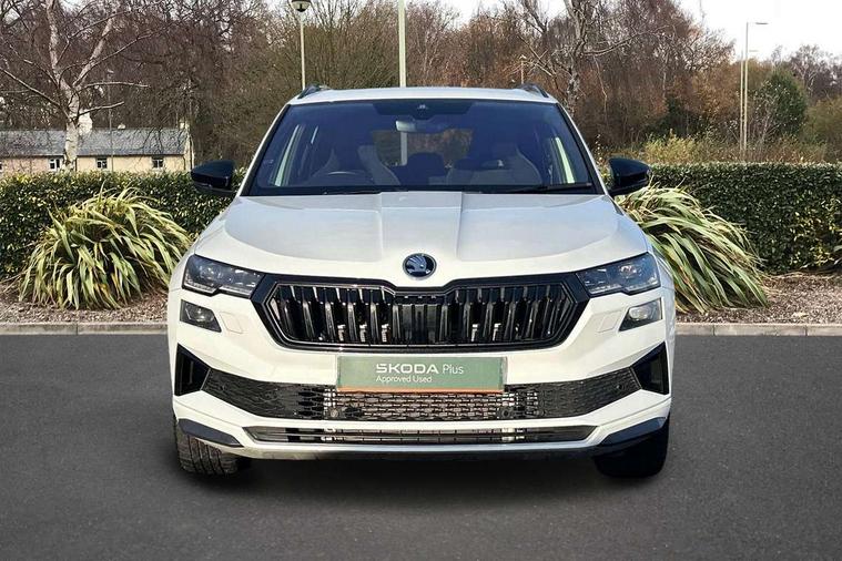 Advanced driver attention and drowsiness monitor, Emergency services call system, Outside temperature gauge, Sensor for driver assistance systems, Service interval indicator, SmartLink wireless for Apple and wired for Android, Start/stop system with regenerative braking, Traffic sign recognition, USB C Port x 2 in front centre console, Virtual Cockpit - 10.25" digital display, Virtual pedal with electrically operated boot door, Wireless smartphone charging, DAB radio with Bluetooth, USB connection, Acoustic glass, Aero front windscreen wipers with intermittent function, Auto dimming rear view mirror with light and rain sensors, Black door mirrors, Black electric window control buttons, Black radiator grille, Black roof rails, Body colour door handles, Electric front and rear windows with child proof lock, Extended rear roof spoiler, Front door steps with SportLine logo, Heated rear windscreen, LED daytime running lights, LED rear lights with high functionality welcome effect and dynamic indicators, Light assistant (coming/leaving home/tunnel light), Panoramic sliding sunroof, Plastic scuff plates in door apertures, Privacy glass, Protective door side sills in body colour, Rear diffuser, Rear side wing doors, Rear window wiper with washer system and intermittent control, Safety reflectors on front doors, Skoda lettering on tailgate in black, Sportline badge on front fender, Sports front and rear bumpers, Third brake light, Unique dark chrome design logo on alloy wheels, 1.5 litre bottle holders in driver and front passenger door panels, 12V socket in boot, 12v socket in front centre armrest with storage compartment and rear air vents, 2 x Tablet holder, 3 rear height adjustable headrests, 3 seat bench in 2nd row, 3 spoke sports leather heated multifunction steering wheel with DSG paddles, 4 foldable roof handles with rear coat hooks, Black floor carpet, Cargo elements in boot, Chrome inner door handles, Foldable hooks in the boot, Front head restraints, Height adjustable front three point seats belts with tensioners, Height/reach adjust steering wheel, Ice scraper, Illuminated glovebox, Illuminated luggage compartment, Isofix child seat preparation for front passenger seat, Isofix child seat preparation outer rear, Manual lumbar support for front seats, Pen holder, Pollen filter, Rear backrest release from boot, Rear boot cover, Rear package tray, Rear reading lights, Rear seats fixed folding and divided 60:40, Rubbish bin door, Safety vest holder, Single front passenger seat, Skoda lettering on steering wheel, Sportline decorative inserts, Storage box in upper central dashboard closed, Sunvisors with illuminated vanity mirrors, Textile floor mats, Ticket holder, Titan black interior ceiling, Umbrella under passenger seat, Under passenger seat storage compartment, Columbus pack - Karoq, LED Interior lighting pack with Skoda welcome logo - Karoq, Light Pack - Karoq, Non Smokers pack, Performance pack - Karoq, Winter plus pack with heated front and rear seats - Karoq, Automatic door unlocking in case of crash, Automatic fuel cut off in case of crash, Driver airbag, Electronic parking brake with auto hold function, Emergency rear braking signal, ESC (incl. ABS+MSR+ASR+EDS+HBA+DSR+RBS+MKB), Front side airbags, Head airbags, Hill hold control, Knee airbags, Passenger airbag with switch-off function, Pedestrian monitor, Seatbelt reminder signalisation and pretensioner for all seats, Three point seatbelts rear, Two tone horn, Tyre pressure monitor, Alarm with interior monitoring, back up horn and tilt sensor with safe function, Electronic engine immobiliser, Keyless entry and start/stop, Remote central locking with 2 remote folding keys, Black air vent surround, Black centre console, carbon door decor, Satin black dashboard, Satin black door trim, 19" Sagittarius anthracite alloy wheels, Anti-theft wheel bolts protection, Breakdown and tool kit,