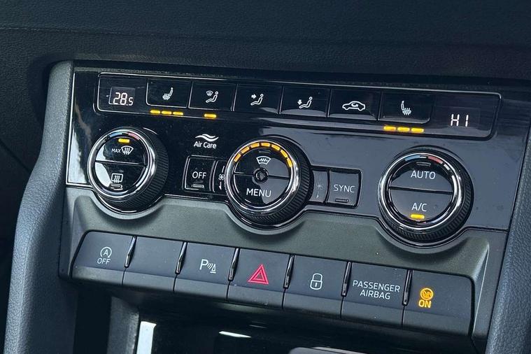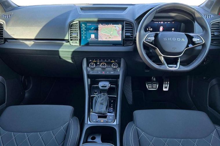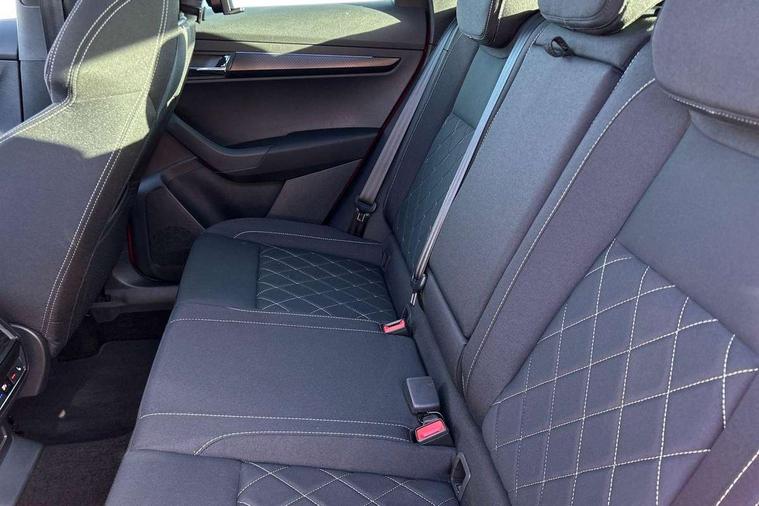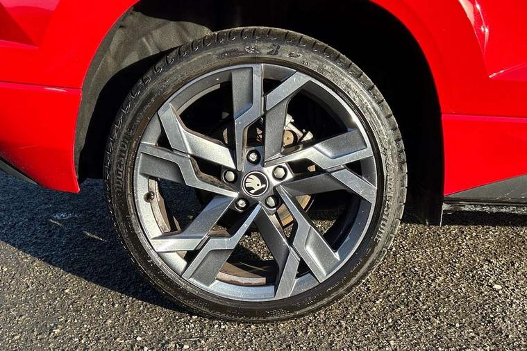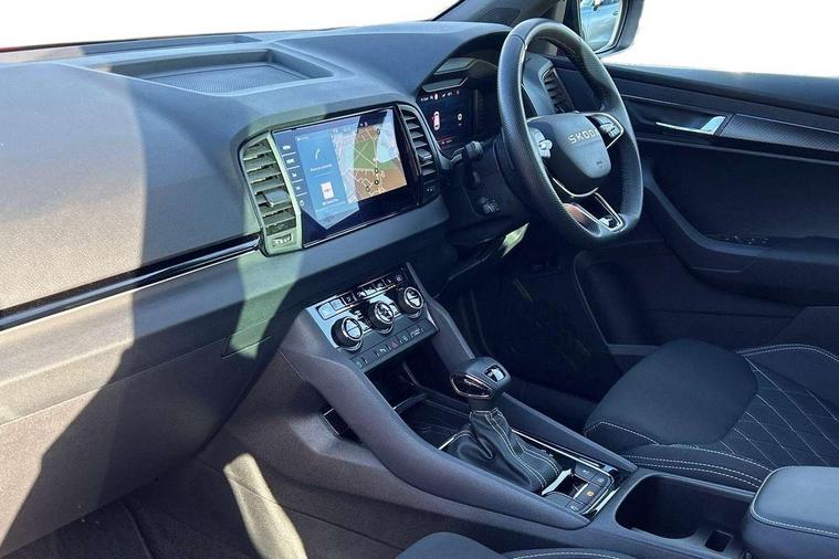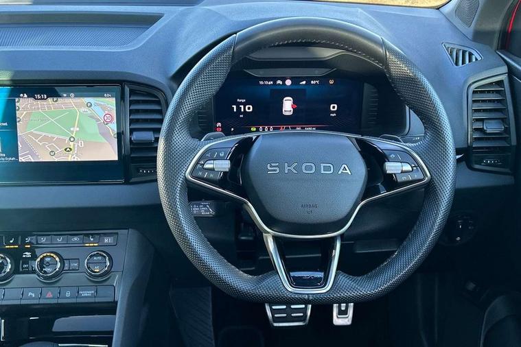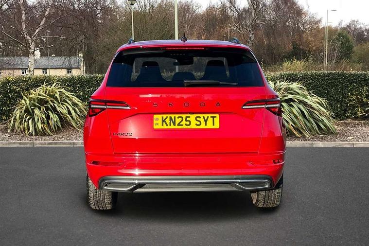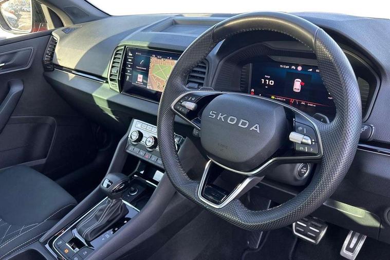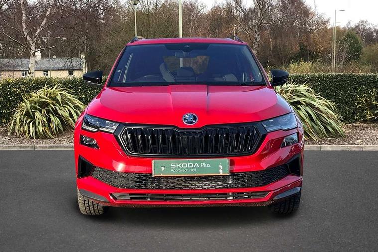Advanced driver attention and drowsiness monitor, Emergency services call system, Outside temperature gauge, Sensor for driver assistance systems, Service interval indicator, SmartLink wireless for Apple and wired for Android, Start/stop system with regenerative braking, Traffic sign recognition, USB C Port x 2 in front centre console, Virtual Cockpit - 10.25" digital display, Virtual pedal with electrically operated boot door, Wireless smartphone charging, DAB radio with Bluetooth, USB connection, Acoustic glass, Aero front windscreen wipers with intermittent function, Auto dimming rear view mirror with light and rain sensors, Black door mirrors, Black electric window control buttons, Black radiator grille, Black roof rails, Body colour door handles, Electric front and rear windows with child proof lock, Extended rear roof spoiler, Front door steps with SportLine logo, Heated rear windscreen, LED daytime running lights, LED rear lights with high functionality welcome effect and dynamic indicators, Light assistant (coming/leaving home/tunnel light), Panoramic sliding sunroof, Plastic scuff plates in door apertures, Privacy glass, Protective door side sills in body colour, Rear diffuser, Rear side wing doors, Rear window wiper with washer system and intermittent control, Safety reflectors on front doors, Skoda lettering on tailgate in black, Sportline badge on front fender, Sports front and rear bumpers, Third brake light, Unique dark chrome design logo on alloy wheels, 1.5 litre bottle holders in driver and front passenger door panels, 12V socket in boot, 12v socket in front centre armrest with storage compartment and rear air vents, 2 x Tablet holder, 3 rear height adjustable headrests, 3 seat bench in 2nd row, 3 spoke sports leather heated multifunction steering wheel with DSG paddles, 4 foldable roof handles with rear coat hooks, Black floor carpet, Cargo elements in boot, Chrome inner door handles, Foldable hooks in the boot, Front head restraints, Height adjustable front three point seats belts with tensioners, Height/reach adjust steering wheel, Ice scraper, Illuminated glovebox, Illuminated luggage compartment, Isofix child seat preparation for front passenger seat, Isofix child seat preparation outer rear, Manual lumbar support for front seats, Pen holder, Pollen filter, Rear backrest release from boot, Rear boot cover, Rear package tray, Rear reading lights, Rear seats fixed folding and divided 60:40, Rubbish bin door, Safety vest holder, Single front passenger seat, Skoda lettering on steering wheel, Sportline decorative inserts, Storage box in upper central dashboard closed, Sunvisors with illuminated vanity mirrors, Textile floor mats, Ticket holder, Titan black interior ceiling, Umbrella under passenger seat, Under passenger seat storage compartment, Columbus pack - Karoq, LED Interior lighting pack with Skoda welcome logo - Karoq, Light Pack - Karoq, Non Smokers pack, Performance pack - Karoq, Winter plus pack with heated front and rear seats - Karoq, Automatic door unlocking in case of crash, Automatic fuel cut off in case of crash, Driver airbag, Electronic parking brake with auto hold function, Emergency rear braking signal, ESC (incl. ABS+MSR+ASR+EDS+HBA+DSR+RBS+MKB), Front side airbags, Head airbags, Hill hold control, Knee airbags, Passenger airbag with switch-off function, Pedestrian monitor, Seatbelt reminder signalisation and pretensioner for all seats, Three point seatbelts rear, Two tone horn, Tyre pressure monitor, Alarm with interior monitoring, back up horn and tilt sensor with safe function, Electronic engine immobiliser, Keyless entry and start/stop, Remote central locking with 2 remote folding keys, Black air vent surround, Black centre console, carbon door decor, Satin black dashboard, Satin black door trim, 19" Sagittarius anthracite alloy wheels, Anti-theft wheel bolts protection, Breakdown and tool kit,
