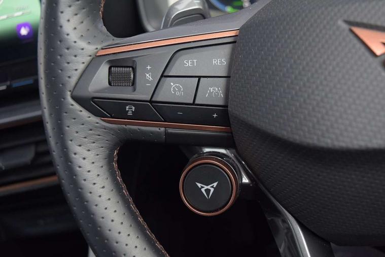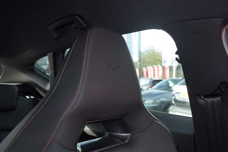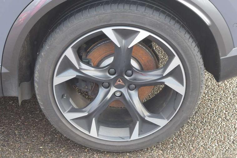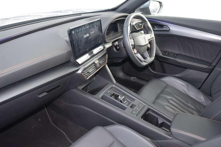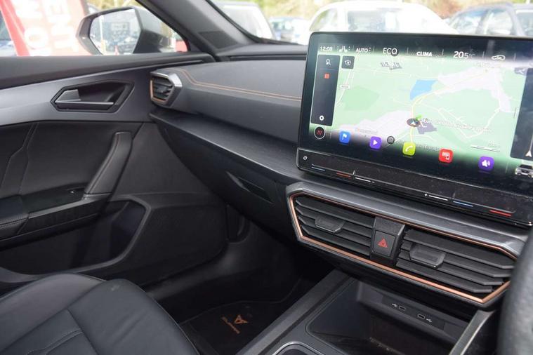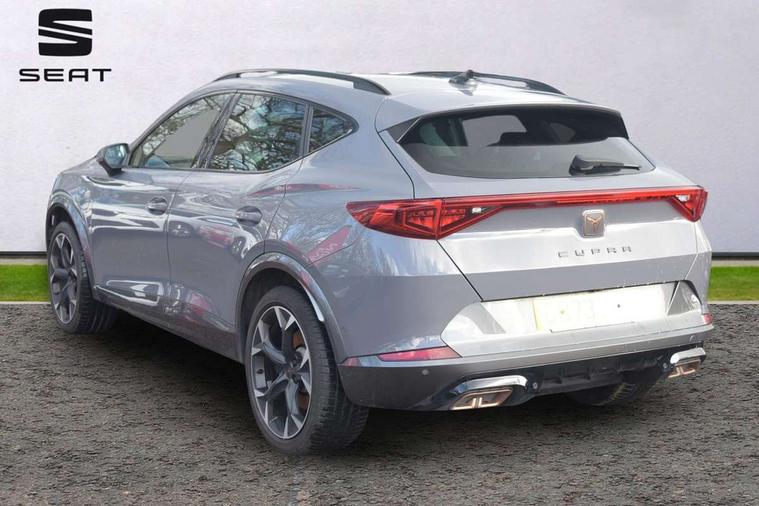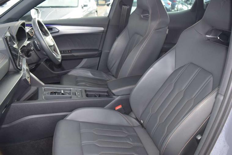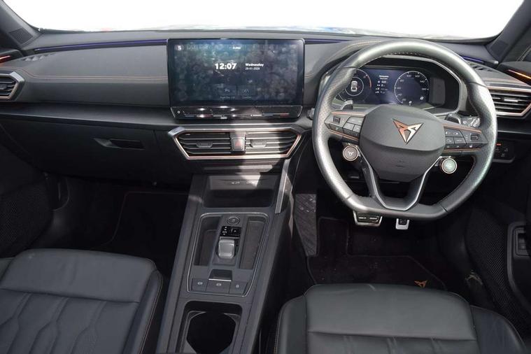 Digital cockpit and configurable dashboard, Driver alert system, Dynamic chassis control with driving profile selection (Comfort, Sport, CUPRA, Individual), Forward collision warning with automatic braking, Lane assist, Navigation system with 12'' Touchscreen Display, Park assist (inc front/rear parking sensors), Predictive adaptive cruise control with speed limiter, RPM, trip computer, outside temp gauge, instrument light brightness, low fuel warning light, lights on reminder, gearshift indicator, Service interval indicator, Speed sensitive power steering, Start/stop system with regenerative braking, Virtual pedal and electric tailgate, Voice control system, Wired Android Auto, Wireless apple carplay, Wireless phone charger, 10 amp mode 2 charging cable, 16 amp mode 3 charging cable, 3.6 kw On-board charger, Electronic locking differential and dynamic traction support, Sports suspension with front shock absoption, 2 front and 2 rear USB type C sockets, Auxiliary input socket, DAB radio, Auto dimming rear view mirror, Body colour door handles, Body coloured bumpers, Dark grey wing mirror, Daytime running light with automatic headlight control and coming home feature, Dynamic headlight range control, Electric front/rear windows, Electrically adjustable heated and folding door mirrors with memory function, Front fog lamps with cornering function, Gloss black roof rails and window surrounds, LED Headlights, LED Taillights with dynamic indicator, Rain sensing wipers, Rear diffuser with twin exhaust pipe on each side with simulated exhausts, Rear side wing doors, Rear wash/wipe, Sports bumpers, Third brake light, Tinted rear windows, Welcome lights, 12v power supply in centre console, 12V socket, 12v socket in loadspace, 2 front and 2 rear reading lights, 230V socket, 3 seat bench in 2nd row, 60/40 split rear bench seat with armrest and mechanical seat release, Black headlining, Cupra sports pedals, Dust/pollen filter, Front and rear head restraints, Front centre armrest, Height/reach adjust steering wheel, Illuminated interior front door sills, Illuminated sunvisor with mirror, Isofix, Leather heated multi-function sports steering wheel with start stop, CUPRA mode button and gear shift paddles, Luggage tie-down hooks, Single front passenger seat, Three zone climate control with control panel in rear, Wraparound lighting, Genuine Nappa leather Pack - Cupra, Safety and driving pack (XL) - Formentor, 3 point seatbelts on all rear seats, ABS, Brake control system - ESC and brake booster, Child proof door locks, Driver and front passenger airbags with front passenger airbag de-activation, Electronic parking brake, Front and rear disc brakes, Front side curtain airbags, Hill hold control, Public e-call, Seat belt reminder for front and rear seats, Tyre pressure monitoring system, Anti theft alarm system, Keyless entry and start system (KESSY), Locking wheel bolts, Copper and aluminium interior detailing, 19" 'Exclusive' machined sport matte black and silver alloy wheels, Tyre repair kit,