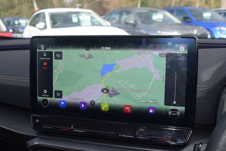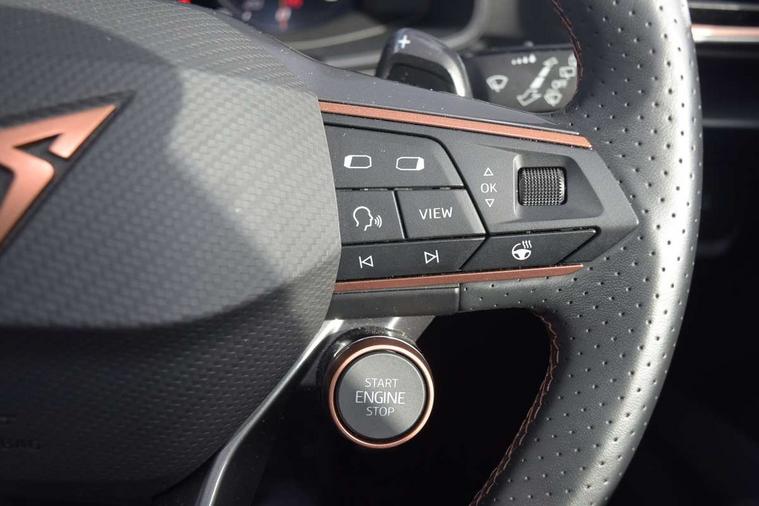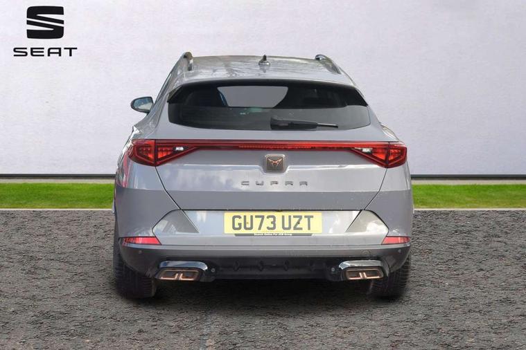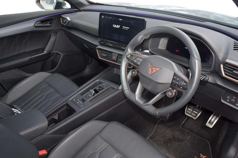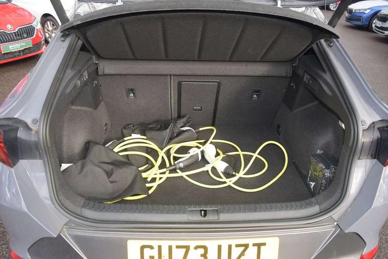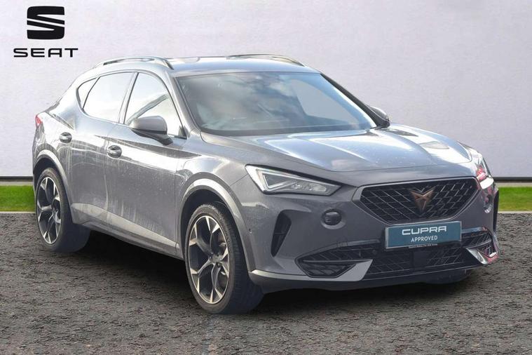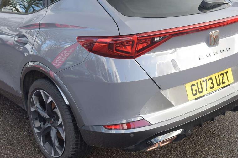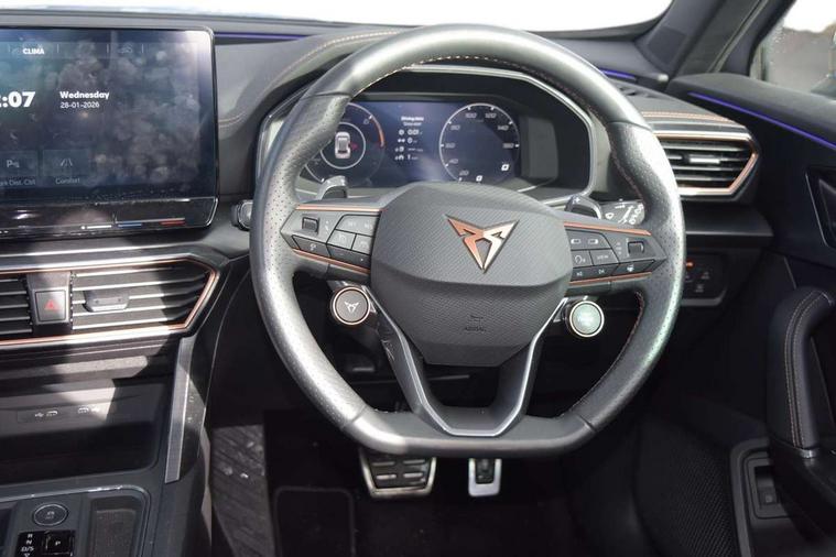 Digital cockpit and configurable dashboard, Driver alert system, Dynamic chassis control with driving profile selection (Comfort, Sport, CUPRA, Individual), Forward collision warning with automatic braking, Lane assist, Navigation system with 12'' Touchscreen Display, Park assist (inc front/rear parking sensors), Predictive adaptive cruise control with speed limiter, RPM, trip computer, outside temp gauge, instrument light brightness, low fuel warning light, lights on reminder, gearshift indicator, Service interval indicator, Speed sensitive power steering, Start/stop system with regenerative braking, Virtual pedal and electric tailgate, Voice control system, Wired Android Auto, Wireless apple carplay, Wireless phone charger, 10 amp mode 2 charging cable, 16 amp mode 3 charging cable, 3.6 kw On-board charger, Electronic locking differential and dynamic traction support, Sports suspension with front shock absoption, 2 front and 2 rear USB type C sockets, Auxiliary input socket, DAB radio, Auto dimming rear view mirror, Body colour door handles, Body coloured bumpers, Dark grey wing mirror, Daytime running light with automatic headlight control and coming home feature, Dynamic headlight range control, Electric front/rear windows, Electrically adjustable heated and folding door mirrors with memory function, Front fog lamps with cornering function, Gloss black roof rails and window surrounds, LED Headlights, LED Taillights with dynamic indicator, Rain sensing wipers, Rear diffuser with twin exhaust pipe on each side with simulated exhausts, Rear side wing doors, Rear wash/wipe, Sports bumpers, Third brake light, Tinted rear windows, Welcome lights, 12v power supply in centre console, 12V socket, 12v socket in loadspace, 2 front and 2 rear reading lights, 230V socket, 3 seat bench in 2nd row, 60/40 split rear bench seat with armrest and mechanical seat release, Black headlining, Cupra sports pedals, Dust/pollen filter, Front and rear head restraints, Front centre armrest, Height/reach adjust steering wheel, Illuminated interior front door sills, Illuminated sunvisor with mirror, Isofix, Leather heated multi-function sports steering wheel with start stop, CUPRA mode button and gear shift paddles, Luggage tie-down hooks, Single front passenger seat, Three zone climate control with control panel in rear, Wraparound lighting, Genuine Nappa leather Pack - Cupra, Safety and driving pack (XL) - Formentor, 3 point seatbelts on all rear seats, ABS, Brake control system - ESC and brake booster, Child proof door locks, Driver and front passenger airbags with front passenger airbag de-activation, Electronic parking brake, Front and rear disc brakes, Front side curtain airbags, Hill hold control, Public e-call, Seat belt reminder for front and rear seats, Tyre pressure monitoring system, Anti theft alarm system, Keyless entry and start system (KESSY), Locking wheel bolts, Copper and aluminium interior detailing, 19" 'Exclusive' machined sport matte black and silver alloy wheels, Tyre repair kit,