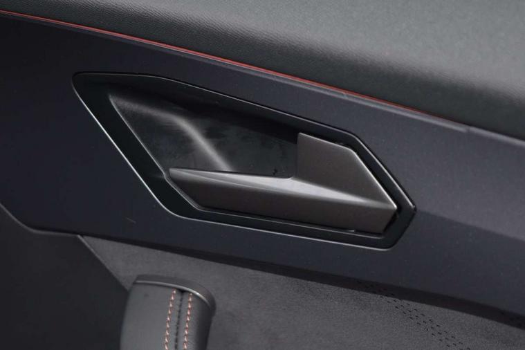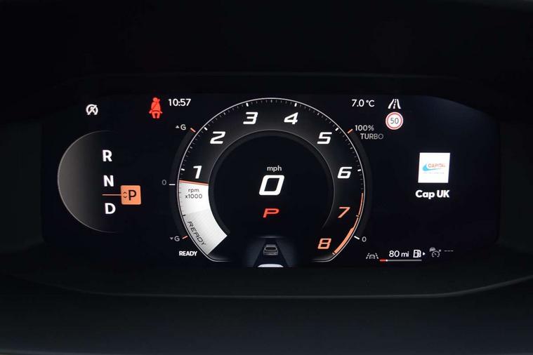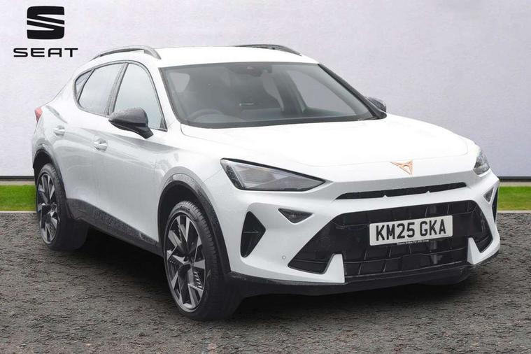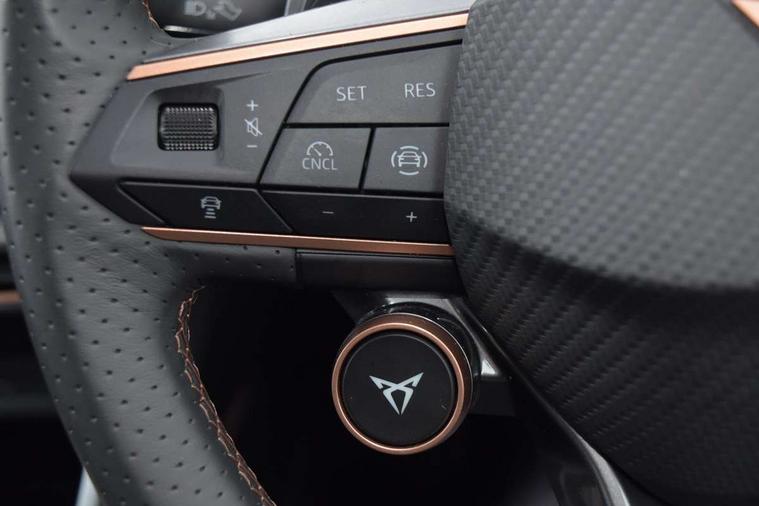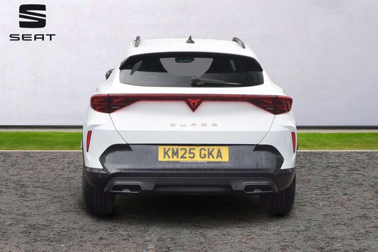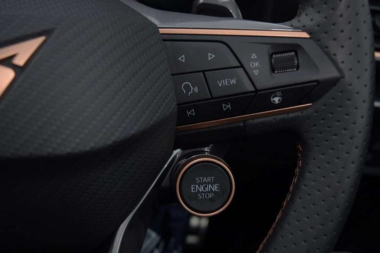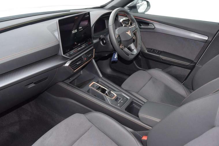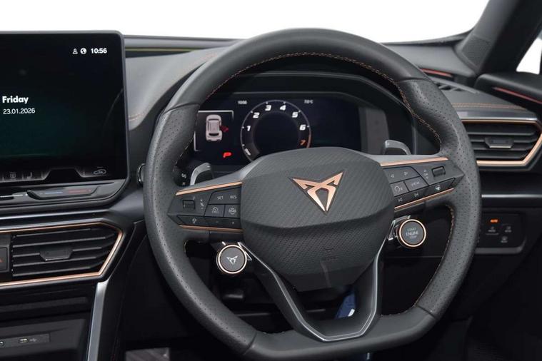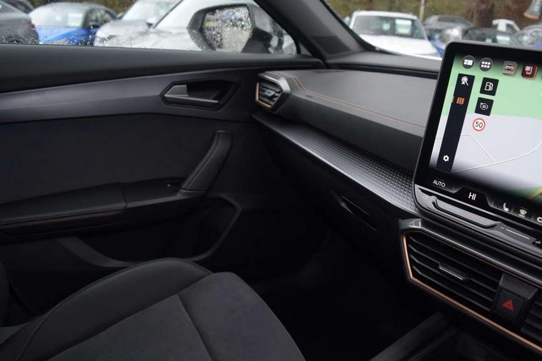 10.25" digital cockpit and configurable dashboard, Adaptive cruise control with follow-to-stop and speed limiter, Advanced driver alert system, Driving profile selection, Dynamic road sign display, Emergency steering support with turn assist, Forward collision warning with automatic braking, Front and rear parking sensors, Full link phone integration, Lane assist, Progressive steering, Rear view camera, RPM, trip computer, outside temp gauge, instrument light brightness, low fuel warning light, lights on reminder, gearshift indicator, Service interval indicator, Start/stop system with regenerative braking, Virtual pedal and electric tailgate, Voice control system, Wired Android Auto, Wireless apple carplay, Wireless phone charger, CUPRA sport suspension, Electronic locking differential and dynamic traction support, 2 front and 2 rear USB type C sockets, Media system with navigation, 12.9" touchscreen display, voice control, DAB, steering wheel mounted controls, Auto dimming rear view mirror, Body colour door handles, Body coloured bumpers, Dark grey wing mirror, Daytime running light with automatic headlight control and coming home feature, Door panel ambient lighting, Dynamic headlight range control, Electric front/rear windows, Electrically adjustable heated and folding door mirrors with memory function, Gloss black roof rails and window surrounds, High beam assist, LED 3rd brake light, LED front fog lamps with cornering function, LED Headlights, LED Taillights with dynamic indicator, Rain sensing wipers, Rear diffuser with black simulated exhaust pipes, Rear fog lights, Rear side wing doors, Rear wash/wipe, Tinted rear windows, Welcome lights (within exterior mirror housing), 12V socket, 2 front and 2 rear reading lights, 3 seat bench in 2nd row, 60/40 split rear bench seat with armrest and mechanical seat release, Black headlining, Black interior roof lining, Cupra sports pedals, Dust/pollen filter, Electrically adjustable driver's seat with memory and lumbar support, Front and rear head restraints, Front centre armrest, Heated front seats, Heated supersports multifunction leather steering wheel with satellite buttons and gear shift paddles, Height/reach adjust steering wheel, Illuminated aluminium doorsteps, Illuminated interior front door sills, Illuminated sunvisor with mirror, Isofix, Leather dashboard, door insert and side trim panel, LED smart wraparound lighting, PVC/Dinamica microfiber upholstery + bucket seats, Satellite steering wheel, Single front passenger seat, Storage pockets on rear of front seats, Three zone climate control with control panel in rear, Variable luggage/load compartment floor, 3 point seatbelts on all rear seats, ABS, Brake control system - ESC and brake booster, Child proof door locks, Driver and front passenger airbags with front passenger airbag de-activation, Electronic parking brake, Front and rear disc brakes, Front side curtain airbags, Hill hold control, Public e-call, Seat belt reminder for front and rear seats, Tyre pressure monitoring system, Anti theft alarm system, KESSY Advanced - Keyless start, keyless entry with SAFELOCK, Locking wheel bolts, Copper and aluminium interior detailing, 19" Sandstorm machined sport black and silver alloy wheels,