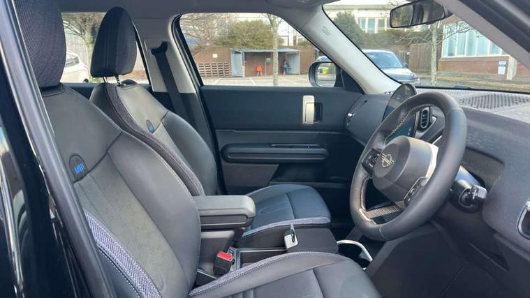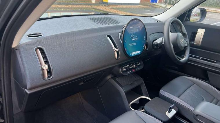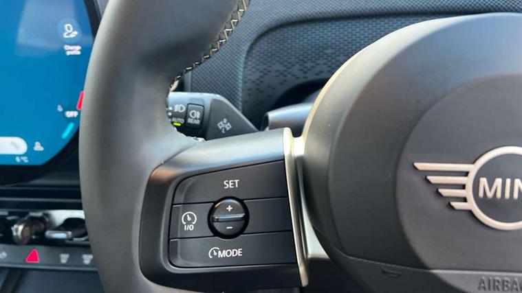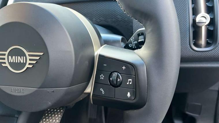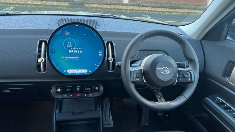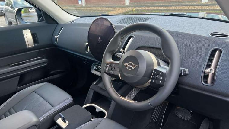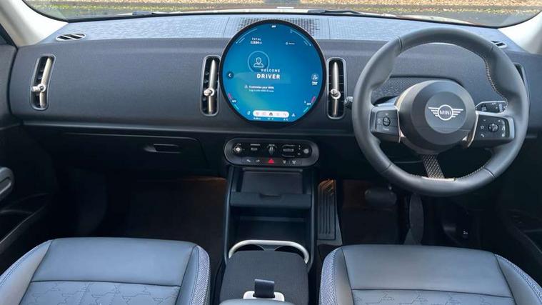 Bluetooth connection, Circular OLED Screen, Compatible mobile phone bluetooth with audio streaming, Cruise Control (DCC), Digital dashboard display, Driving assistant, E-call, Electro-mechanical speed dependant steering assistance, MINI Experience Modes, Mini navigation system, MINI TeleServices, Parking assistant in camera and ultrasound based assistance system, rear view camera, parking aid and distance control, Auto transmission with Paddles, Larger capacity fuel tank, 6 speakers, DAB Digital radio, Personal eSim, Auto tailgate, Electric adjustable heated door mirrors, Front and rear electric windows, Heated rear window, LED daytime running lights, LED Headlights, LED rear lights, LED third brake light, Rain sensor with auto headlights, Rear side wing doors, Rear window wiper, Roof rails, 3 seat bench in 2nd row, 60/40 split rear bench seat, Auto air conditioning, Floor mats, Front armrest, Front headrests, Heated steering wheel, Height and length steering column adjustment, Light headliner, Rear headrests, Single front passenger seat, Sport Vescin Steering Wheel, Sunvisors with vanity mirrors, Vescin/Cloth upholstery, 3x3 point rear seat belts, 6 Airbags - front, side, head and seat belt tensioners, ABS, DSC - Dynamic Stability Control, Electronic handbrake, Electronic Stability Programme (ESP), Front ISOFIX (iSize), Hill hold assist, Hill start assist, Manual rear child locks, Traction control, Tyre pressure monitoring system, Warning triangle, Alarm system with tilt sensor, monitoring doors, bonnet interior and tailgate, Auto drive away locking, Deadlocking function, Electronic vehicle immobiliser, Locking wheel bolts, Remote control locking, Start/stop toggle with keyless go, Black/Blue dashboard knit, MINI Mobility Kit,
