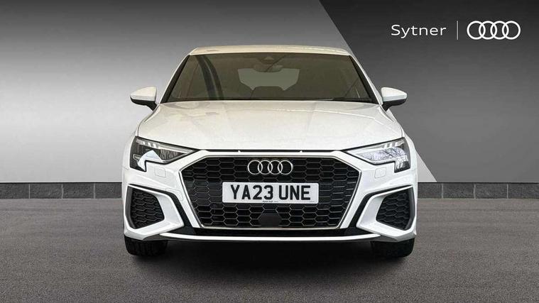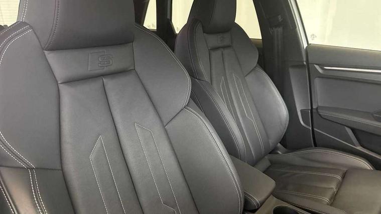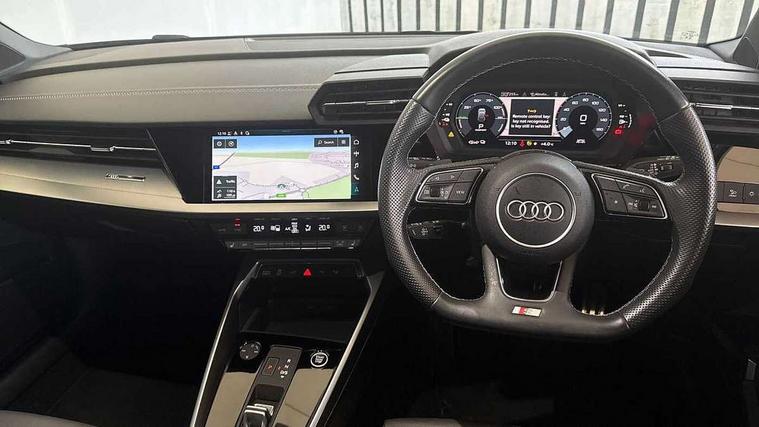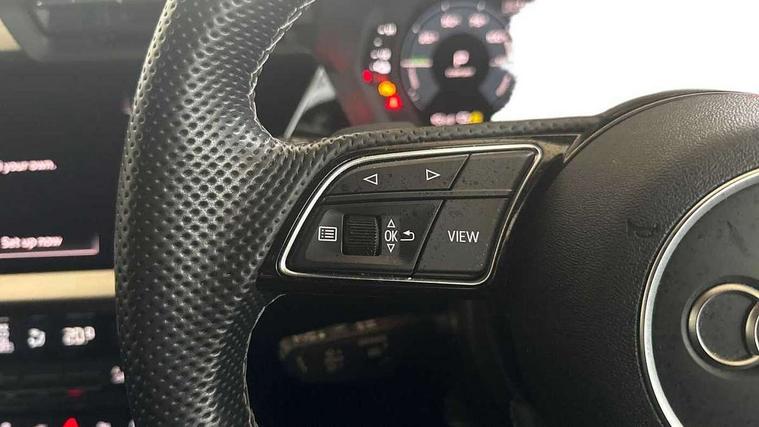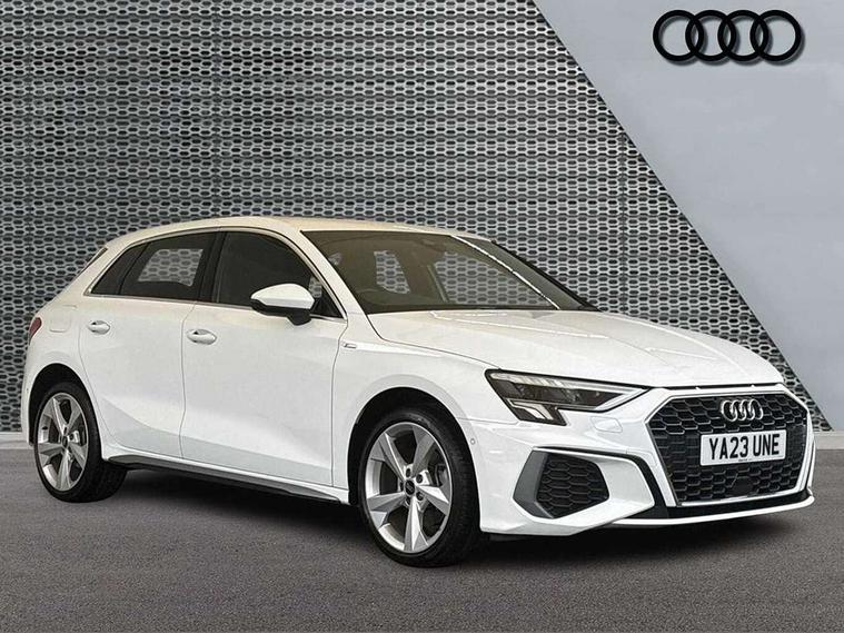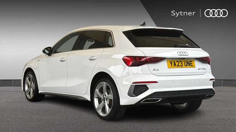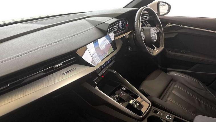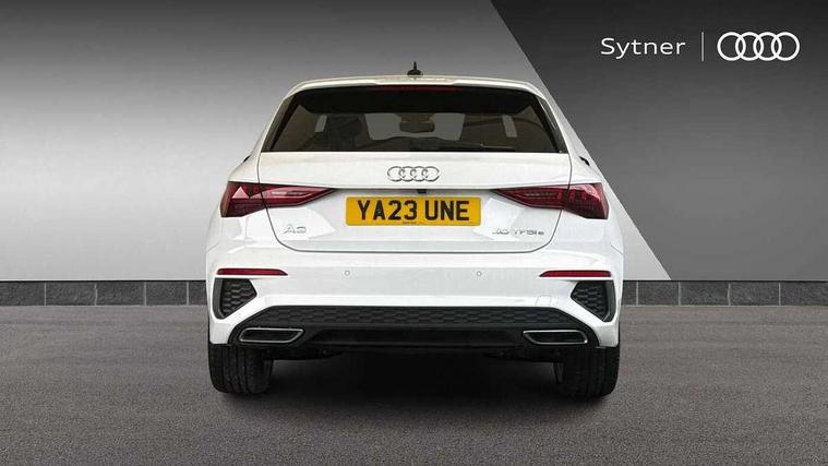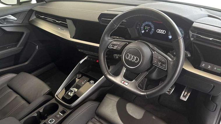 Audi drive select (Auto, Comfort, Dynamic, Efficiency and Individual), Audi smartphone interface, Audi Virtual Cockpit - 10.25" digital and colour instrument cluster, Automatic start/stop system with recuperation, Bluetooth interface, Camera based traffic sign recognition, Collision avoidance assistant, e-Call (emergency call), Electromechanical power speed sensitive steering, Lane departure warning system, MMI Navigation Plus with high resolution 10.1" colour touch screen display, Service indicator, Trip computer, Voice control system with natural language interaction, 3 pin 10 amp domestic charging cable, 3.6 kw On-board charger, Standard suspension, Type 2 mode 3 32 amp charging cable, Type 2 socket for AC charging, 2xUSB-C connection with data and charging functions, 6 passive loudspeakers, DAB Digital radio, 3rd brake light, Acoustic glass windscreen, Aluminium window trim, Auto dimming frameless rear view mirror, Body colour exterior mirrors, Electrically adjustable/heated/folding/dimming door mirrors with kerb view includes integrated LED indications + kerb view function for passenger side, Front electric windows, Illuminated aluminium inserts front door sills with S logo, LED daytime running lights, LED headlights with LED rear lights and dynamic rear indicators, Light and rain sensors, Privacy glass - dark tinted rear window, rear door and side windows, Rear electric windows, Rear side air outlets in grained matt black, Rear side wing doors, Rear wiper, S line bumpers, S roof spoiler, 12V socket and storage compartment in front centre console, 3 seat bench in 2nd row, 3 spoke leather multifunction steering wheel with paddle shift, 4 way electrically adjustable lumbar support for driver and front passenger, 60/40 split folding rear seat bench, Black cloth headlining, Dual zone electronic climate control, Front and rear centre armrest in leather, Front and rear headrests, Front/rear floor mats, Height and reach adjustable steering wheel, Interior lighting - glove compartment light and right hand side, Luggage compartment floor covering, Manual boot compartment lid, Manually adjustable front seats, Seat side bolsters, Single front passenger seat, Stainless steel pedals and front footrest in black, Tool kit, Twin leather upholstery with front sports seats S embossed logo, Aluminium interior elements pack - A3 Sportback, LED interior lighting pack - A3 Sportback, S line styling pack - A3 Sportback, 3x3 point rear seat belts, Driver and front passenger airbag with passenger airbag deactivation, Electronic Stabilisation Control (ESC) including ABS, ASR and EDL, First aid kit with warning triangle and 2 safety vests, Front side airbags with head airbags and interaction airbag, Pre-sense front with pedestrian and cyclist detection, Seatbelt monitoring, Tyre pressure loss indicator, Anti theft alarm, Anti-theft wheel bolts, Electronically operated child lock, Immobiliser, Remote control central locking, Dark spectrum aluminium inlays, accent surfaces in the dashboard and centre console in platinum grey silk effect paint finish, Tyre repair kit,