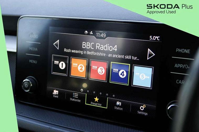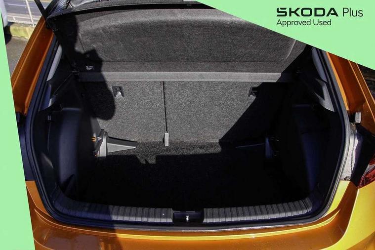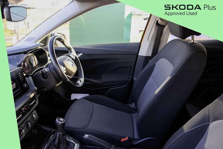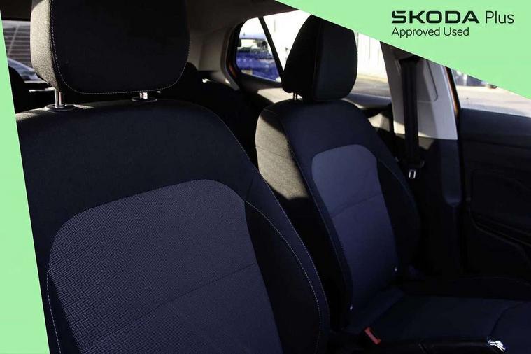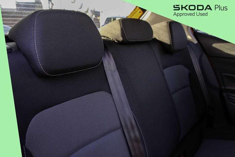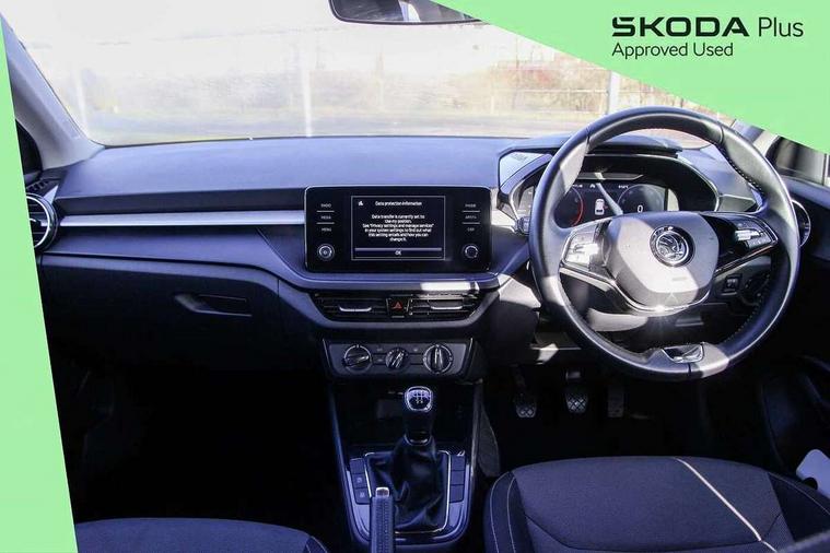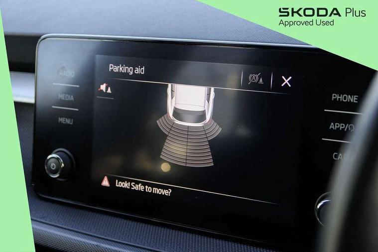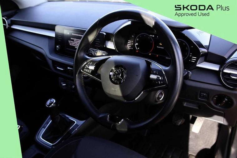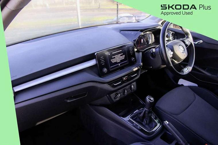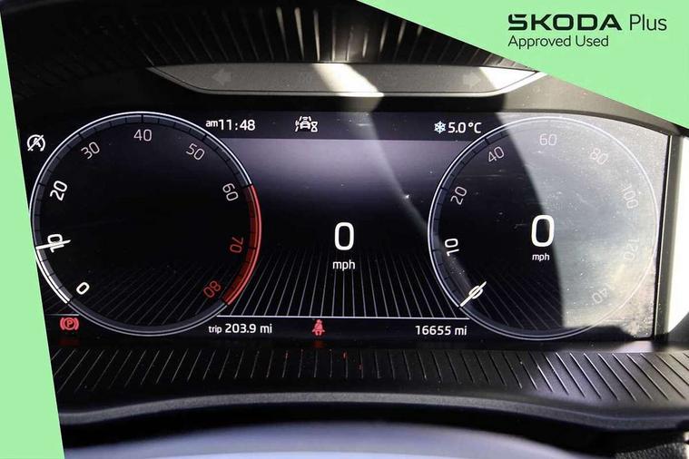 Bluetooth connection, Driver alert system - DAS, Electromechanical power steering, Exterior temperature gauge, Lane assist including road edge detection, Service interval indicator, Virtual cockpit with 10.25" colour display, 2x USB-C in the front (for data transmission and charging), 6 Speakers (4 in front and 2 in rear), Auxiliary socket for external MP3 player, Bolero radio with 8" colour display, DAB digital radio reception, Basic rear lights, Body coloured bumpers, Dimming rear view mirror with black frame, Door mirror integrated indicators, Electrically adjustable and heated door mirrors, Electrically adjustable front windows with function auto up/down, Front window wiper intermittent control, Headlight range control - Automatic, Ice scraper in fuel cap, LED daytime running lights with coming and leaving home feature, Mechanical adjustable rear windows, Privacy glass, Rear LED fog light, Rear side wing doors, Rear window wiper with washing nozzles, Roof mounted spoiler, SKODA tailgate lettering in chrome, Third brake light, 3 rear headrests, Backrest split and folding, Central console with fixed cup holder and storage box, Chrome handbrake release button, Fabric upholstery, Gearshift knob/handle in leather, Grain satin black interior door handles, Hand brake lever handle in leather, Height adjustable front headrests, Height adjustable steering wheel, ISOFIX and TopTether anchorage points to the outer rear seats, ISOFIX and TopTether on the front passenger seat, Luggage compartment lighting, Pollen filter, Rear seat bench unsplit, Single front passenger seat, Storm grey headlining, Sun visors with mirror and airbag label on passenger side, Ticket holder, Umbrella in drivers door, 3-point height adjustable front seats belts with pretensioner and force limiter, Automatic warning lights in case of crash, Driver and passengers airbag with switch off function, e-Call+, ESC including ABS, MSR, ASR, EDS, HBA and XDS, Front and rear seat belt warning, FRONT ASSIST (AEB City and AEB Inter Urban), Front side airbags, Head airbags, One tone horn, Pedestrian protection, Three rear 3-points safety seat belts with pretensioner and force limiter including stop function for outer rear seat belts, Tyre pressure monitoring system, Anti-theft alarm system including immobiliser, interior monitoring, backup horn, and towing protection, Anodized cross line upper decorative trim, Colour Edition air vents, Grain satin black central console cover, Grain satin black lower decorative trim, Satin black door and side trim panel in front, Anti-theft wheel bolts protection, Super-low rolling resistance tyres,