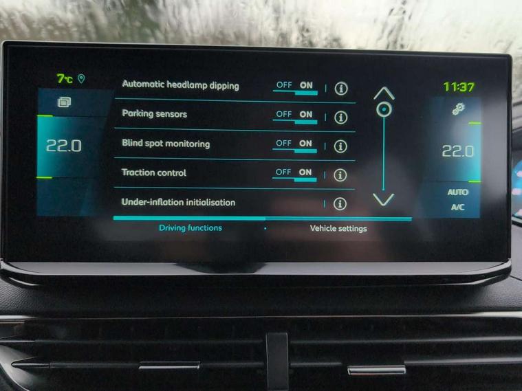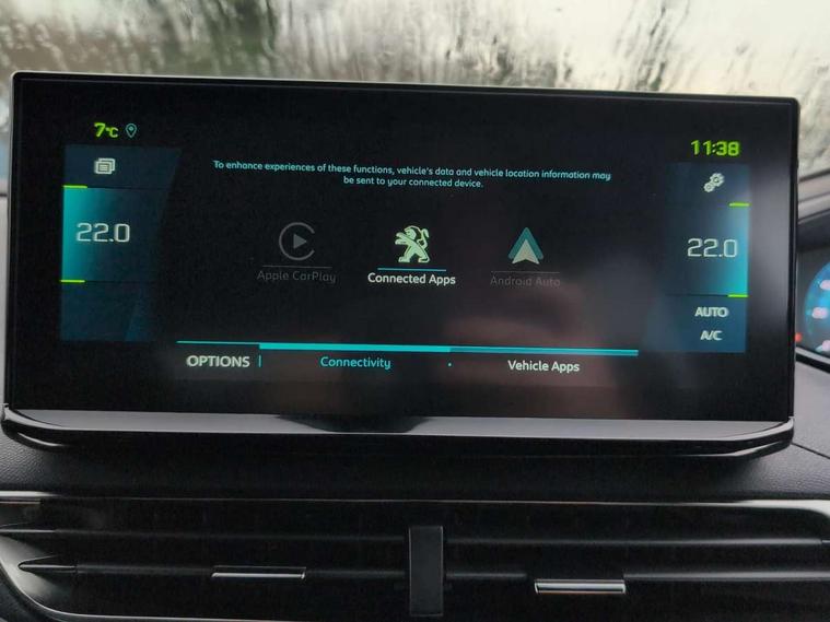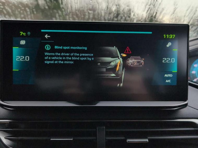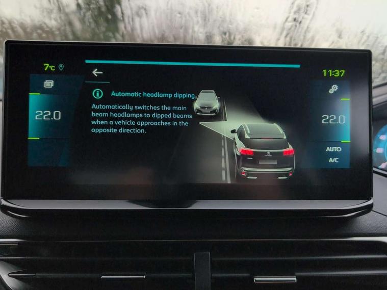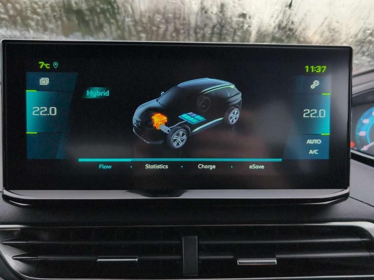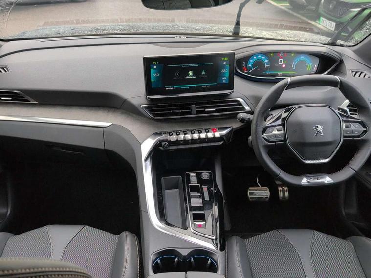 3D connected navigation with 10" HD touchscreen + voice recognition system, Blind spot detection system, Bluetooth telephone facility, Drive mode selector (Electric, Hybrid, Sport), Driver Attention Alert level 3, Driving Time Warning (DAA1), Emergency services call system, Extended traffic sign recognition, Exterior temperature indicator with ice warning, Lane departure warning system, Lane Keeping Assistance (LKA) with road edge detection, Mirror screen with Apple CarPlay and Android auto, Multi function trip computer, PEUGEOT i-Cockpit with compact sports steering wheel, PEUGEOT i-Cockpit with configurable 12.3" Head-up digital instrument panel, PEUGEOT SOS and assistance, Rear parking sensor, Rear passenger USB charging sockets (x2) (type A), Speed limit recognition and recommendation, Deferred charging option, configurable in car or via My PEUGEOT App, Dynamic stability control and electronic anti-skid system, Mode 3 type 2 cable for wallbox charging, DAB Digital radio, USB socket in front centre console, 2 X Rear number plate lights, Auto self levelling headlights, Automatic hazard light activation upon heavy brake application, Automatic triggered rear windscreen wiper in reverse gear, Black with chrome detailed front wing trim, Body colour door handles, Body colour rear roof spoiler with stainless steel edging trim, Body protectors (wheel arches + protection at bottom of doors) in black, Dark tinted rear side windows + tailgate window, Diamond Black door mirror shells, Electric heated folding door mirrors, Front windscreen wiper with magic wash cleaning system, Full LED headlights with fog mode, Gloss black B and C pillar and aerodynamic deflector trim, Gloss black front bumper air scoops, Gloss black rear cluster connecting strip, Gloss black windscreen trim, Headlights left on audible warning, Heated rear windscreen with integrated antenna, High beam assist, HYBRID emblem on front wings and tailgate, LED daytime running lights in fang style, LED front indicator, LED side indicator lights integrated into door mirrors, LED third brake light, One touch electric front/rear windows with pinch protection, Rear LED Peugeot signature 'Claw Effect' lights with clear lens and scrolling LED direction indicators, Rear side wing doors, Twin exhaust effect trim, 12V Sockets in dashboard, rear cabin and load area, 2 cupholders in front centre console, 2 x Rear reading spotlights, 2x Rear coat hooks, 3x Isofix child seat fittings in the front passenger and outer rear seats, 4 Grab handles retractable and damped, Aikinite stitching in armrest, gear lever and dashboard facia, Aluminium pedals, Blue ambient lighting for connecting zone, Blue ambient lighting to front door panels, central cup holders, Blue ambient lighting to headup instrument panel, Cabin pre-conditioning, Centre front armrest with butterfly wing opening and illuminated storage compartment, Driver seat manual adjustment (longitudinal and back rest angle), Dual zone automatic climate control, e-Toggle compact gear selector, Electric power steering with reach and rake adjustable steering column, Fixed boot floor with access to the charging cable storage box, Flocked front door pocket interior with blue ambient lighting, Flocked glovebox interior, Foldable front passenger seat with picnic table, Footwell illumination, Front interior light with 2 reading spotlights and rear interior light with timer, Front seat back map pockets, Gear shift indicator, Illuminated glove box, central storage area and load area, Illuminated vanity mirrors, Individual left and right controls in boot for seat folding, LED interior lighting in storage spaces and load area, LED roof interior lighting, Mistral floor mats with Aikinite contrast stitching, Mistral full grain perforated leather steering wheel with aikinite stitch detail and satin chrome 'GT' emblem, Rear armrest with ski flap and two cup holders, Rear bench seat with central armrest and ski hatch, Rear centre console ventilation system, Roof lining - Mistral black, Satin chrome dashboard trim, Satin chrome digital instrument panel, Satin chrome front door panel recess trim, Satin chrome interior door handles, Satin chrome scorpion's tail and toggle switch trim, Seatbelt not fastened audible and visual alert for front seats, Seatbelt unfastened on the move audible and visual alert for front and rear seats, Drive assist plus pack with front parking sensors - 3008 Plug in hybrid, Visibility pack - 3008 GT, 3x Rear three-point retractable seatbelts with force limiters in the outer rear seats, ABS (Anti-lock Braking System) with EBD (Electronic Brakeforce Distribution) and EBA (Emergency Braking Assistance), Acoustic vehicle alerting system, Adaptive driver and front passenger airbags with passenger airbag deactivation function, Driver and front passenger side airbags, Electric child locking functionality on rear windows and doors, Electric parking brake, Front and rear curtain airbags, Front optimised safety headrests and 3 x rear retractable headrests with height adjustable, Front three point retractable seatbelts height adjustable with pre tensioners and force limiters, Front ventilated disc brakes and rear disc brakes, Hill start assist, Two tone horn, Automatic door locking when moving off, Electronic immobiliser, key operated exterior door lock from the left hand door, Perimetric and volumetric alarm with lift and tilt sensor, Peugeot Open and Go System, Remote control central locking with two plip keys, Michelin e-primacy 225/55 R18 102V class A+ tyres, Tyre repair and inflation kit,
