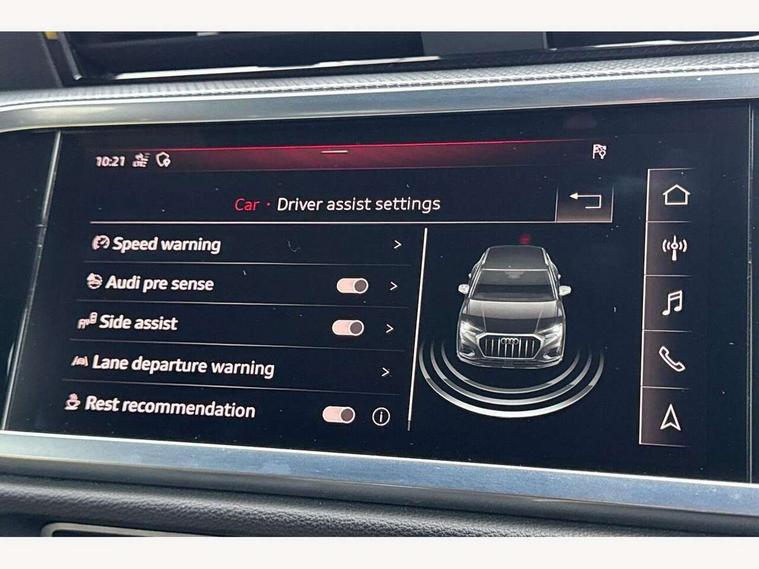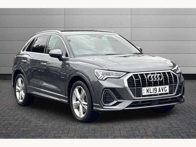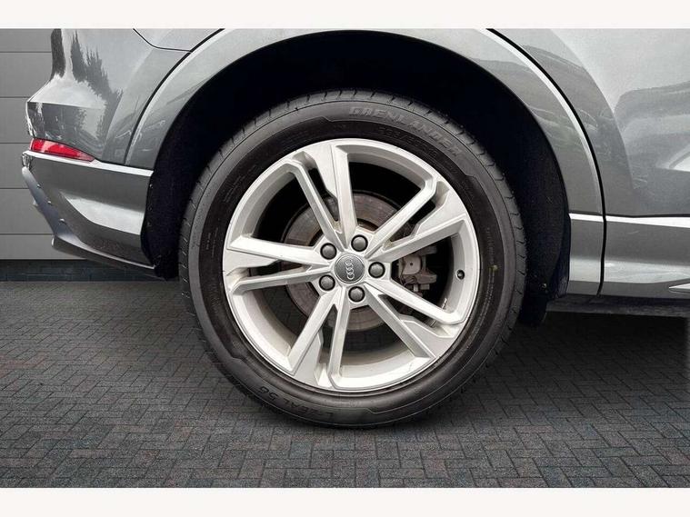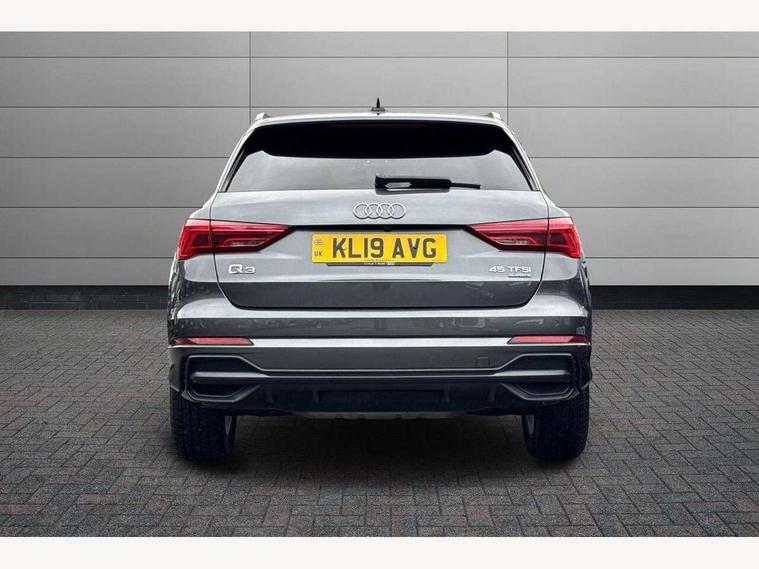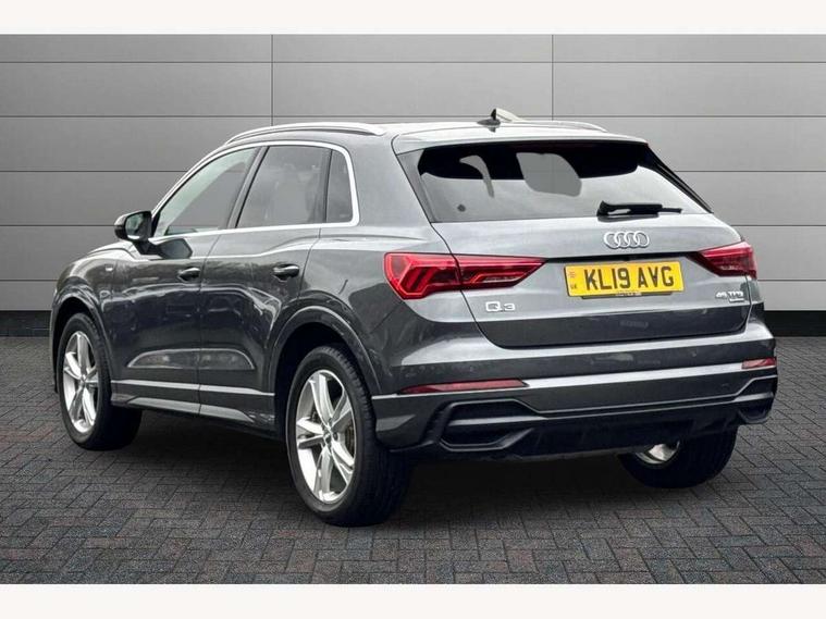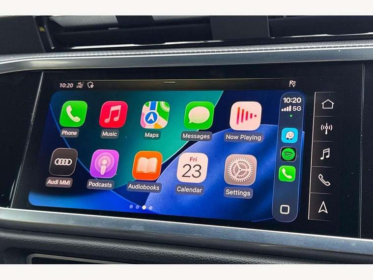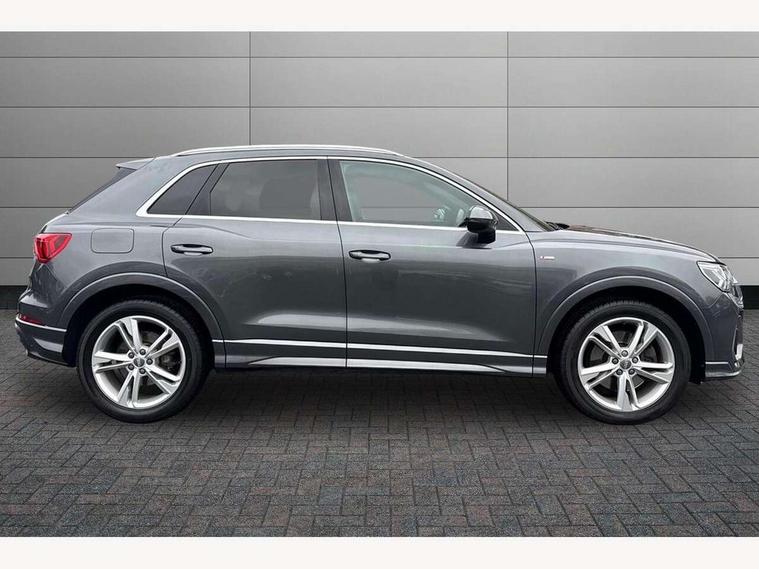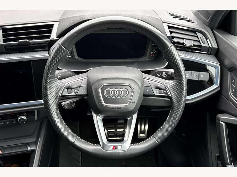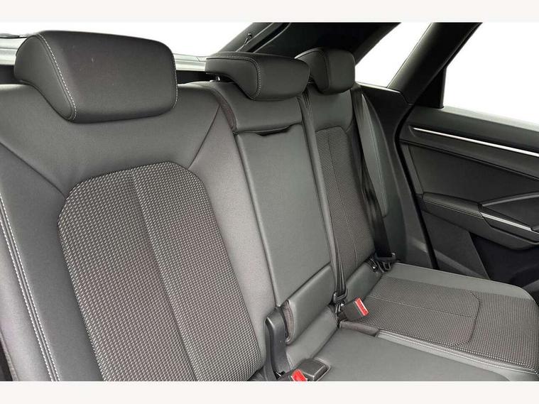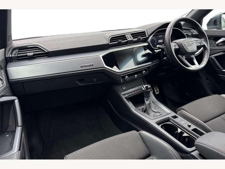 Audi connect safety and service (e-call), Audi drive select, Audi lane departure warning, Audi side assist, Audi smartphone interface, Bluetooth interface, Camera based traffic sign recognition, MMI navigation plus with MMI touch, Power opening/closing tailgate, Progressive steering, Rear parking sensors, Service interval indicator, Stop/start system, Voice control system, Sports suspension, 1 x USB type C and 1 USB type A charging points, 6 speakers, DAB digital radio module, Acoustic windscreen, Aluminium roof rails, Aluminium window trim, Auto dimming rear view mirror, Body coloured bumpers, Diffuser in matt Platinum grey, Electrically adjustable and heated door mirrors with integrated LED side indicators, Front and rear electric windows, Front fog lights, Front side air inlets in matt platinum grey, Front spoiler blade in matt platinum grey, Grille vertical bars in aluminium silver/Matt, High gloss black finish B and C pillars, LED headlights with LED daytime running lights and dynamic rear indicator, LED rear lights, Privacy glass, Rain and light sensors, Rear diffuser strip in matt titanium black, S Line badge on wings, S Line front and rear bumpers, Side skirt insert in matt Platinium grey, Titanium black radiator grille, 12V socket in rear centre console, 40:20:40 split folding rear bench seat, Adjustable rear seat bench/backrest with centre armrest and cupholder, Aluminium door sill trims, Black cloth headlining, Dual zone climate control, Front and rear black floor mats with contrast stitching in rock grey, Front and rear headrests, Front centre armrest with storage compartment and angle adjustment, Illuminated door sill trims with S logo, ISOFIX child seat mounting and Top Tether with front passenger airbag deactivation, Manual front seats with height adjustment, Perforated leather gearknob, Stainless steel luggage compartment sill finisher, Stainless steel pedals, Non smoking pack - Q3, 3x3 point rear seatbelts, 6 airbags - Driver, front passenger, curtain and side windows, Electrically operated child locks on rear doors, Electromechanical parking brake, Electronic stabilisation control including ABS, ASR and EDL, Hill hold assist, Pre sense basic, Seatbelt monitoring, Tyre pressure warning, Warning triangle and first aid kit, Anti theft alarm, Anti theft wheel bolts, Audi pre-sense front with pedestrain and cyclist recognition, Remote central locking, Dark matt brushed aluminium inlay, MMI touch colour display in gloss black with aluminium surround,