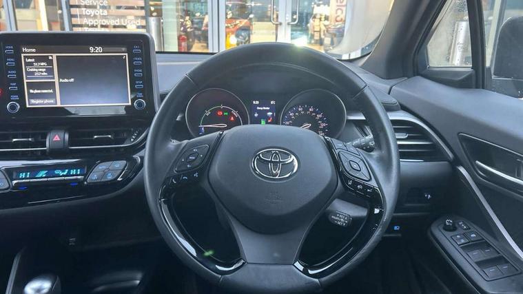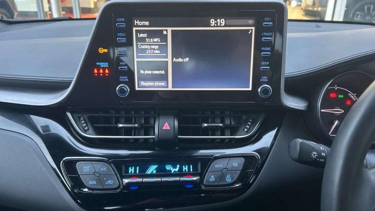 4.2" coloured TFT screen for multi-information display, Adaptive cruise control, Apple car play and Android auto, Bluetooth connectivity, E-call, Electric power steering, Hybrid system indicator, Lane departure alert with steering control, Lane trace assist, Push button start, Push button tailgate release, Remote boot door release in cabin, Remote boot door release in key, Reversing camera, Road sign assist - RSA, Smart voice assist, Trip computer, Voice recognition, Vehicle Stability Control (VSC), 6 speakers, AM/FM radio, DAB Radio (Digital Audio Broadcasting), Toyota touch 2 multimedia system with 8" display, USB connector, Wi-fi connectivity, Anti-jam protection on power windows, Auto high beam, Auto up and down function on all power windows, Automatic headlights, Automatic headlights cut-off, Black and body coloured rear bumper, Black lower front grille, Black upper front grille, Body colour door handles, Body colour door mirrors, Body colour front spoiler lip, Body coloured front bumper, Boot door release with push button, Electric heated door mirrors, Follow me home headlights, Front and rear power windows, Front fog lights, Headlight cut off reminder, Honeycomb lower front grille, LED daytime running lights, LED High mounted stop light, LED rear brake lights, LED rear combination lights, Manual headlight levelling, Manually retractable door mirrors, Noise reduction layer on front windows and windscreen, Power adjustable door mirrors, Rear side wing doors, Rear spoiler, Rear tailgate, Rear window defogger, Rear window wiper, Reflective LED headlights, Shark fin antenna, UV-filter on driver and passenger windows, UV-filter on rear windows, Variable front intermittent wipers, 12v power outlet - front, 3 rear headrests, 3 seat bench in 2nd row, 3 spoke leather steering wheel, 60/40 split folding 2nd row rear seats, Adjustable rear headrests, Adjustable speed limiter switch on steering wheel, Assist grips front and centre pillar, Audio and telephone switches on steering wheel, Black front door assist grips, Boot light, Chrome interior door handles, Cloth upholstery, Driver and front passenger personal light, Driver and front passenger Whiplash Injury Lessening seats, Dual zone automatic air conditioning, Floor mats, Front cupholders, Front head restraints, Front sports seats, Glovebox with internal light, Hard tonneau cover, Hooks for luggage holding net, Humidifying Nanoe air purifier, Illuminated entry system, Isofix attachments on outer rear seats, Leather gearshift, Light on driver sun visor, Light on passenger sun visor, Manual telescopic steering wheel, Manual tilt steering wheel, Manually adjustable lumbar support on driver seat, Manually height adjustable driver seat, Manually height adjustable front passenger seat, Manually reclining driver seat, Manually reclining front passenger seat, Manually sliding driver seat, Manually sliding front passenger seat, Microphone on front personal light, Mirror on driver sun visor, Mirror on passenger sun visor, Multimedia switches on steering wheel, Pollen filter, Shopping bag hooks, Single front passenger seat, Slow opening on lower glovebox, Voice recognition switch on steering wheel, 16 Disk front wheel brake, 3x3 point rear seatbelts, ABS+EBD+Brake assist, Electronic parking brake, Front and rear seatbelt reminder, Front passenger airbag on/off switch, Hill start assist control (HAC), Pre collision system with pedestrian detection, Pre-tensioners and force limiters, Rear door child safety locks, SRS Airbags - Driver + Front passenger, front side, front and rear curtain and driver's knee airbags, Toyota safety sense, Tyre pressure monitoring system, Tyre pressure warning system, Acoustic vehicle alert system (AVAS), Glass-breaking alarm sensors, Immobiliser, Intrusion alarm, Intrusion sensor, Motion sensor alarm, Power door locks, Power passenger window lock, Remote central locking, Black lower dashboard, Black upper dashboard, Grey deco line on upper dashboard, Matte black centre console, Tyre repair kit,