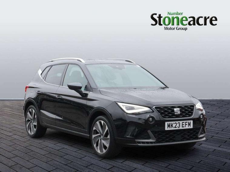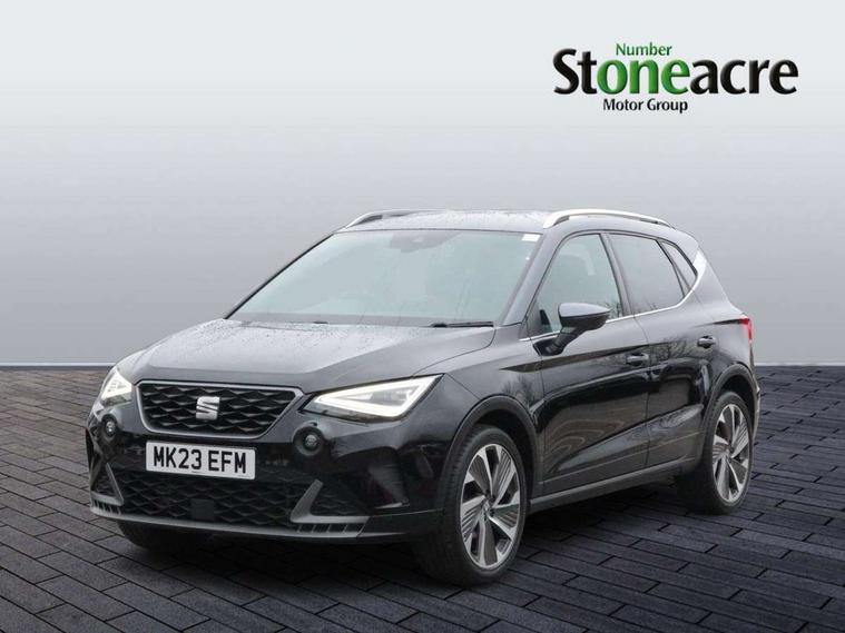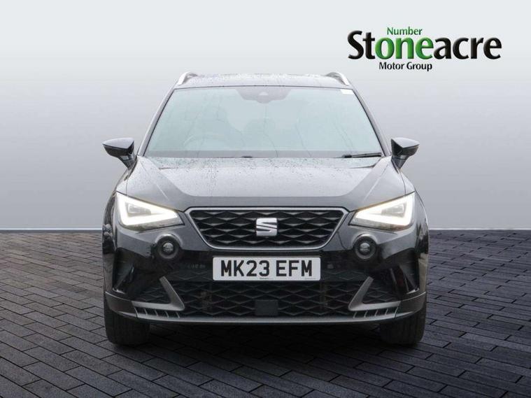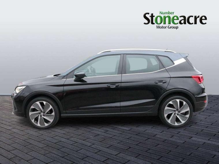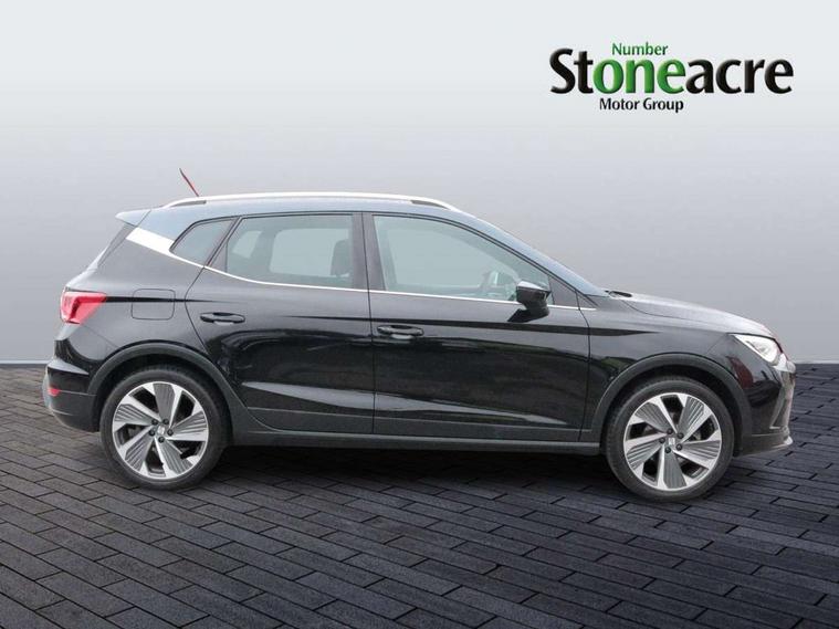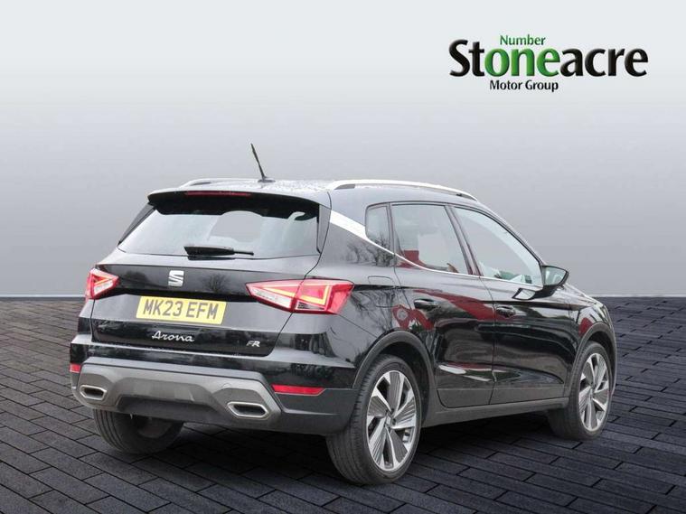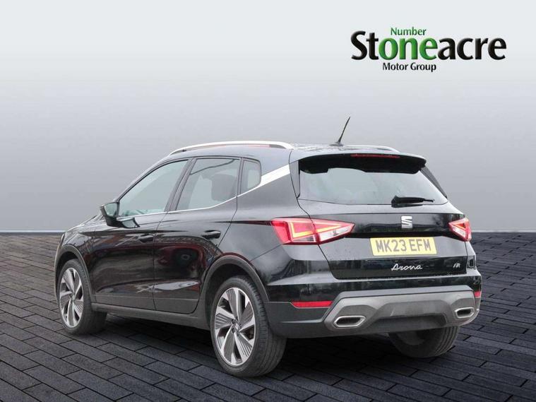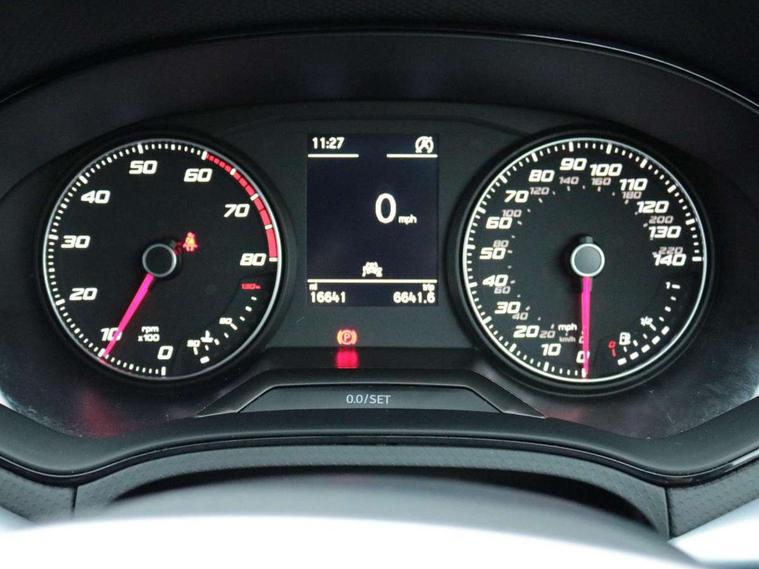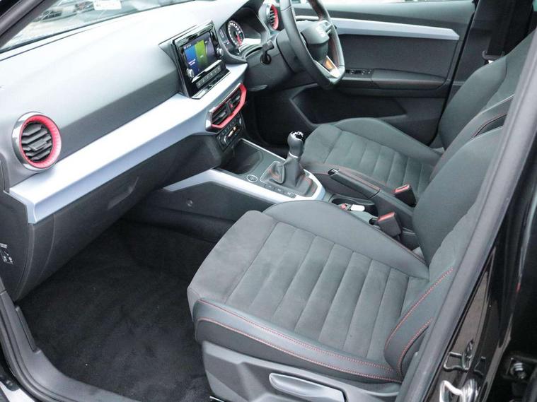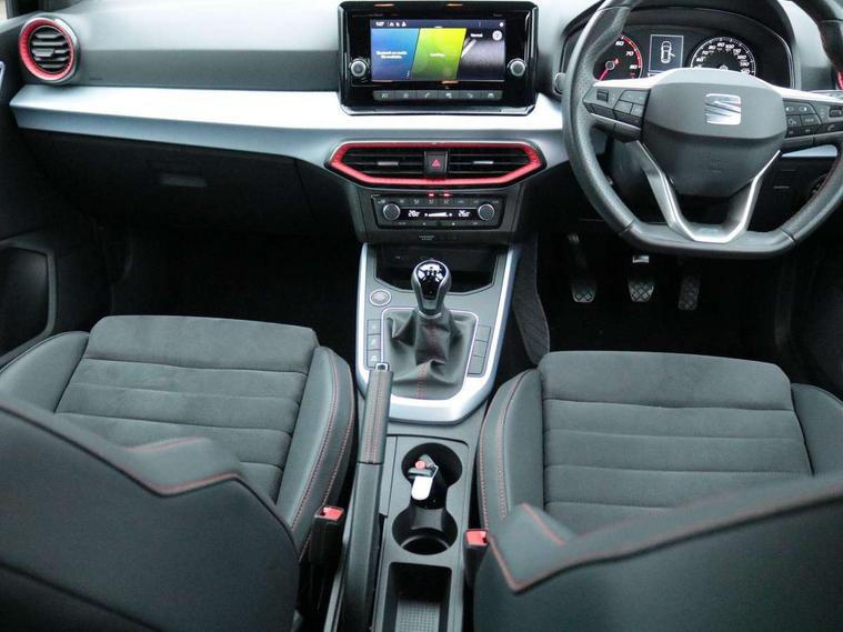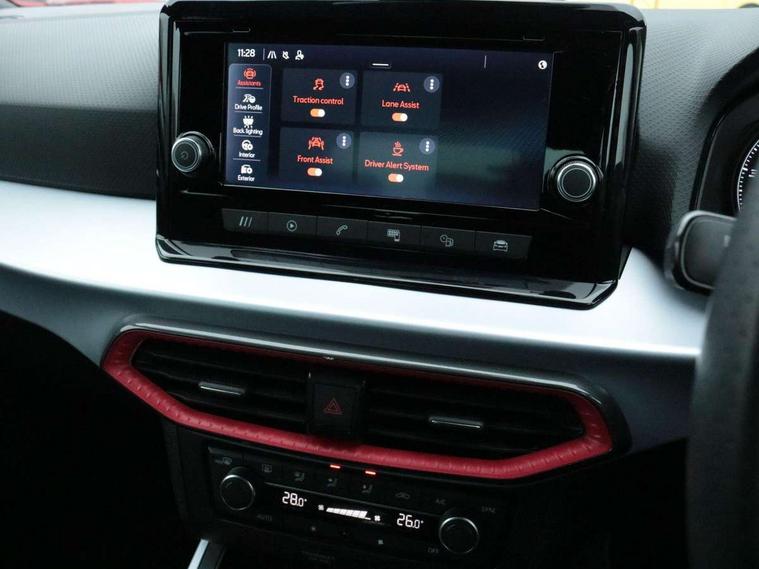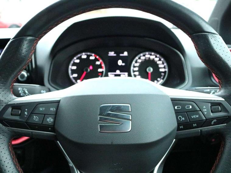 'Lights On' Reminder warning buzzer, Analogue cockpit with physical dials, Digital clock, E-call, Electric speed sensitive power steering, Full Link Smartphone Integration with Mirror Link, Apple Car Play, Google Android Auto with USB Type C cable for Apple and Android compatibility, Lane keeping system, Low fuel warning light, Outside temperature display, Rear parking sensor, RPM counter, Seat connect with safety, service and remote, SEAT Drive profile - Four different models normal-sport-eco-individual, steering response, throttle response, Trip computer, Wireless phone charger, Bluetooth interface for hands free and audio streaming, DAB digital radio and AM/FM radio, Media system with 8.25" colour touchscreen with USB port (type c), Steering wheel mounted audio controls, Anti theft roof antenna, Automatic activation of hazard warning lights, Body coloured bumpers, Body coloured door handle inserts, Chrome roof rails and window surrounds, Dark tinted rear windows, Dimming rear view mirror, Electric front/rear windows, Electrically adjustable and heated door mirrors, Front fog lights with cornering function and rear fog light, FULL LED automatic headlights with dynamic headlight range control, coming and leaving home, LED daytime running lights, LED rear tail lights and licence plate lights, Protective side mouldings, Rear side wing doors, Rear spoiler, Rear window wash/wipe, Roof colour door mirrors, Third brake light, Twin exhaust pipe styling hidden exhaust pipe, Visible VIN plate, Windshield wiper with intermittent control and potentiometer, 2 cupholders, 3 seat bench in 2nd row, 60/40 split folding rear seat, Aircare filter, Black interior roof, Double boot floor, Driver sunvisor with covered mirror + card holder, Dual zone climate control, Front comfort seats, Front courtesy light with 2x front and 2x rear reading lights, Gear shift indicator, Height adjustable front seats, Height/reach adjustable steering column, Illuminated boot, Instrument lighting with brightness control, Interior ambient lighting, Interior light in footwell, central console and door panel, ISOFIX points in outer rear seats with top tether anchorage points, Microsuede cloth upholstery, Passenger sunvisor with vanity mirror, Perforated flat bottomed leather steering wheel/gear knob/handbrake with red stitching and FR logo, Single front passenger seat, Two front and three rear height adjustable headrests, Interior chrome pack - Arona, 3 point seatbelts on all rear seats, ABS, Active front headrests, Child locks on rear doors, Driver and front passenger airbags with front passenger airbag de activation, front side and curtain airbags, Electronic stability control, Emergency Brake Assist (EBA) and front assist, Front and rear seatbelt reminder, Hill hold control, Multi-Collision braking, Tiredness recognition system, Traction control, Tyre pressure monitoring system, Alarm with back-up horn, Electronic engine immobiliser, KESSY Keyless entry and go, Locking wheel bolts, Remote central locking + deadlocks, Tow away protection, Titan black dashboard,