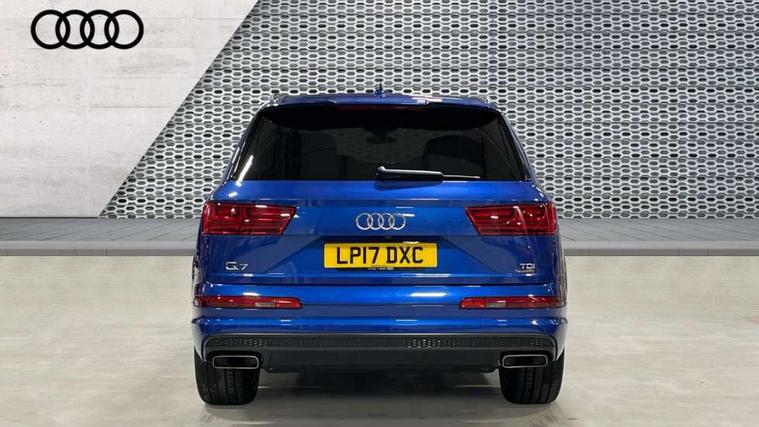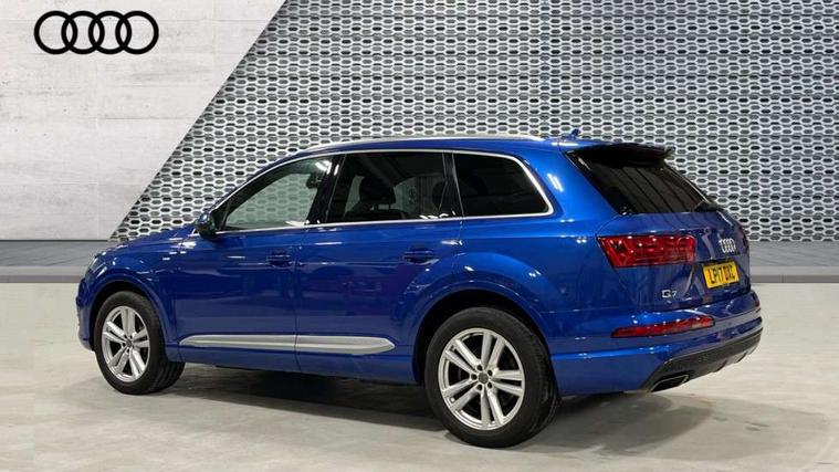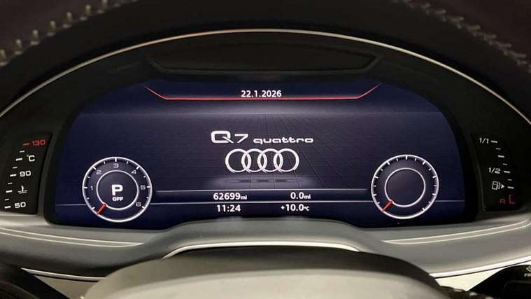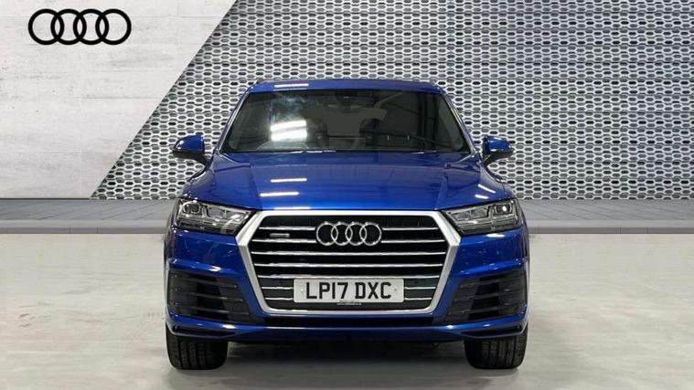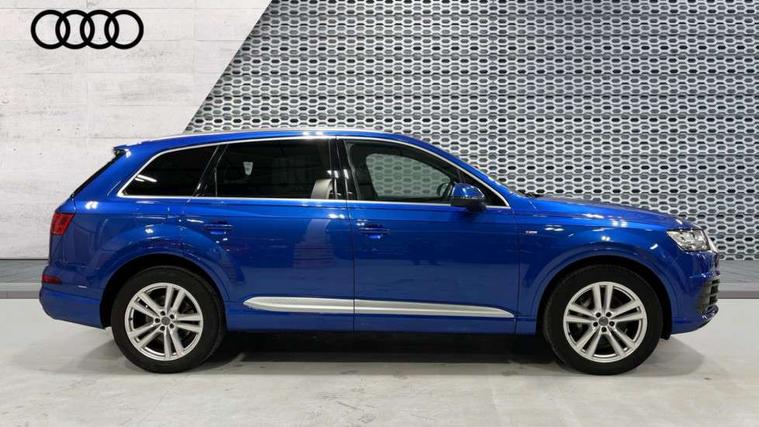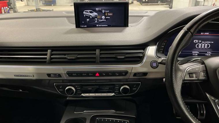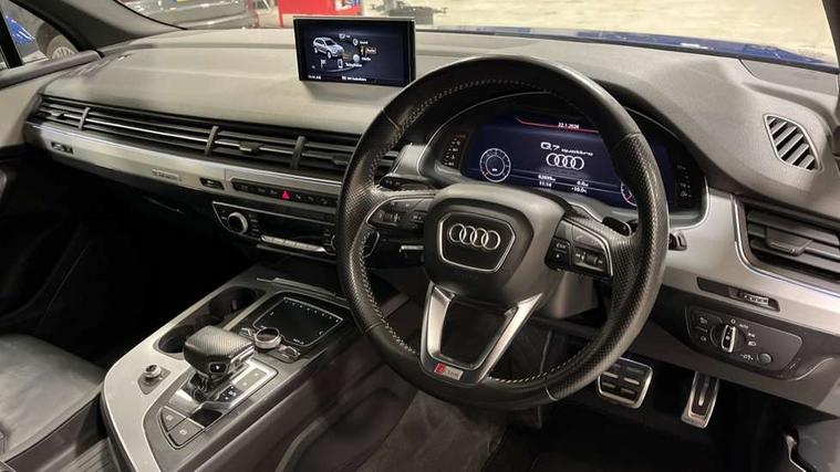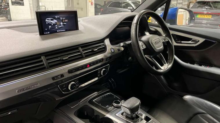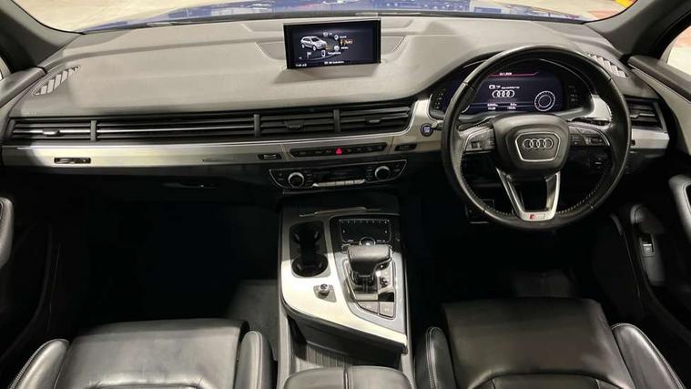 Audi drive select, Audi smartphone interface, MMI - Multi Media Interface control system, MMI navigation plus with touch and 8" colour display, DVD, SD card reader, 10GB music storage, Mobile phone preparation with bluetooth interface, Remote electric boot opening/closing, Service interval indicator, Servotronic speed related PAS, Speed limiter, Voice control system, 2 USB ports, Audi music interface, Aux-in socket, CD player, DAB digital radio module, MMI radio plus, Acoustic windscreen, Auto dimming rear view mirror, Body coloured bumpers, Dynamic rear indicators, Electric front+rear windows, Headlight washers, High beam assist, LED daytime running lights, LED tail lights, Loading sill protector in stainless steel, Platinum grey front lip spoiler, Rain and light sensors, Rear wiper, Roof spoiler, S Line body styling, 2 cupholders in front centre console, 35/30/35 split fold 2nd row seats, 4 way electrically adjustable lumbar support for drivers seat, 4 way electrically adjustable lumbar support for front passenger seat, Door sill trims with S line logo, Electric adjustable front seats, Four zone electronic climate control, Front ashtray and cigar lighter, Front centre comfort armrest with storage + cupholders, Front head restraints, Front sports seats, Gearshift paddles, Heated front seats, ISOFIX on front passenger and rear outer seats, Leather gear knob, Rear centre armrest with 2 cupholders, Rear headrests, Stainless steel pedals, Sunvisors with illuminated vanity mirrors, Top tether anchor plate for isofix child seat, Interior light pack - Q7, 3 point seatbelts on all seats, ABS+Electronic Brake force Distribution, Curtain airbags, Driver and passenger airbags, EDL + ASR, Electrically operated child locks on rear doors, Electromechanical parking brake, ESP, Front passenger airbag deactivation, Front side airbags, Hill descent control, Hill hold assist, Seatbelt warning, Traction control, Tyre pressure monitoring system, Warning triangle and first aid kit, Alarm with interior monitoring, Immobiliser, Keyless Go access/ignition system, Locking wheel bolts, Remote central locking, Chrome door inserts,