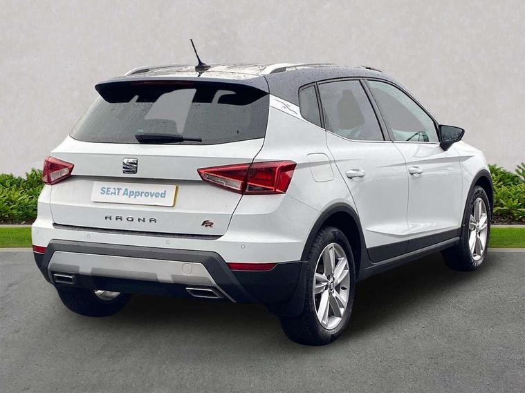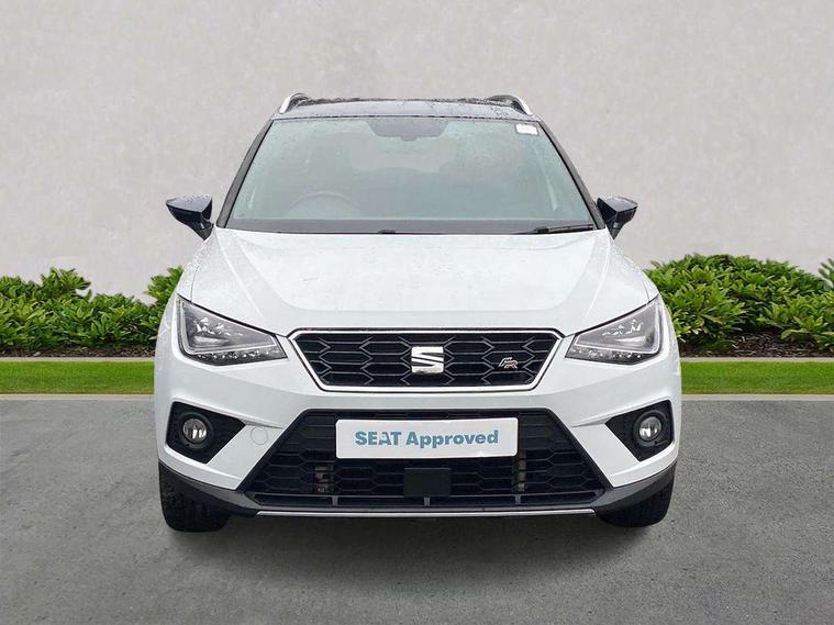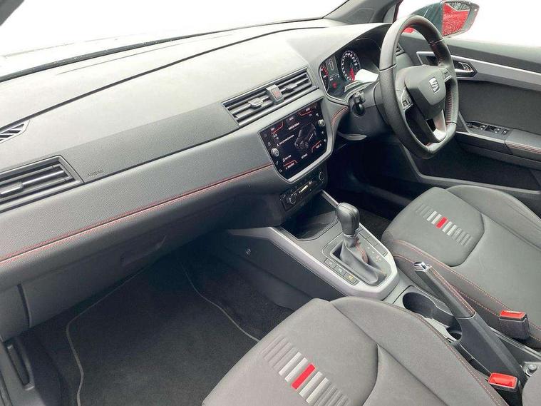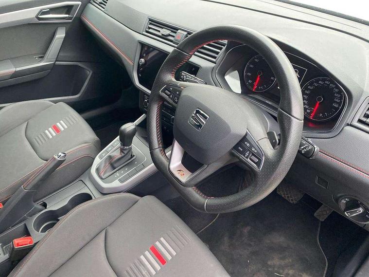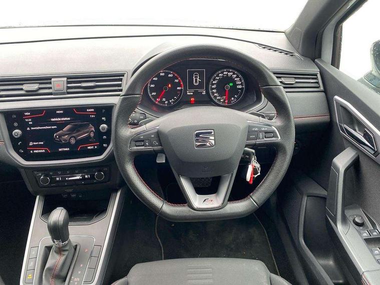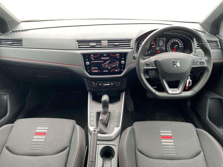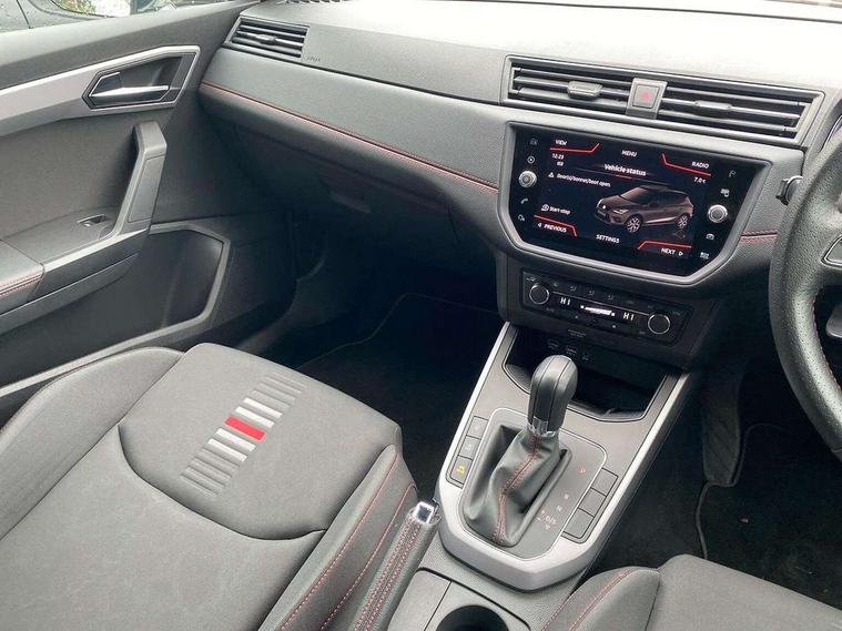 'Lights On' Reminder warning buzzer, Cruise control, Digital clock, Electric speed sensitive power steering, Front assistant collision mitigation, Full Link Smartphone Integration with Mirror Link, Apple Car Play, Google Android Auto, Low fuel warning light, Outside temperature display, Rear parking sensor, RPM counter, SEAT Drive profile, Trip computer, Sports suspension, 6 speakers, Bluetooth interface for hands free and audio streaming, DAB Digital radio, SEAT USB media cable, Steering wheel mounted audio controls, Anti theft roof antenna, Auto dimming interior rear view mirror, Automatic activation of hazard warning lights, Automatic headlights, Body coloured bumpers, Body coloured door handle inserts, Chrome grille surround, Chrome roof rails, Chrome window surround, Coming/leaving home lighting function, Dark tinted rear windows, Electric front/rear windows with one touch/auto up/down, Electrically adjustable and heated door mirrors, Electrically folding wing mirrors, Front fog lights, Full LED headlights, LED daytime running lights, LED licence plate lighting, LED tail lights, Rain sensor windscreen wipers, Rear fog lights, Rear window wash/wipe, Roof colour door mirrors, Twin exhaust pipes, Visible VIN plate, Windshield wiper with intermittent control and potentiometer, 2 cupholders, 3 rear height adjustable headrests, 60/40 split folding rear seat, Active head restraints, Ambient interior lighting, Card holder, Double boot floor, Driver and passenger sunvisors, Driver/front passenger seat height adjustment, Dual zone climate control, Dust/pollen filter, Flat bottomed steering wheel, Footwell ambient lighting, Front courtesy lights, Front reading light, Gear shift indicator, Gearshift paddles on steering wheel, Height/reach adjustable steering column, Illuminated boot, Instrument lighting with brightness control, Isofix attachments on outer rear seats, Leather handbrake, Leather steering wheel and gear knob, Multi-colour ambient interior lighting, Nora cloth upholstery, Sports seats, Connectivity pack plus - Arona, 3 point seatbelts on all rear seats, ABS+EBA, Child locks on rear doors, Driver/Front Passenger airbags, Electronic stability control, Front and rear seatbelt reminder, Front side/curtain airbags, Height adjustable active front headrests, Hill hold control + Tyre Pressure monitor, Multi-Collision braking, Passenger airbag deactivate switch, Tiredness recognition system, Traction control, 2 folding remote keys with window open/close function, Alarm with back-up horn, Immobiliser, Locking wheel bolts, Remote central locking + deadlocks, Tow away protection, Interior chrome line trim, 17" Dynamic alloy wheels,