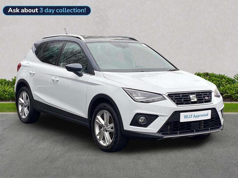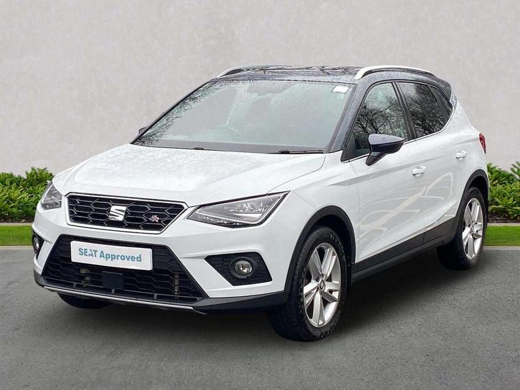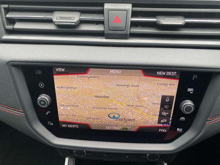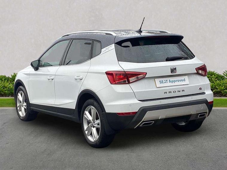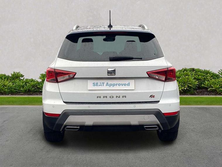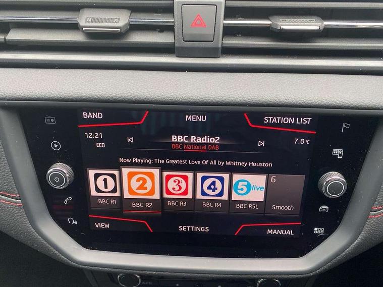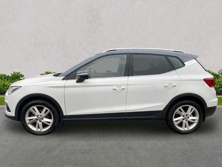 'Lights On' Reminder warning buzzer, Cruise control, Digital clock, Electric speed sensitive power steering, Front assistant collision mitigation, Full Link Smartphone Integration with Mirror Link, Apple Car Play, Google Android Auto, Low fuel warning light, Outside temperature display, Rear parking sensor, RPM counter, SEAT Drive profile, Trip computer, Sports suspension, 6 speakers, Bluetooth interface for hands free and audio streaming, DAB Digital radio, SEAT USB media cable, Steering wheel mounted audio controls, Anti theft roof antenna, Auto dimming interior rear view mirror, Automatic activation of hazard warning lights, Automatic headlights, Body coloured bumpers, Body coloured door handle inserts, Chrome grille surround, Chrome roof rails, Chrome window surround, Coming/leaving home lighting function, Dark tinted rear windows, Electric front/rear windows with one touch/auto up/down, Electrically adjustable and heated door mirrors, Electrically folding wing mirrors, Front fog lights, Full LED headlights, LED daytime running lights, LED licence plate lighting, LED tail lights, Rain sensor windscreen wipers, Rear fog lights, Rear window wash/wipe, Roof colour door mirrors, Twin exhaust pipes, Visible VIN plate, Windshield wiper with intermittent control and potentiometer, 2 cupholders, 3 rear height adjustable headrests, 60/40 split folding rear seat, Active head restraints, Ambient interior lighting, Card holder, Double boot floor, Driver and passenger sunvisors, Driver/front passenger seat height adjustment, Dual zone climate control, Dust/pollen filter, Flat bottomed steering wheel, Footwell ambient lighting, Front courtesy lights, Front reading light, Gear shift indicator, Gearshift paddles on steering wheel, Height/reach adjustable steering column, Illuminated boot, Instrument lighting with brightness control, Isofix attachments on outer rear seats, Leather handbrake, Leather steering wheel and gear knob, Multi-colour ambient interior lighting, Nora cloth upholstery, Sports seats, Connectivity pack plus - Arona, 3 point seatbelts on all rear seats, ABS+EBA, Child locks on rear doors, Driver/Front Passenger airbags, Electronic stability control, Front and rear seatbelt reminder, Front side/curtain airbags, Height adjustable active front headrests, Hill hold control + Tyre Pressure monitor, Multi-Collision braking, Passenger airbag deactivate switch, Tiredness recognition system, Traction control, 2 folding remote keys with window open/close function, Alarm with back-up horn, Immobiliser, Locking wheel bolts, Remote central locking + deadlocks, Tow away protection, Interior chrome line trim, 17" Dynamic alloy wheels,