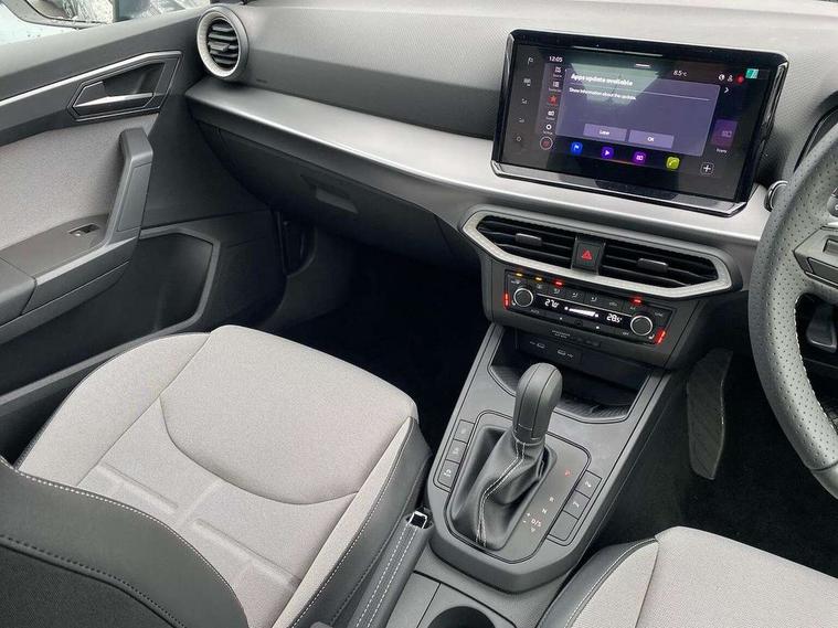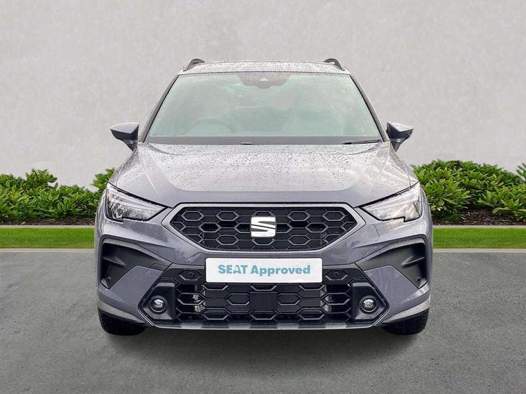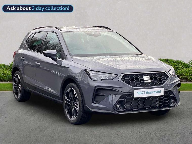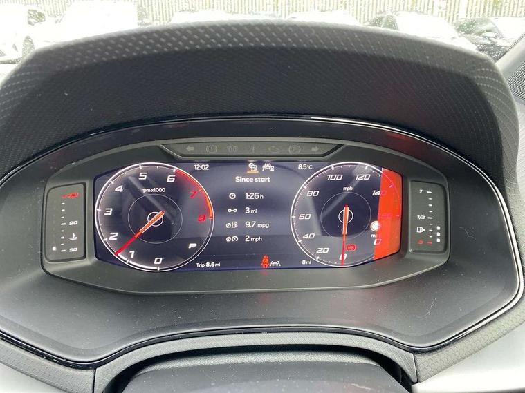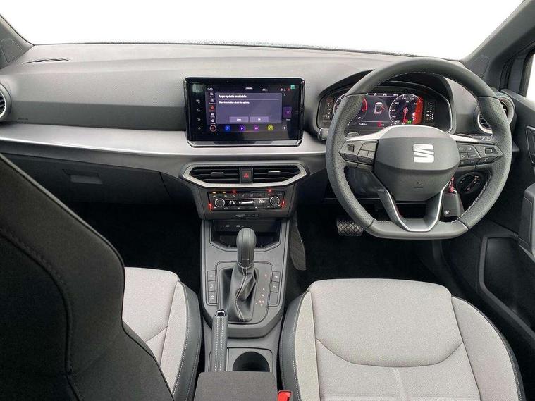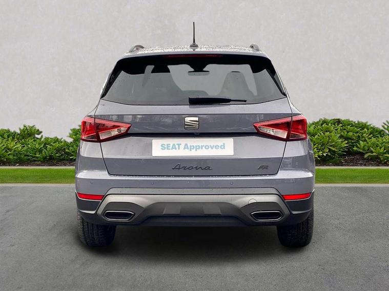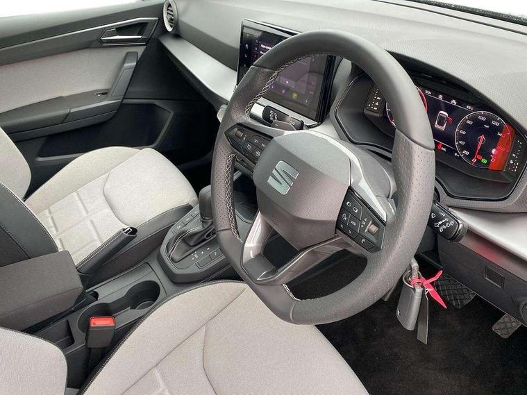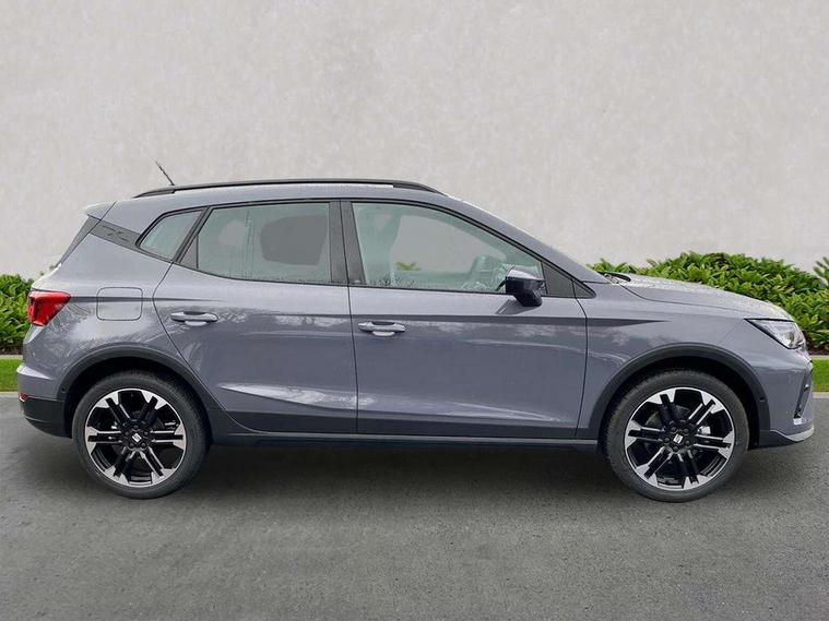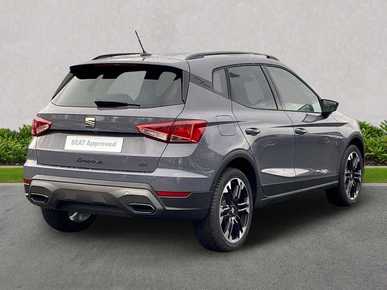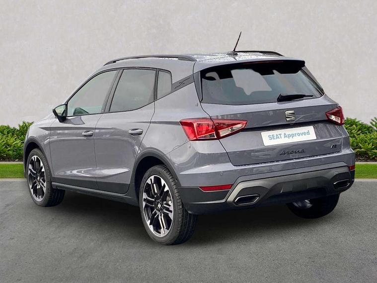 'Lights On' Reminder warning buzzer, 10" Digital cockpit, Digital clock, E-call, Electric speed sensitive power steering, Front parking sensors, Full link smartphone integration with mirror link, wireless apple carplay, Google android auto + USB Type C cable for apple and android devices, Low fuel warning light, Outside temperature display, Rear view camera, RPM counter, SEAT Drive profile - Four different models normal-sport-eco-individual, steering response, throttle response and gear shifts mode, Trip computer, Wireless phone charger, 9.2" colour touchscreen with navigation system, voice control and USB port (type c), Bluetooth interface for hands free and audio streaming, DAB digital radio and AM/FM radio, Steering wheel mounted audio controls, Anti theft roof antenna, Auto dimming interior rear view mirror, Automatic activation of hazard warning lights, Black roof rails and window surrounds, Body coloured bumpers, Body coloured door handle inserts, Dark tinted rear windows, Electric front/rear windows, Electrically adjustable, heated and folding door mirrors, Front fog lights with cornering function and rear fog light, LED 3rd brake light, LED daytime running lights, LED rear tail lights and licence plate lights, Protective side mouldings, Rain sensing wipers, Rear side wing doors, Rear spoiler, Rear window wash/wipe, Roof colour door mirrors, SEAT design Full LED automatic headlamps with dynamic headlight range control, coming and leaving home feature, Twin exhaust pipe styling with double flow exhaust pipe, Visible VIN plate, 2 cupholders, 3 seat bench in 2nd row, 60/40 split folding rear seat, Aircare filter, Black headliner, Cloth upholstery with embossed textile/Sport bucket seats, Double boot floor, Driver sunvisor with covered mirror + card holder, Dual zone climate control, Front courtesy light with front reading lights, Front seat back storage pockets, Heated front seats, Height adjustable front seats, Height/reach adjustable steering column, Illuminated air vent surrounds, Interior ambient lighting, Interior light in footwell, central console and door panel, ISOFIX points in outer rear seats with top tether anchorage points, Passenger sunvisor with vanity mirror, Perforated flat bottomed leather steering wheel/gear knob/handbrake with red stitching and FR logo, Red coloured interior air vents, Single front passenger seat, Steering wheel mounted gearshift paddles, Two front and three rear height adjustable headrests, Interior chrome pack - Arona, Safe and driving pack (S) - Arona, Storage pack - Arona, 3 point seatbelts on all rear seats, ABS, Active front headrests, Child locks on rear doors, Driver and front passenger airbags with front passenger airbag de activation, front side and curtain airbags, Emergency Brake Assist (EBA) and front assist, Front and rear seatbelt reminder, Hill hold control, Multi-Collision braking, Tiredness recognition system, Traction control, Tyre pressure monitoring system, Anti-theft alarm (perimeter and interior monitoring) with backup horn and towing protection, Central locking with radio remote control, interior controls and SAFELOCK, Deadlock, Electronic engine immobiliser, KESSY Keyless entry and go, Locking wheel bolts, 18" Performance machined alloy wheels in black,