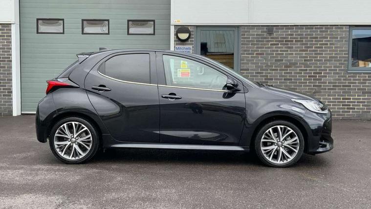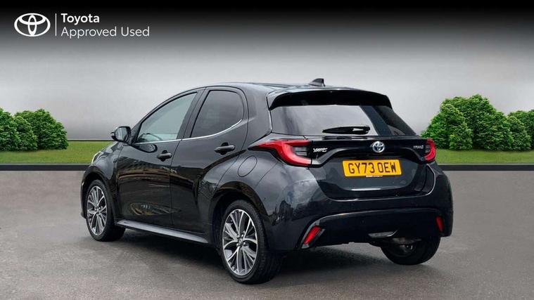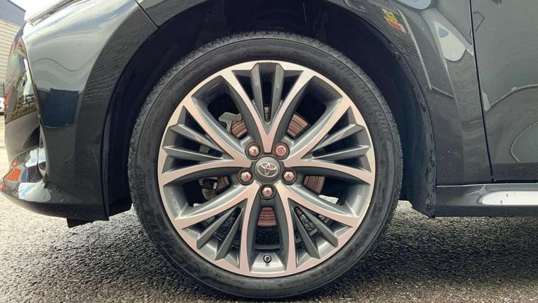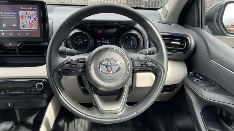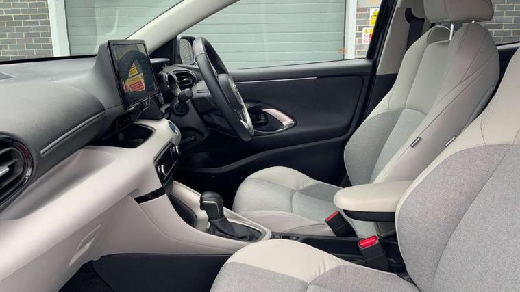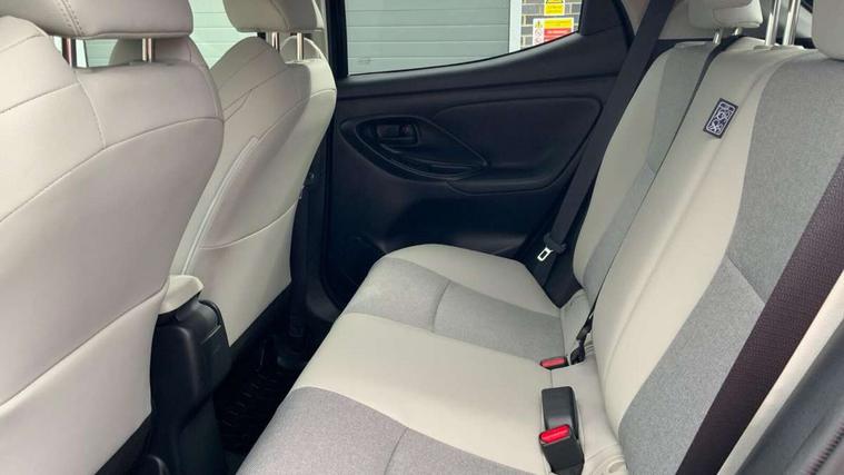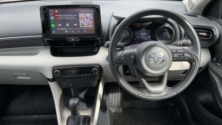 Adaptive cruise control, Adjustable speed limit with speed warning, Blind spot monitoring, Bluetooth connectivity, Colour binocular inspired displays with digital speedometer, E-call, Electric power steering, Hybrid energy display, Multi information display switches on steering wheel, Reversing camera, Smartphone integration with Apple CarPlay and Android auto, Tailgate, Touch 2 navigation system, Voice recognition, Vehicle Stability Control (VSC), 6 speakers, 9" HD multimedia display touch screen with Toyota smart connect, USB connection, Acoustic windscreen glass, Auto windscreen wipers, Automatic headlights, Automatically retractable door mirrors, Body coloured door mirrors, Electric adjustable heated door mirrors, Follow me home headlights, Front auto power windows with anti jam protection, Full LED rear lights, LED daytime running lights, LED front fog lights, LED front light guide, LED Headlights, LED High mounted stop lamp, LED Indicators, LED rear light guide, Manual headlight levelling, Painted chequered front grille, Rain sensor, Rear auto power windows with anti jam protection, Rear privacy glass, Rear side wing doors, Rear spoiler, Rear wiper, Satin lower front grille, Shark fin antenna, Turning signal integrated indicators in door mirrors, Variable front intermittent wipers, 3 adjustable rear headrests, 3 seat bench in 2nd row, 3 spoke leather steering wheel, 60/40 split folding rear seat, Active headrests, Adjustable boot height, Coat hooks in rear grab handles, Cup holders (2 front & door), Data Communication Module (DCM) connected services, Dual zone automatic air conditioning, Fabric seat with partial synthetic leather upholstery, Front armrest, Front sport seats, Glovebox, Grey roof lining, Height adjustable driver's seat, Height adjustable passenger seat, Isofix seat fixing, Leather gearshift, Map pockets on the backs of the front seats, Pollen filter, Shopping bag hooks, Single front passenger seat, Tilt/telescopic steering column, Parking pack - Yaris, 3 point seatbelts on all rear seats, ABS+EBD+Brake assist, Electronic parking brake, Emergency brake light system (EBS), Front passenger airbag on/off switch, Front seatbelt reminder, Hill start assist control (HAC), Rear child proof door locks, Rear seat belt reminder, Supplemental Restraint System (SRS) 8 airbags: Driver & passenger's airbags, dual side curtain airbags, side impact airbags, front centre airbag, Toyota Safety Sense 2, Precollison + Night time Pedestrian & Cyclist Detection, Lane Trace Assist, Auto High Beam, Intelligent ACC & Road Sign Assist, Tyre pressure warning system, 2x Master key, Alarm/immobiliser, Keyless smart entry with push button start, Remote AC via MyT, Remote locking via MyT, Remote powered central double locking doors, Satin chrome interior styling, Soft touch instrument panel, Space saver spare wheel,