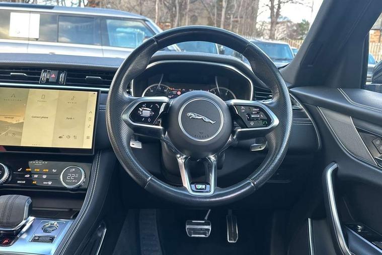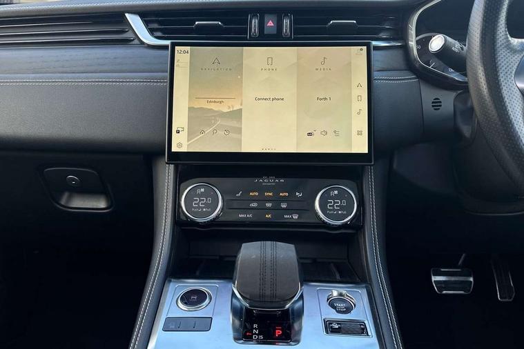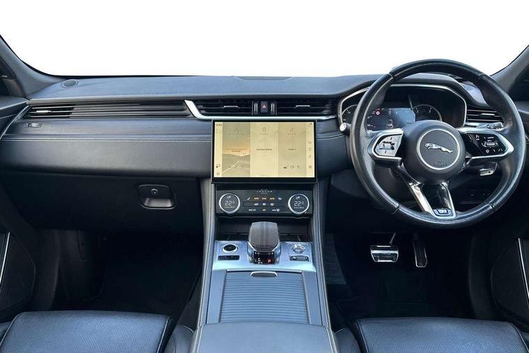11.4" touchscreen, Android Auto, Apple car play, Bluetooth connectivity, Driver alert system, Driver condition monitor, eCall emergency call system, Eco driving style assistant, Electric power assisted steering, InControl remote, Jaguar Toggle shift selector, Lane departure warning system, Lane keep assist, Outside temperature gauge, Personalisation profile management, Pivi pro connected navigation system with app interface and media storage, Pro services and wifi hotspot, Push button starter, Service interval indicator, Speed proportional steering, Start up sequence with movement in dials and lighting, Traffic sign recognition with adaptive speed limiter, Trip computer, Voice control system, 8 speed automatic transmission, All terrain progress control, All Wheel Drive (AWD), Open differential with torque vectoring by braking, AM/FM radio, Bluetooth streaming, DAB Radio (Digital Audio Broadcasting), Dynamic volume control, InControl apps, InControl protect, iPod integration, 3 flash lane change indicators, Animated directional indicators, Approach Illumination, Auto dimming rear view mirror, Automatic headlights, Electric windows with one touch open/close and anti trap, F-Pace and R Dynamic badge, Gloss black door mirrors, Gloss black roof rails, Green tinted glass, Heated front windscreen + heated washer jets, Heated rear window with timer, Jaguar script and leaper, LED High level third brake light, LED tail lights, Non acoustic front windscreen, Privacy glass, R Dynamic badge on side door, Rain sensor windscreen wipers, Rear fog lights, Rear metal tread plates, Rear side wing doors, Rear wiper, Trailer stability assist, Variable front intermittent wipers, 12V power point front, 3 rear headrests, 3 seat bench in 2nd row, Air distribution speed, Bright metal foot pedals, Centre armrest console, Centre console with side storage, Deletion loadspace storage rails, Door sill tread plates, Fold flat front seats, Front centre armrest with storage compartment, Front door storage space, Glovebox finisher with jaguar script, Heated steering wheel, Hooks in loadspace, Illuminated glovebox, Interior front door handles with separate locking switches, ISOFIX on outer rear seats, Jaguar sense, Luggage tie downs in loadspace, Mist sensing, Multifunction steering wheel, Overhead lighting console, Overhead stowage for sunglasses, Passive front head restraints, Premium cabin lighting, Premium carpet mats, R-Dynamic branded leather steering wheel, Rear air vents, Rear armrest with twin cupholders, Rear centre headrest, Rear door storage space, Reversible boot floor, Satin chrome gearshift paddles, Shopping bag hook, Single front passenger seat, Sunvisors with illuminated vanity mirrors, Twin front cupholders with cover, Black Exterior pack - F Pace R-Dynamic/Sport, Exterior pack - F Pace R-Dynamic, Online Pack with data plan - F-Pace, 355mm front brakes and 325mm rear brakes, 3x3 point rear seatbelts, ABS, All surface progress control (ASPC), Brake pad warning light, DSC - Dynamic Stability Control, Electric parking brake (EPB), Emergency brake assist, Front airbags with passenger seat occupant detector, Front and rear seatbelt reminder, Front side airbags, Full length side window curtain airbag, Hill launch assist, Power operated child locks, Torque vectoring brake, Traction control, Tyre pressure monitoring system, Immobiliser, Keyless start, Locking wheel nuts, Perimeter alarm, Remote central locking, Valet mode,