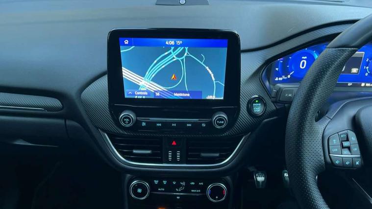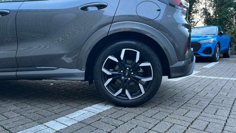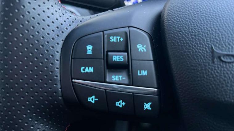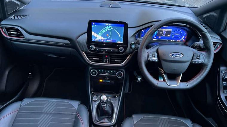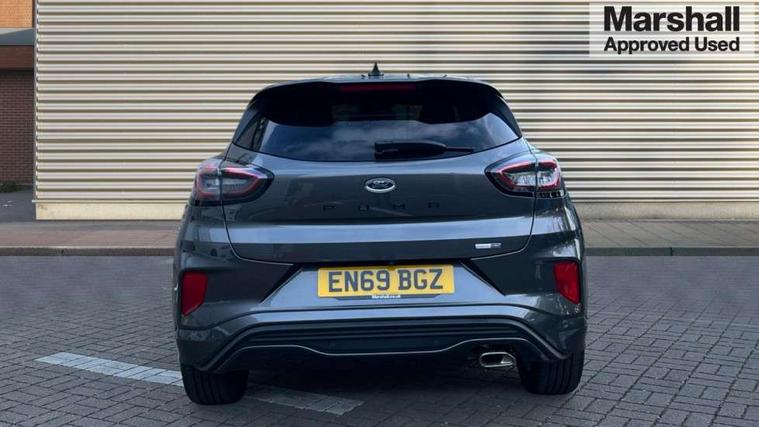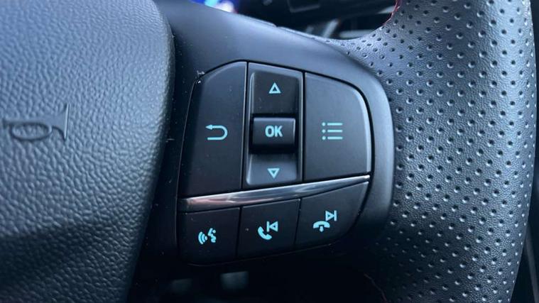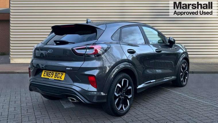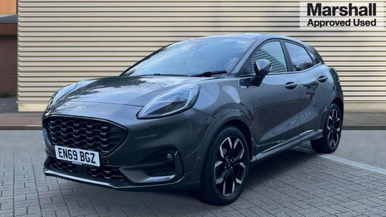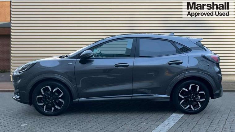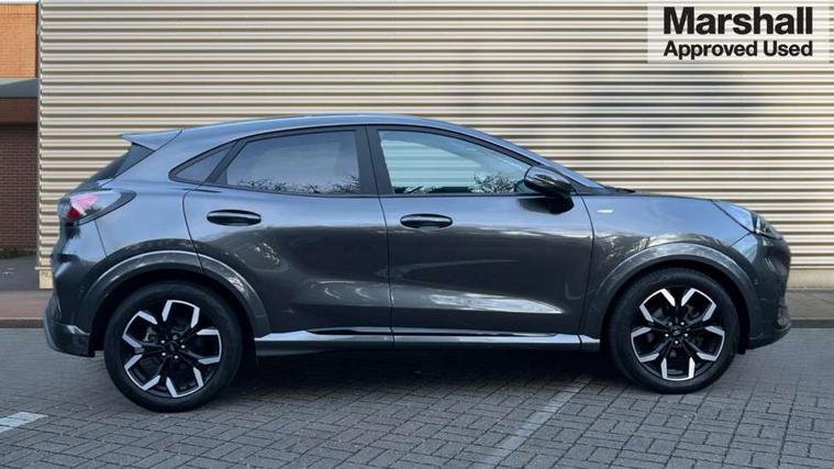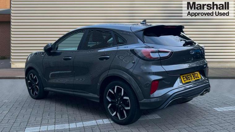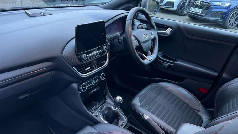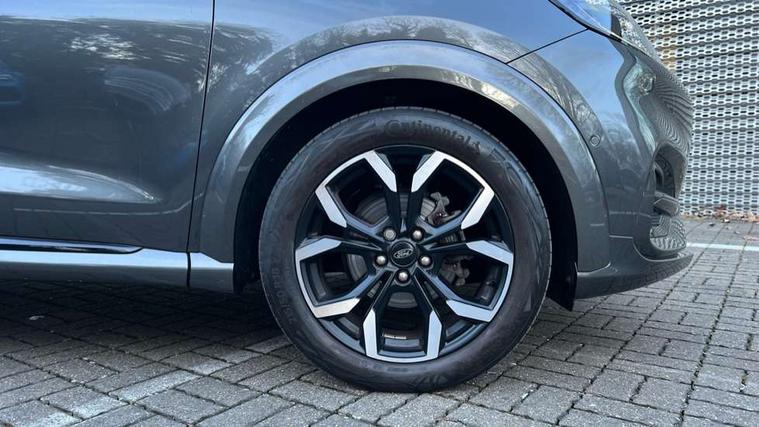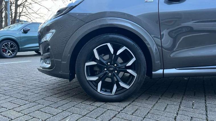 Ford easy fuel, Full digital 12.3" instrument cluster, Lane keeping aid with lane departure warning, Power liftgate hands free including keyless start + entry, motion sensing key fob, Rear parking sensor, Selectable drive modes(Normal, Eco, Sport, Slippery and Trail), Wireless charging pad, Automatic headlights with rain sensing wipers and auto high beam, Fixed LED headlamps, Front fog lights with cornering lights and LED rear lamps, Power foldable heated door mirrors with puddle lamps, Privacy glass to side rear windows and tailgate glass, Quickclear heated windscreen, ST-Line body kit with large rear spoiler wth sports suspension, Alloy sports pedals, Casual partial leather upholstery with salerno bolster, Centre console with armrest and stowage, Driver and passenger seat lumbar and height adjust, EATC - Electronic Auto Temperature control, Ford megabox extended bootspace, Front and rear floor mats, ST-Line flat bottomed leather steering wheel with leather handbrake and aluminium gear knob, B&O Premium Audio system + Ford SYNC 3 navigation pack - Puma, Driver assistance pack - Puma, 3 rear seatbelts, Electronic stability control (ESC) and hill start assist, Pre-collision assist with autonomous emergency braking, pedestrian/cyclist detection & post-collision braking, Tyre pressure monitoring system (TPMS), Thatcham alarm, Carbon look interior deco spears, 18" 5 spoke matt black machined finish alloy wheels, Tyre inflation kit,